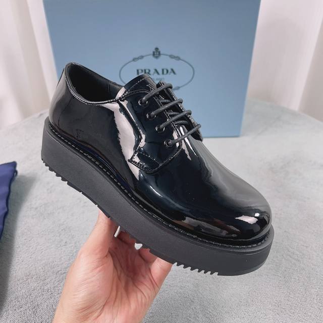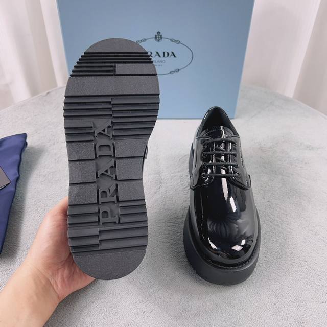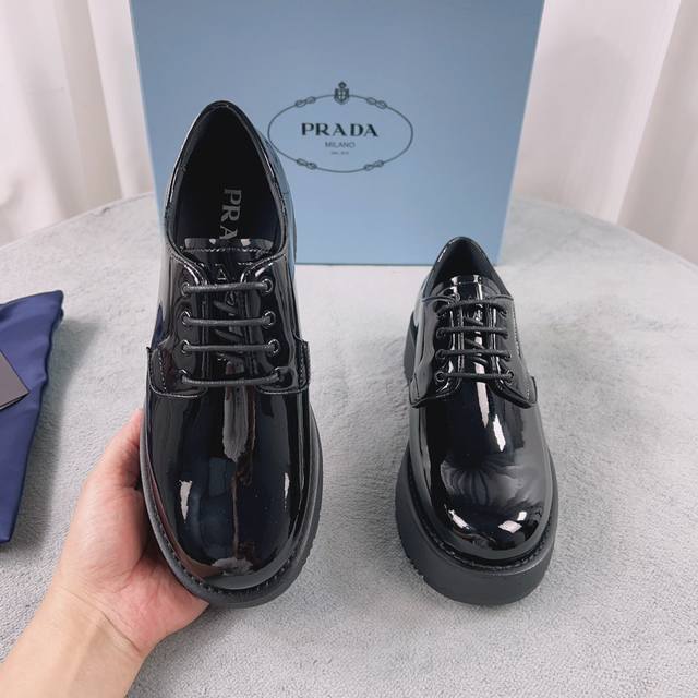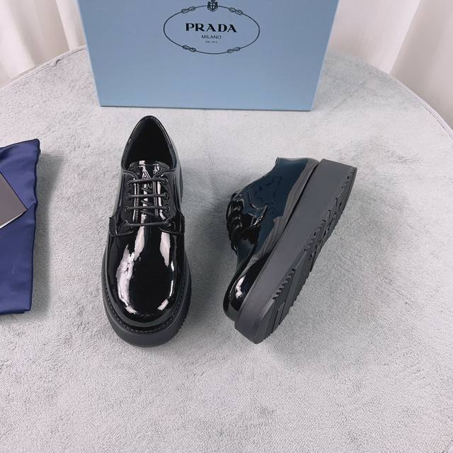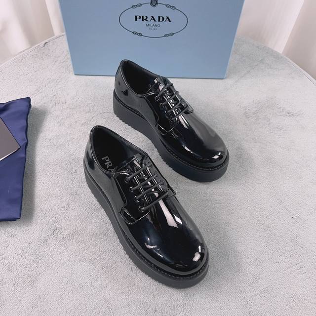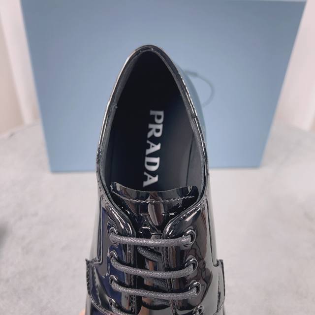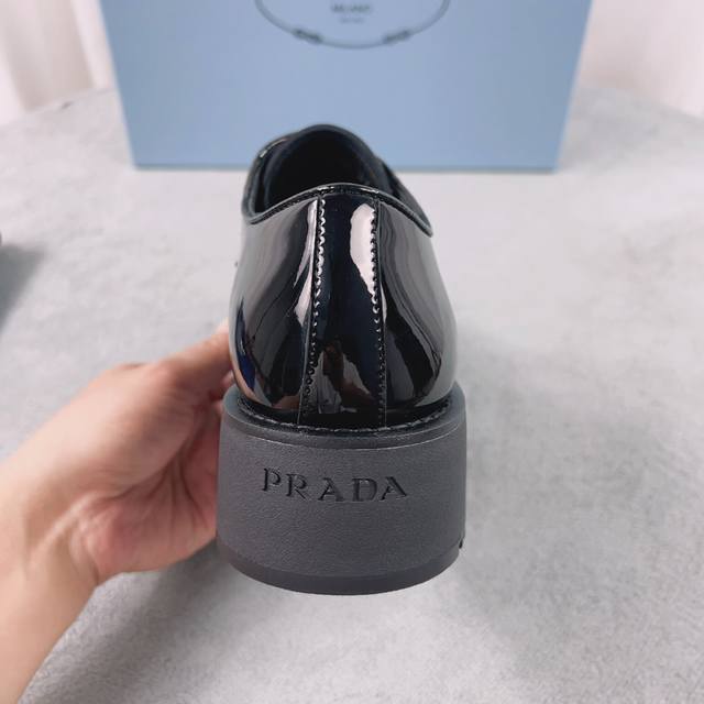 Prada New Loafers Upper: Imported split patent leather Lining: Mixed sheepskin Sole: Platform sole Heel height: 4cm Size: 35-41