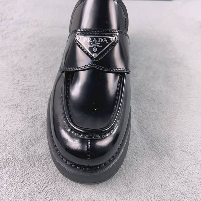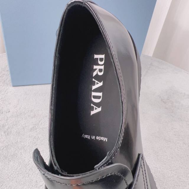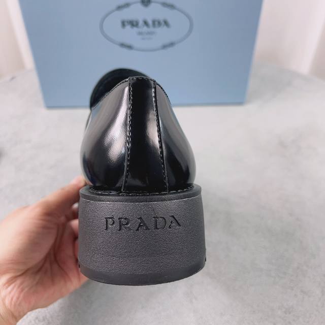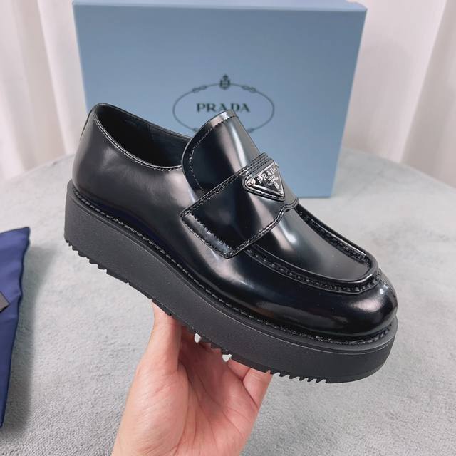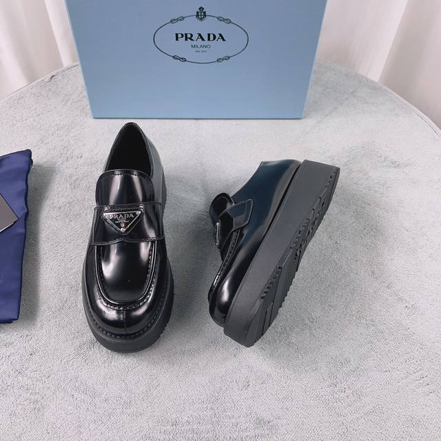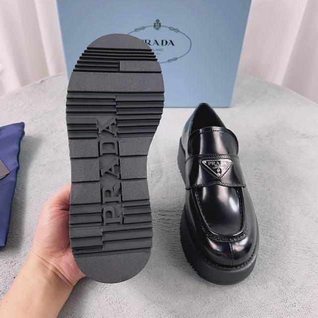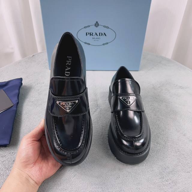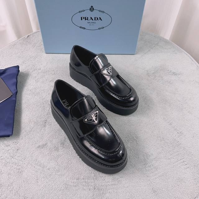 Prada New Loafers Upper: Imported split patent leather Lining: Mixed sheepskin Sole: Platform sole Heel height: 4cm Size: 35-41