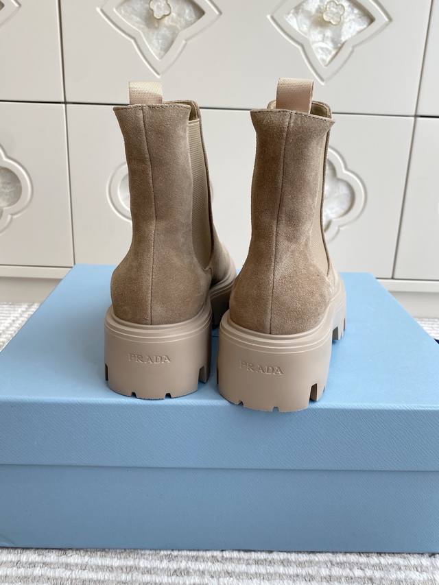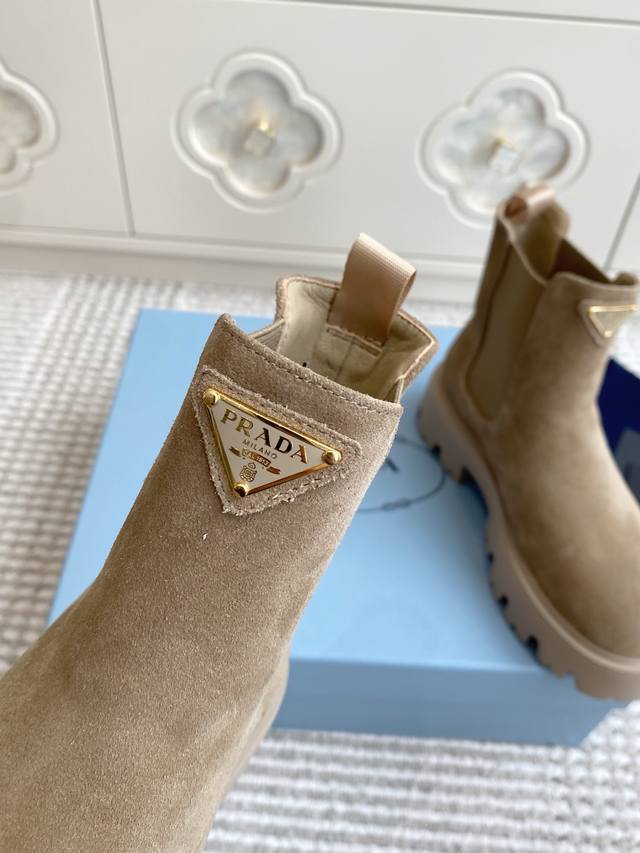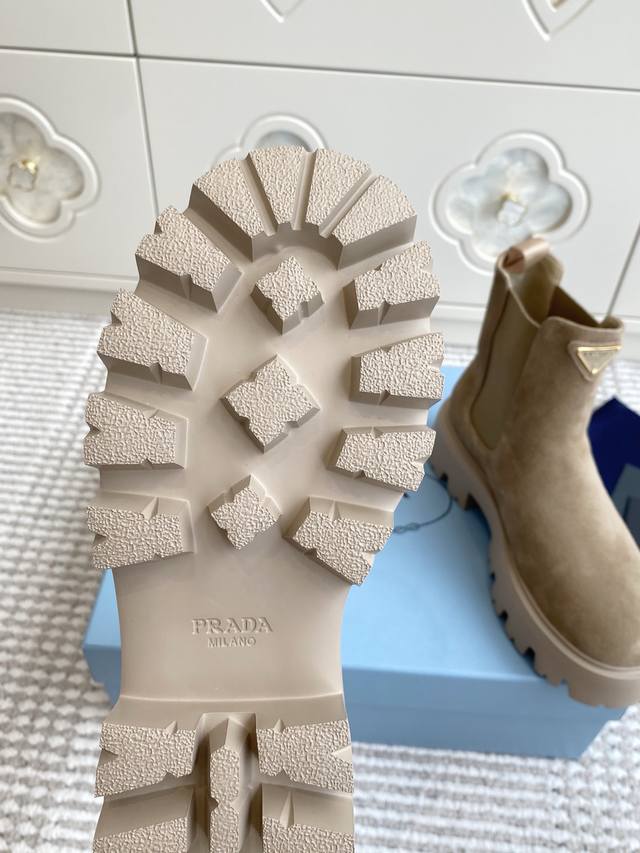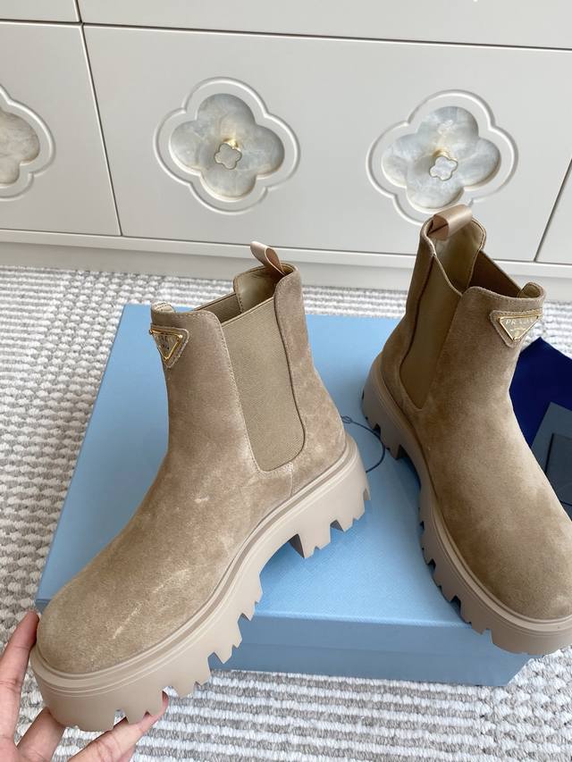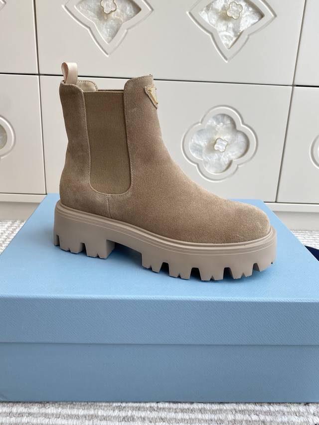 Prada New Platform Chelsea Boots DDD Top Quality DDD Exquisite lines and craftsmanship define this leather boot, adorned with the iconic triangular logo. A unique metal buckle adds personality to the biker style, paired with a thick rubber sole. DDD Upper: Imported cowhide suede DDD Lining: Sheepskin DDD Original molded tread pattern rubber outsole DDD Size: 35-39 40, 41, 42 Custom orders are non-refundable DDD