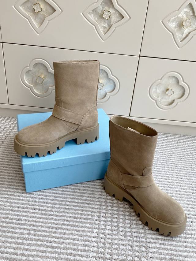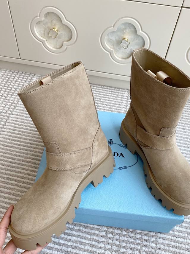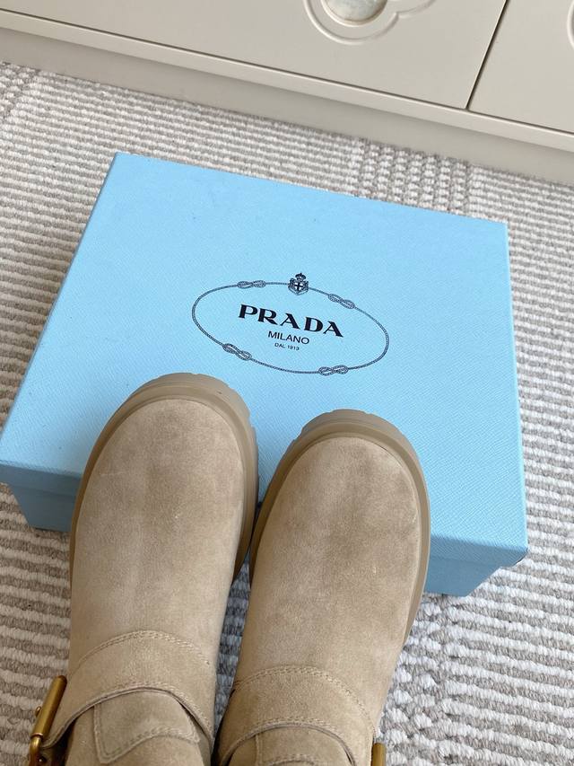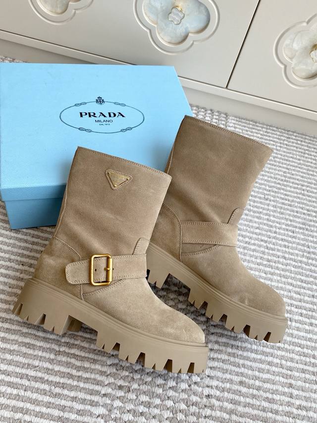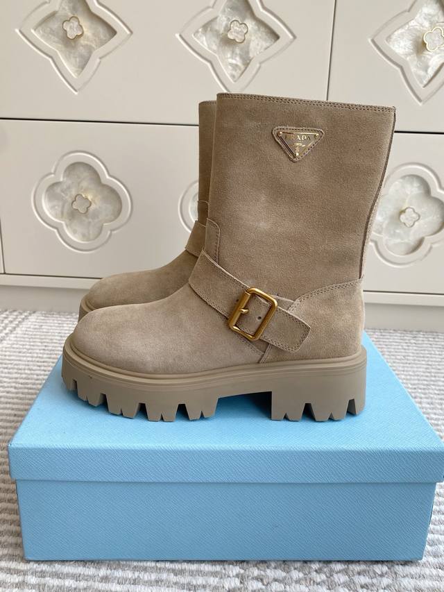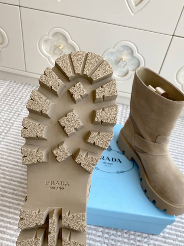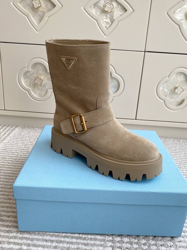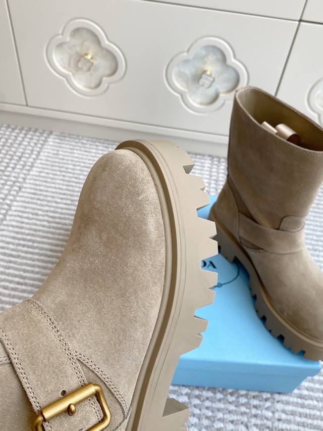 Prada New Thick-Soled Motorcycle Boots (Ankle Boots) - Top Quality. Exquisite lines and craftsmanship define these leather ankle boots, adorned with the iconic triangular logo. A unique metal buckle adds personality to the motorcycle style, paired with a thick rubber sole. Upper: Imported cowhide suede; Lining: Sheepskin; Original molded tread pattern rubber outsole; Size: 35-39; 40-41 (Custom orders are non-refundable).