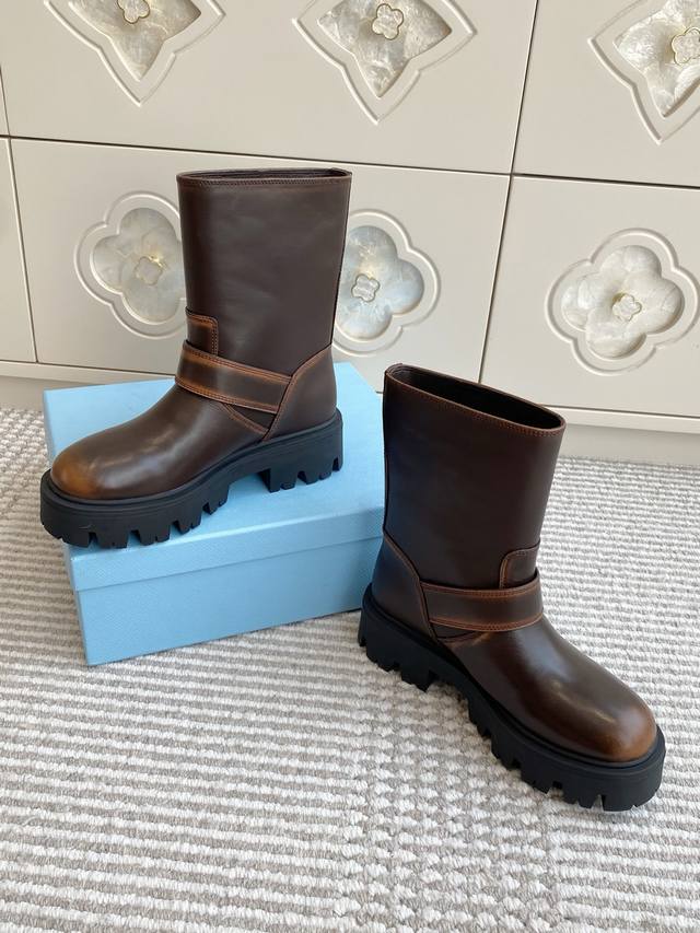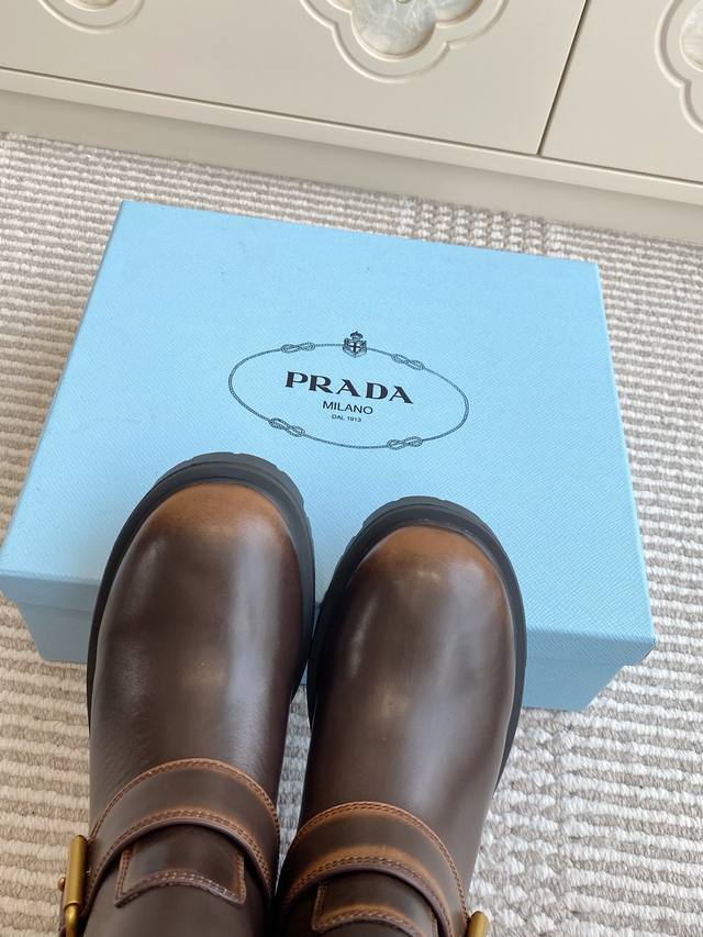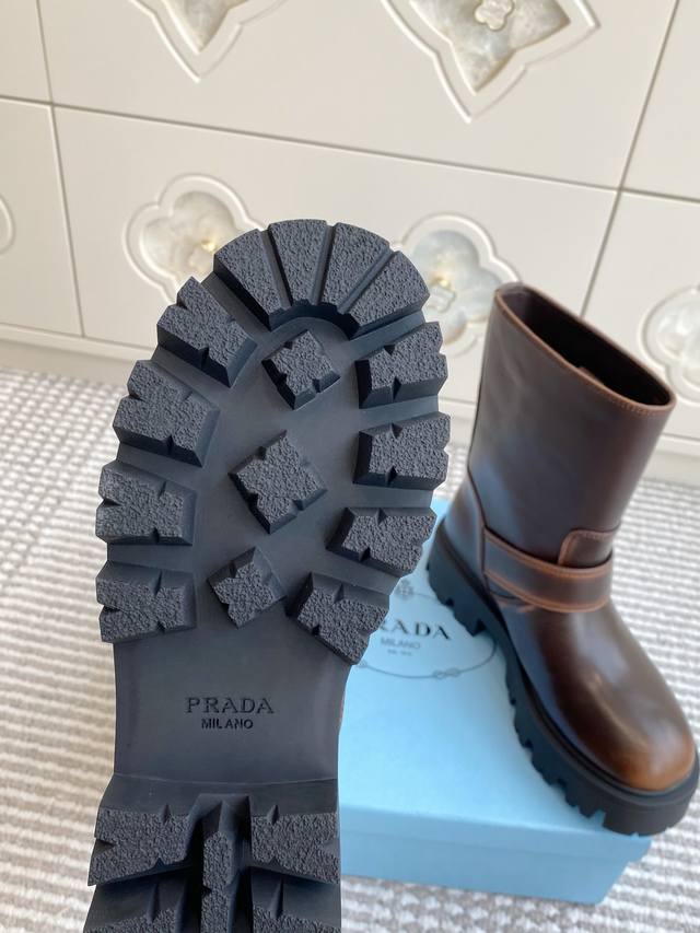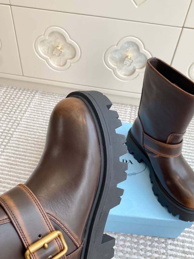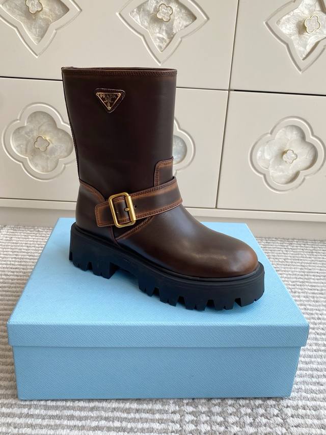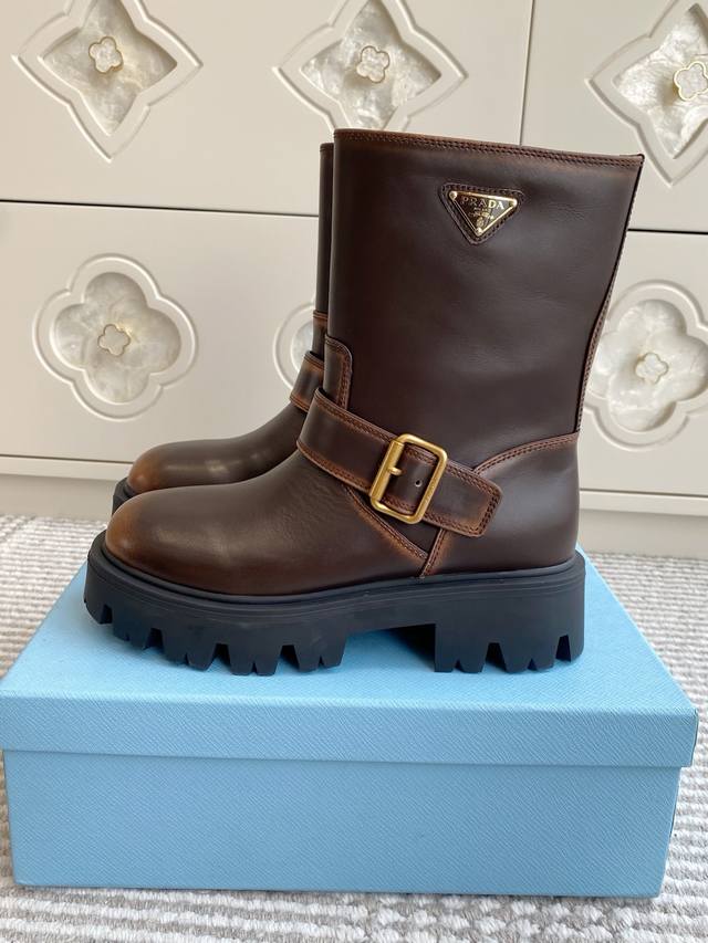 Prada New Thick-Soled Motorcycle Boots (Ankle Boots) - Top Quality. Exquisite lines and craftsmanship define this leather ankle boot, adorned with the iconic triangular logo. A unique metal buckle adds personality to the motorcycle style, paired with a thick rubber sole. Upper: Imported cowhide suede; Lining: Sheepskin; Original molded tread pattern rubber outsole; Size: 35-39, 40-41 (Custom orders are non-refundable).
