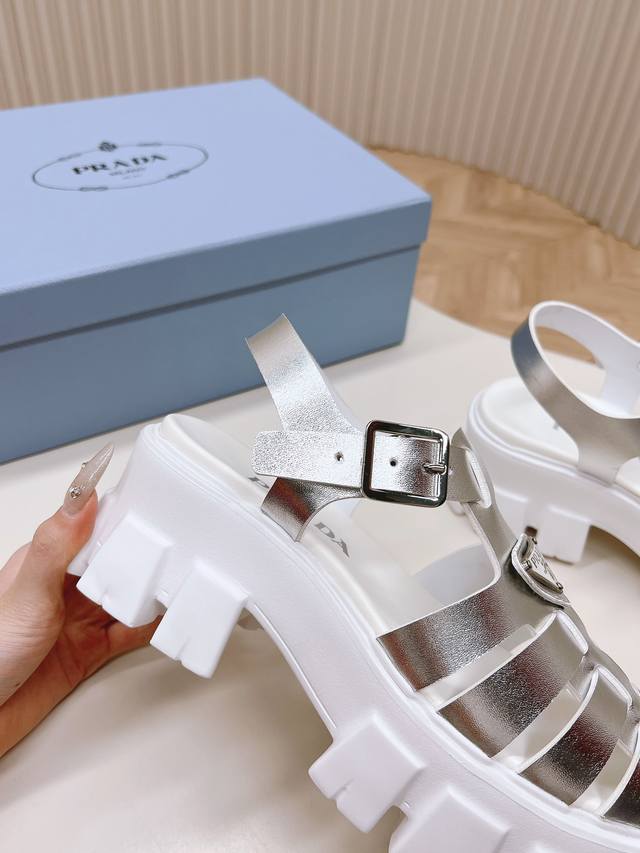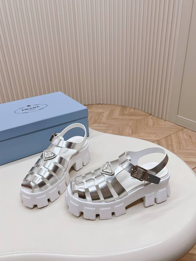 Prada "Pig Cage" Shoes - Serrated Roman Woven Platform Rubber Sandals. Retro, stylish, and avant-garde. 55mm platform sole paired with a rubber upper makes the shoes lightweight and comfortable. Vibrant colors cater to various styles and fashionistas! The iconic metal triangle logo combined with the vintage beach sandal design ensures every element is on point! Sizes 35-40.