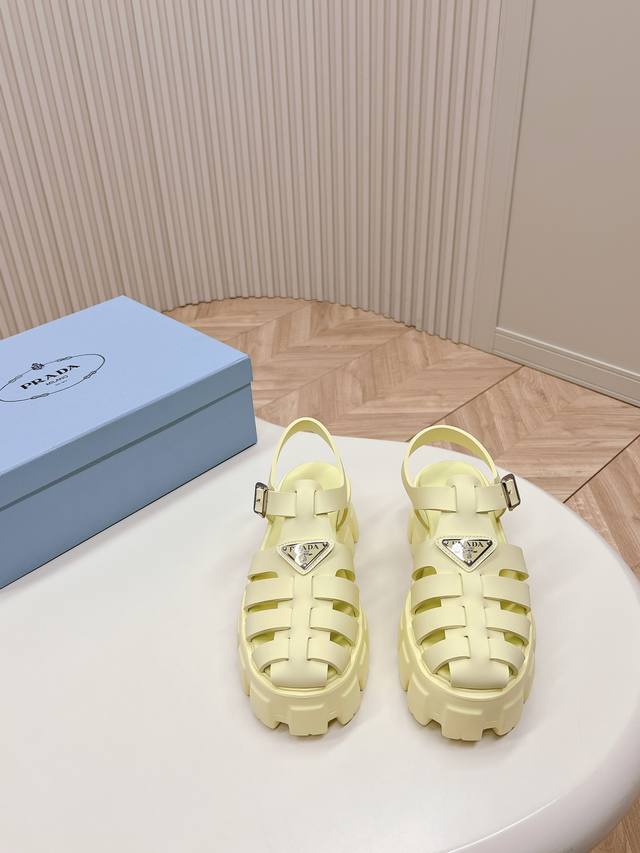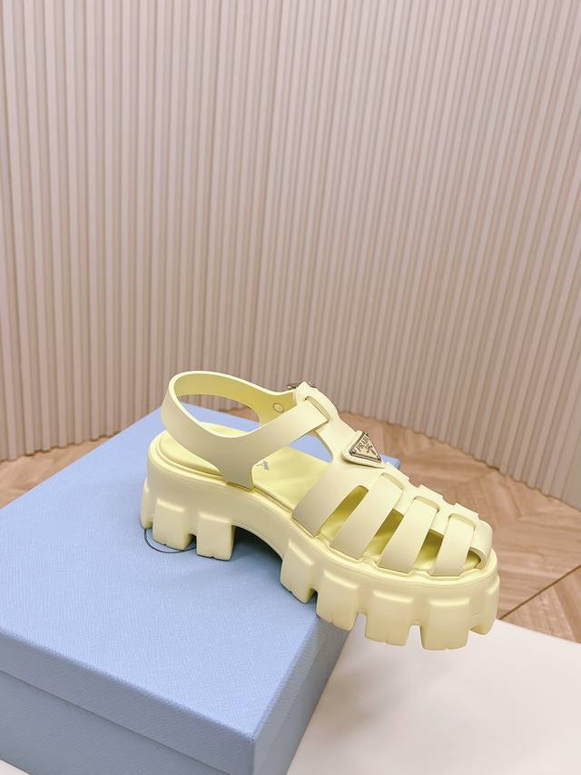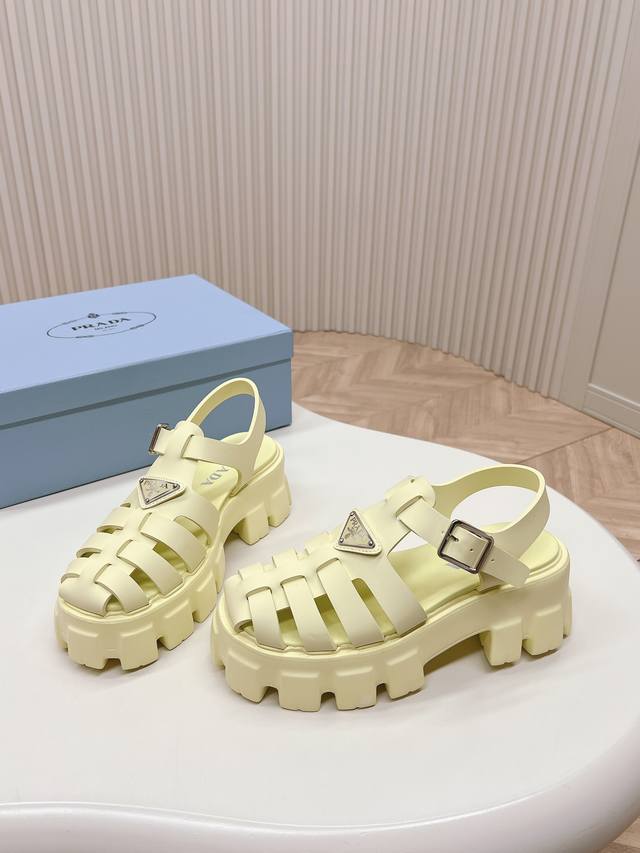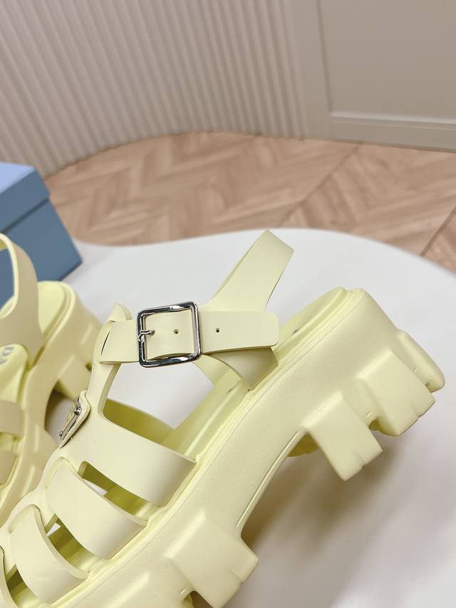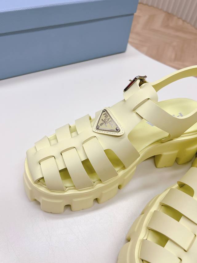 Prada "Pig Cage" Shoes - Serrated Roman Woven Platform Rubber Sandals. Retro, stylish, and avant-garde. 55mm platform sole paired with a rubber upper makes the shoes lightweight and comfortable. Vibrant colors cater to various styles and fashionistas! The iconic metal triangle logo combined with the vintage beach sandal design ensures every element is on point! Sizes 35-40.