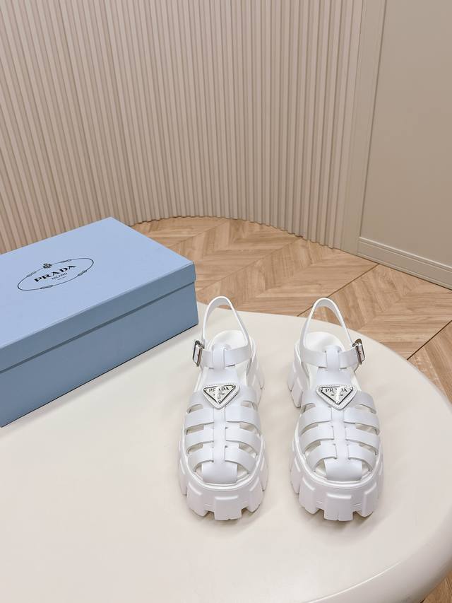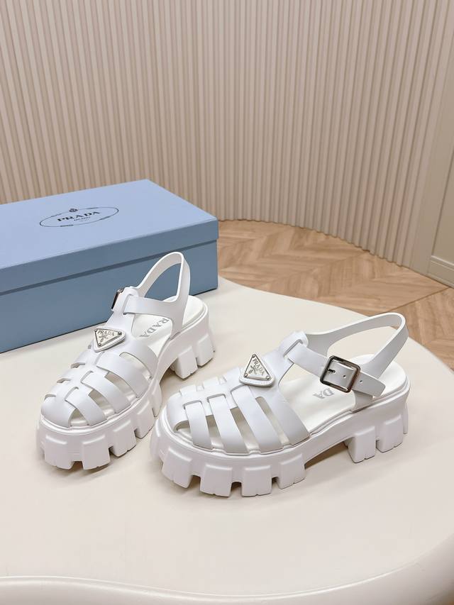 Prada "Pig Cage" Shoes - Serrated Roman Woven Platform Rubber Sandals. Retro, stylish, and avant-garde. 55mm platform sole paired with a rubber upper makes the shoes lightweight and comfortable. Vibrant colors cater to various fashionistas! The iconic metal triangle logo combined with the vintage beach sandal design ensures every element is on point! Sizes 35-40.