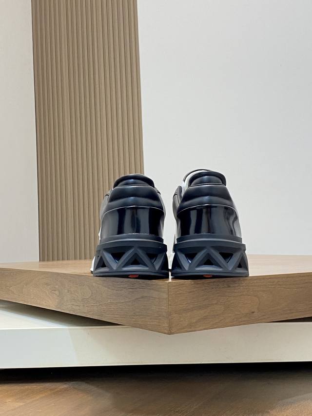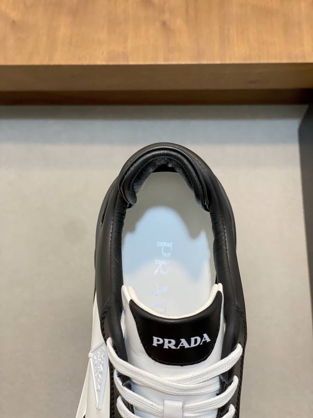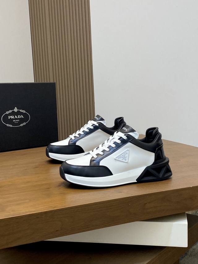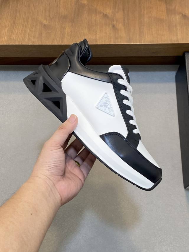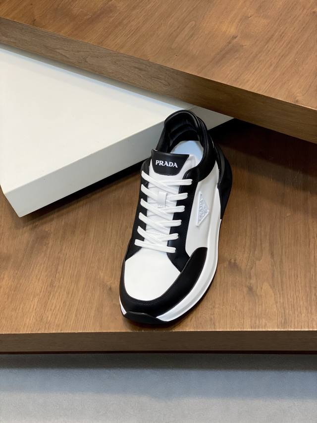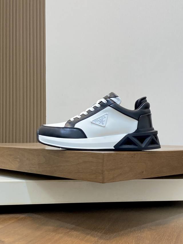 . These sneakers present a modern version, reinterpreting the brand's classic style with clean lines and smooth details. The shoes are made of calf leather and technical fabric, decorated with a triangular metal logo on the outside, bright TPU decoration on the heel, and an extended and padded heel lining for more comfortable wearing. The tongue is decorated with a silk-screen logo and paired with a thick hollow rubber sole on the heel. The full cowhide lining comes standard with a logo cowhide pad, which increases the height and comfort of the feet, and is versatile and durable! Comes with a full set of original packaging!