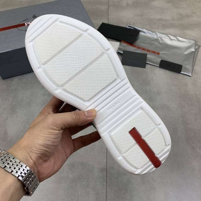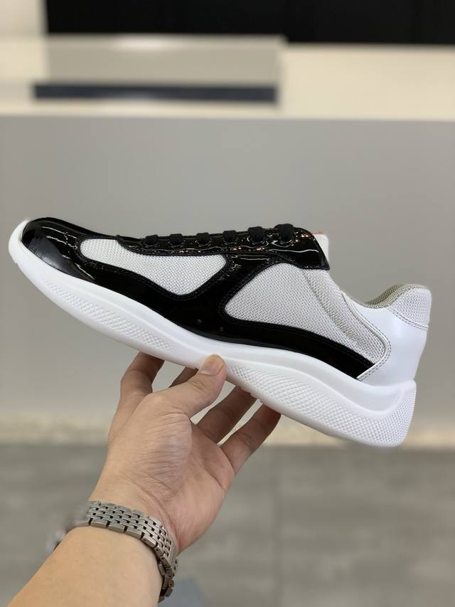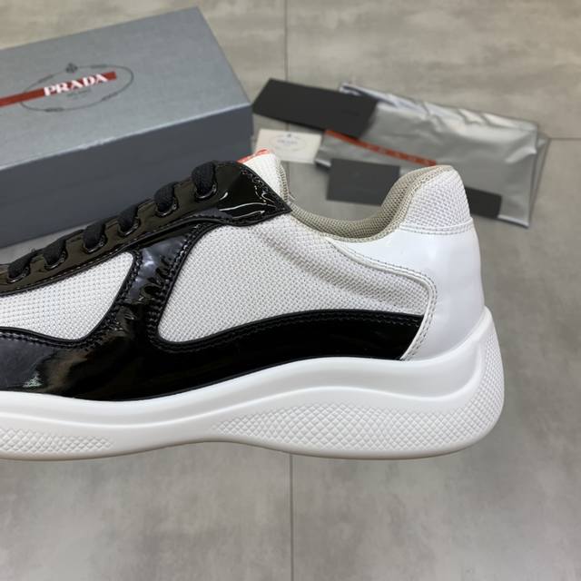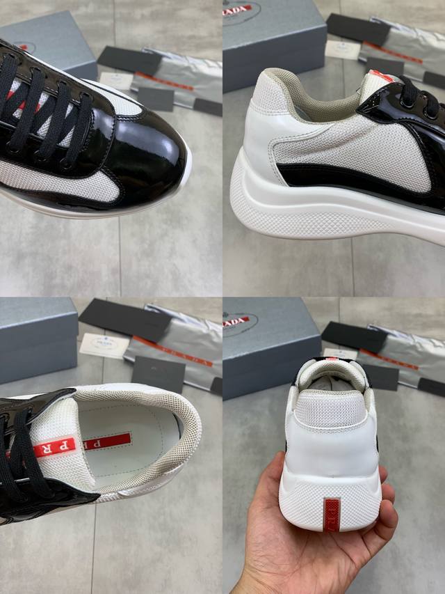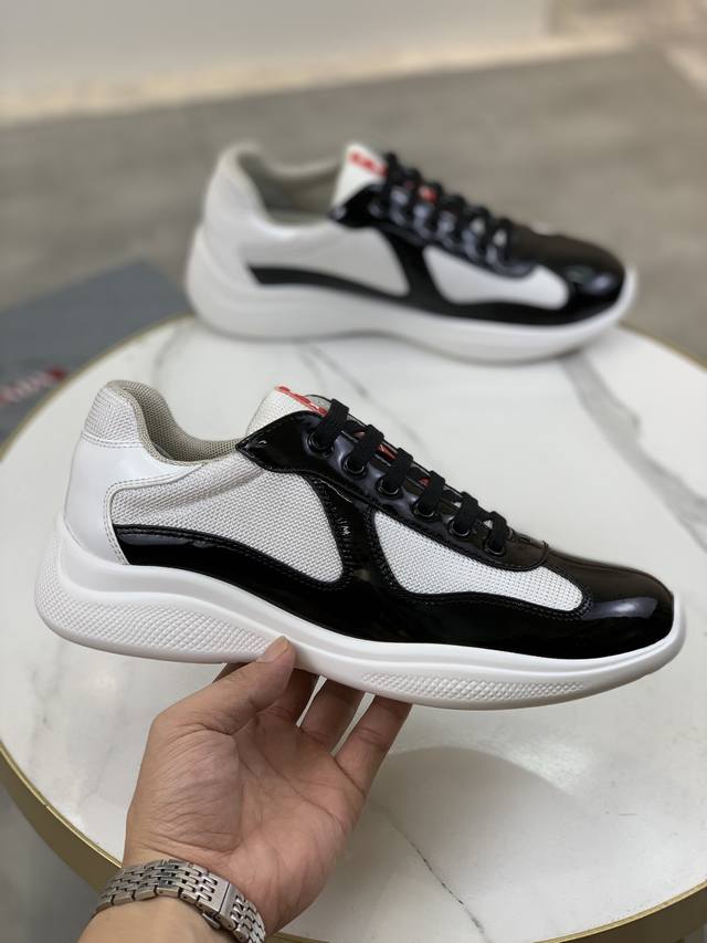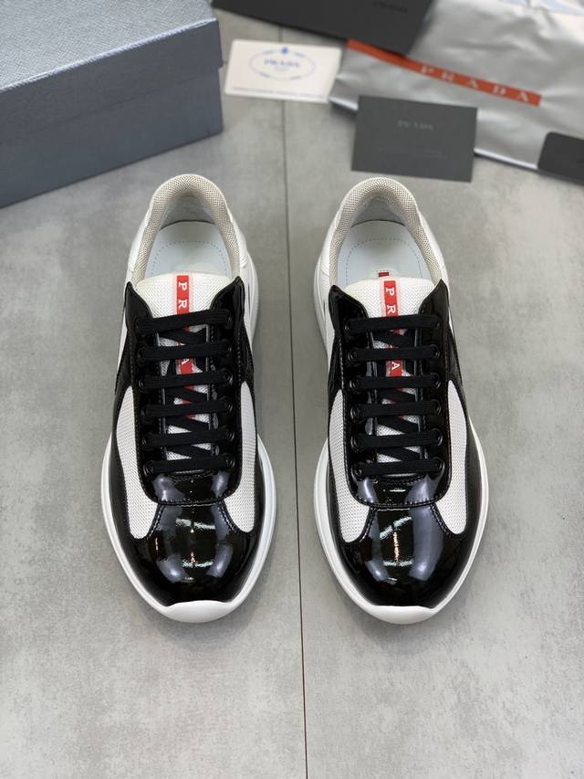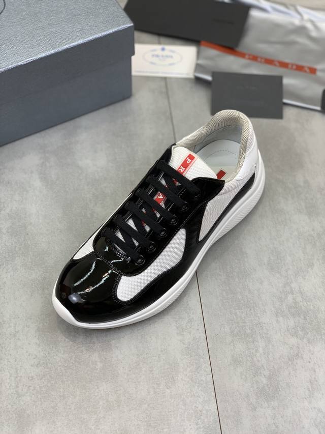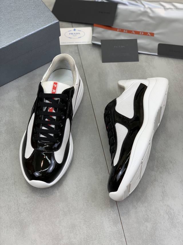 Prada premium edition sneakers. Features include an imported flyknit upper with patent leather trim, sheepskin lining with cowhide gusset, durable, non-slip, and lightweight outsole. Unisex style. Sizes: 35-47. Custom sizes 45, 46, and 47 are available.