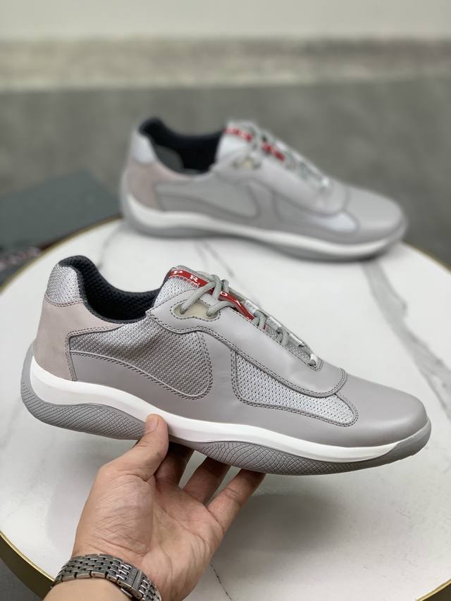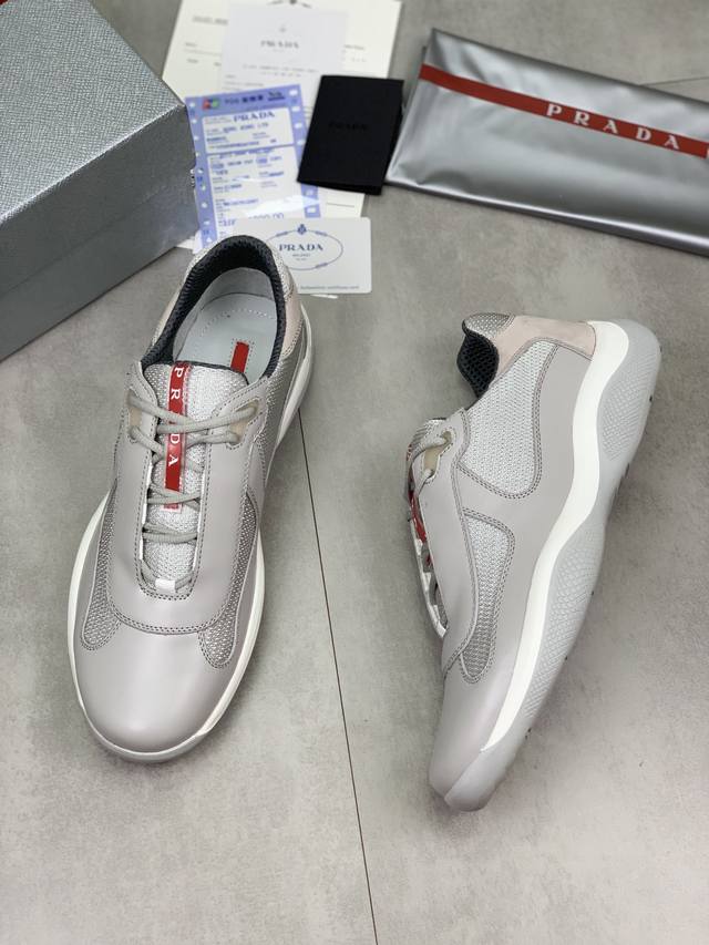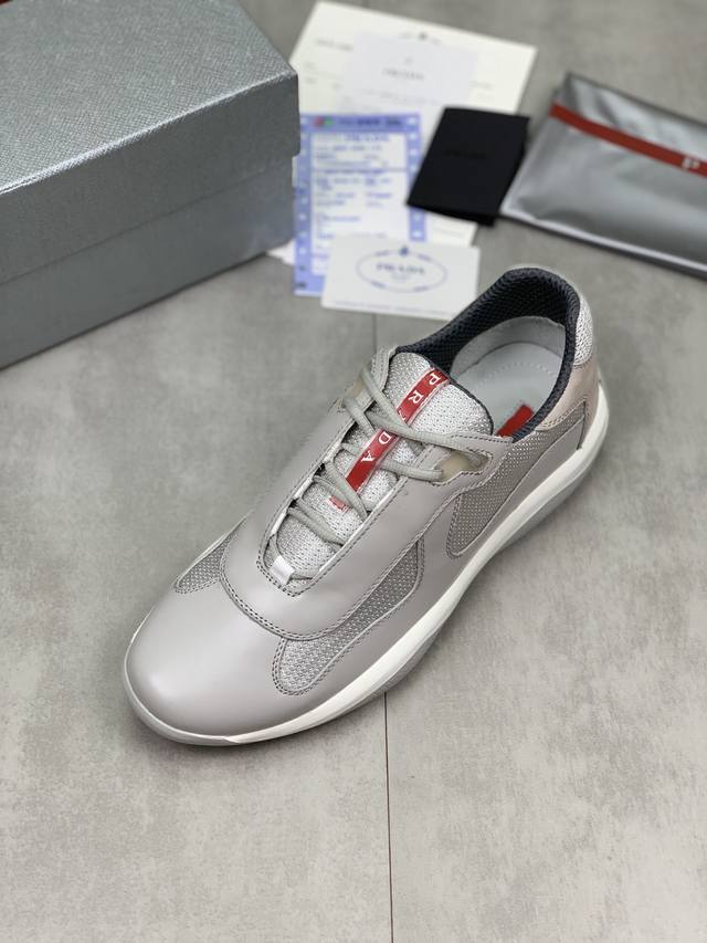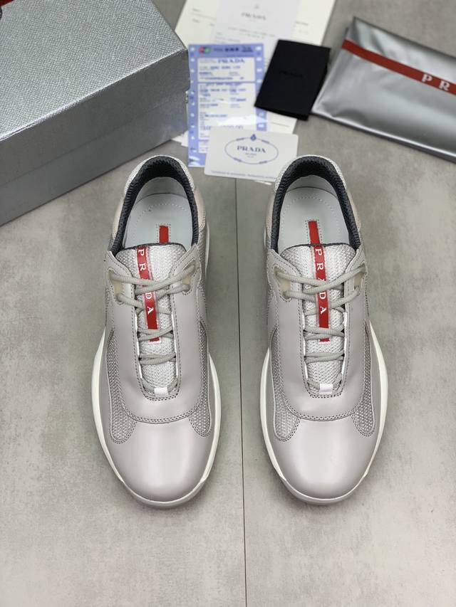 Prada premium edition sneakers. Features include an imported flyknit upper with patent leather trim, sheepskin lining with cowhide tread, durable, non-slip, and lightweight outsole. Unisex style. Sizes: 35-47, 46 and 47 custom-made.