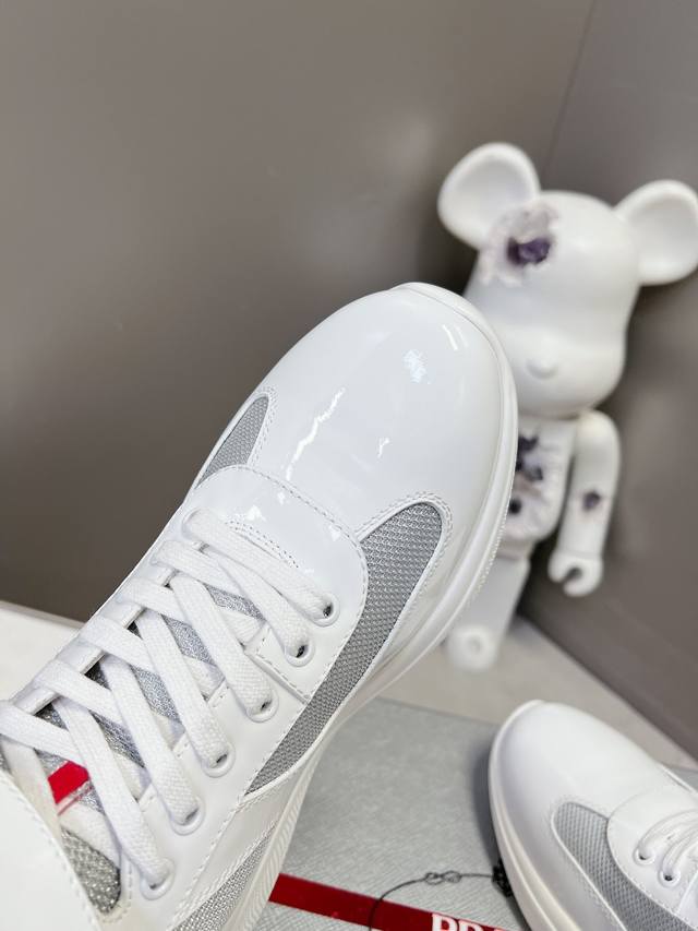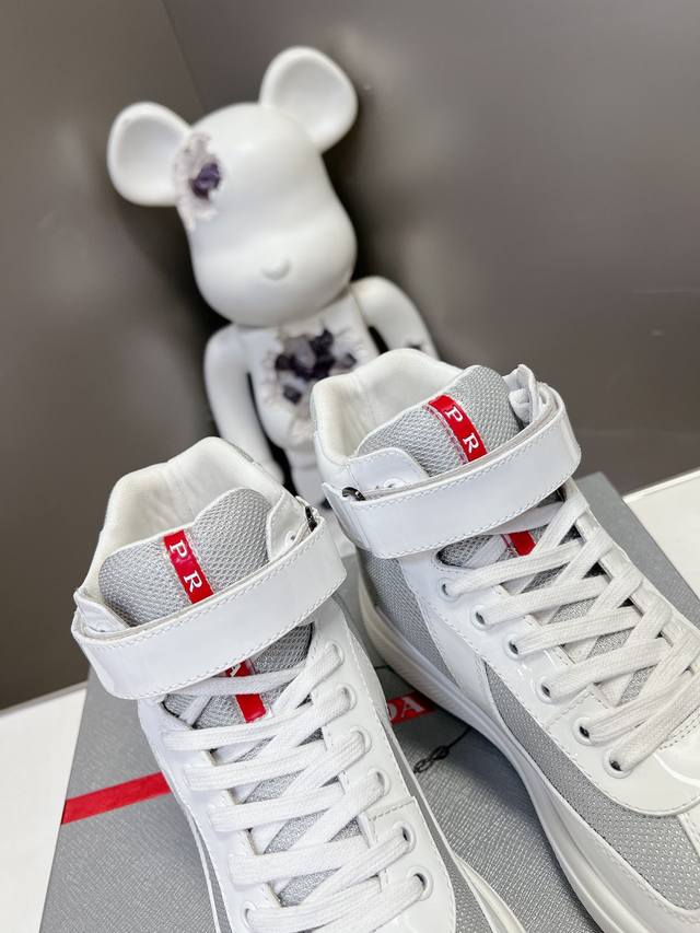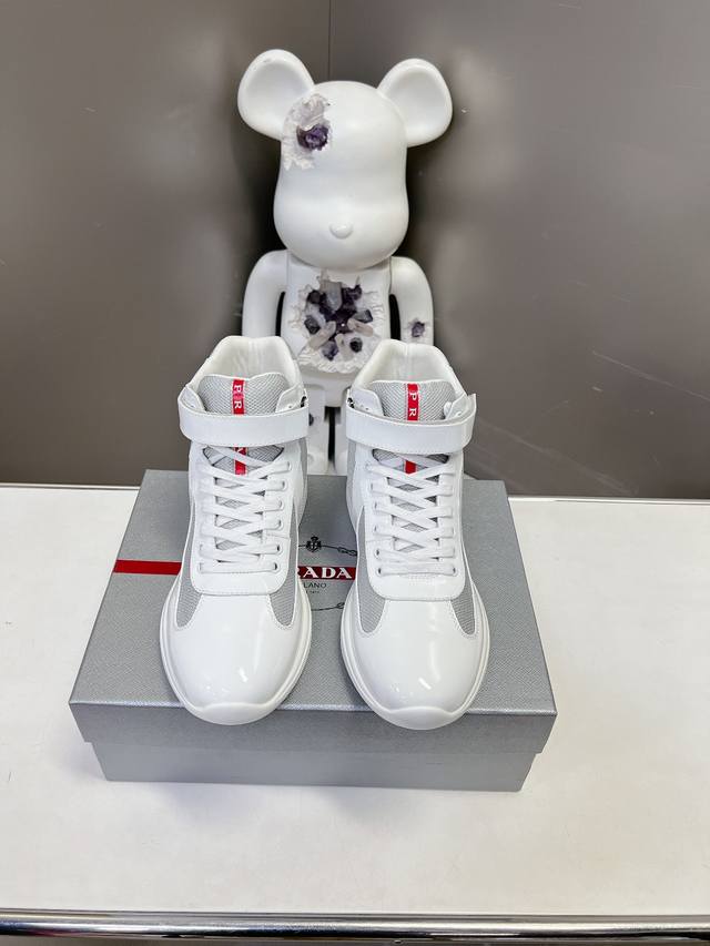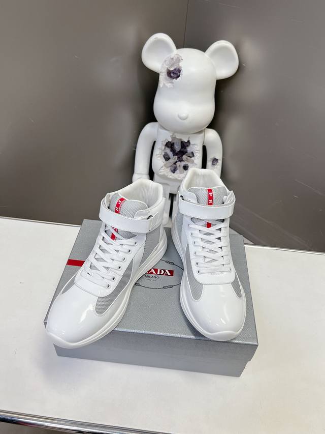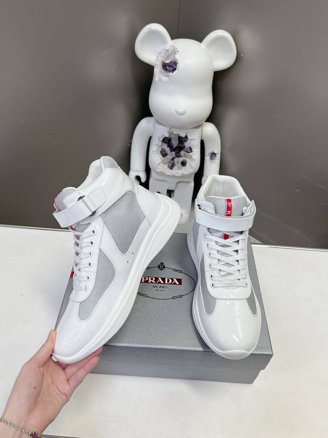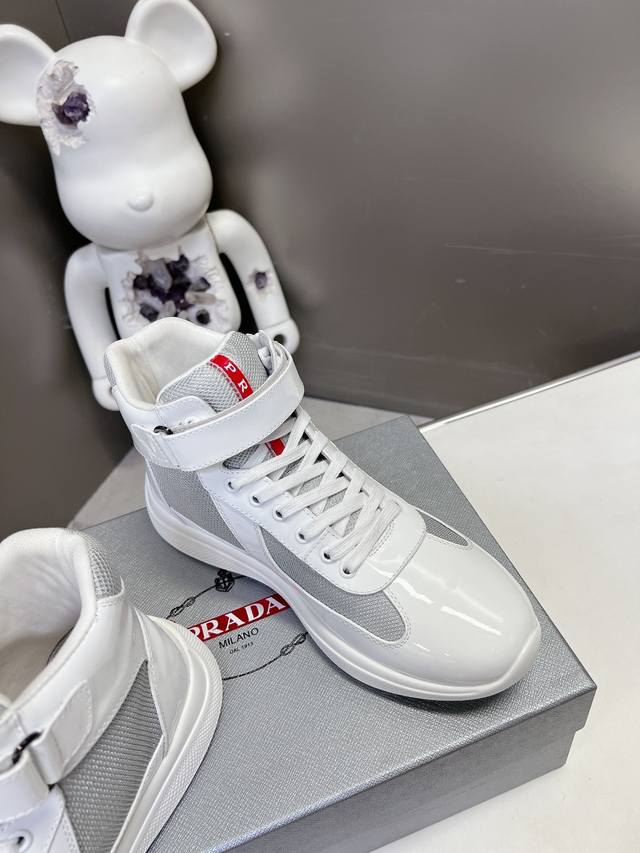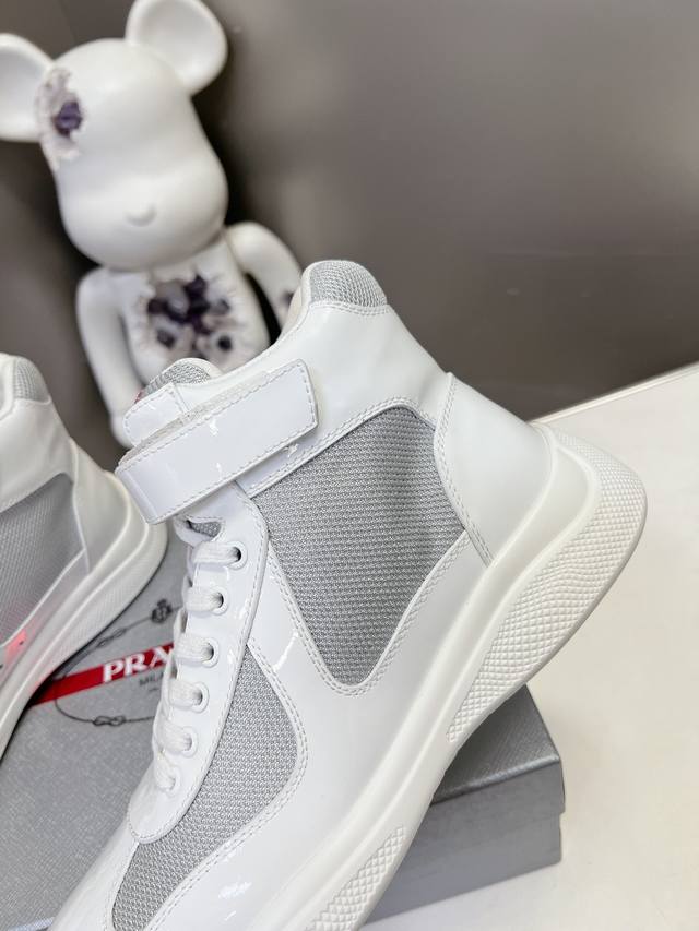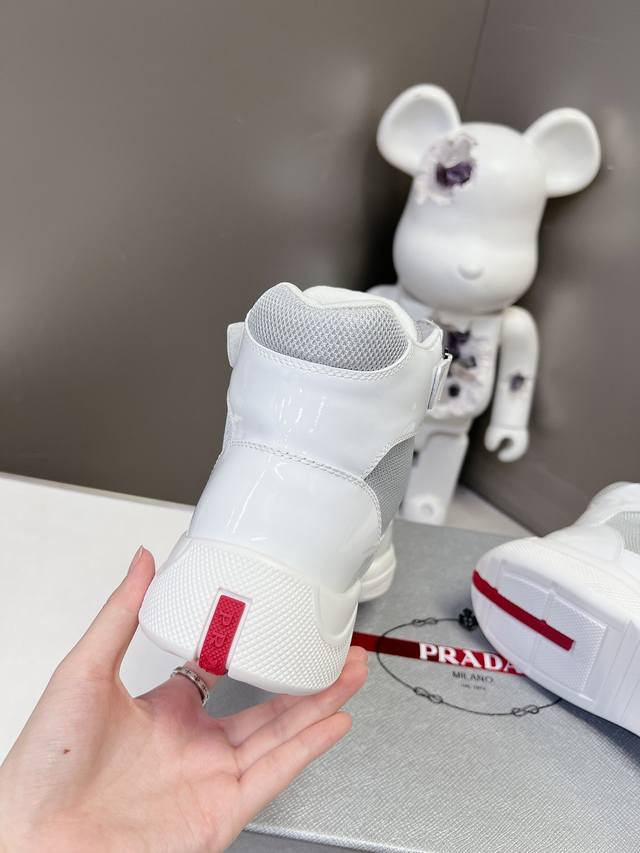 Prada premium high-top sneakers. Features include an imported flyknit upper with patent leather trim, sheepskin lining, cowhide tread, durable, slip-resistant, and lightweight outsole. Unisex style. Sizes: 35-45.