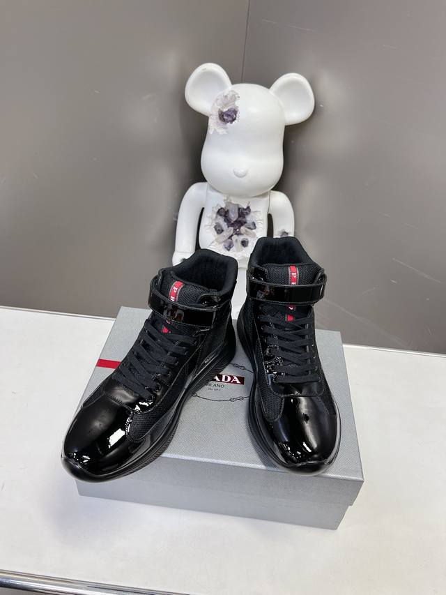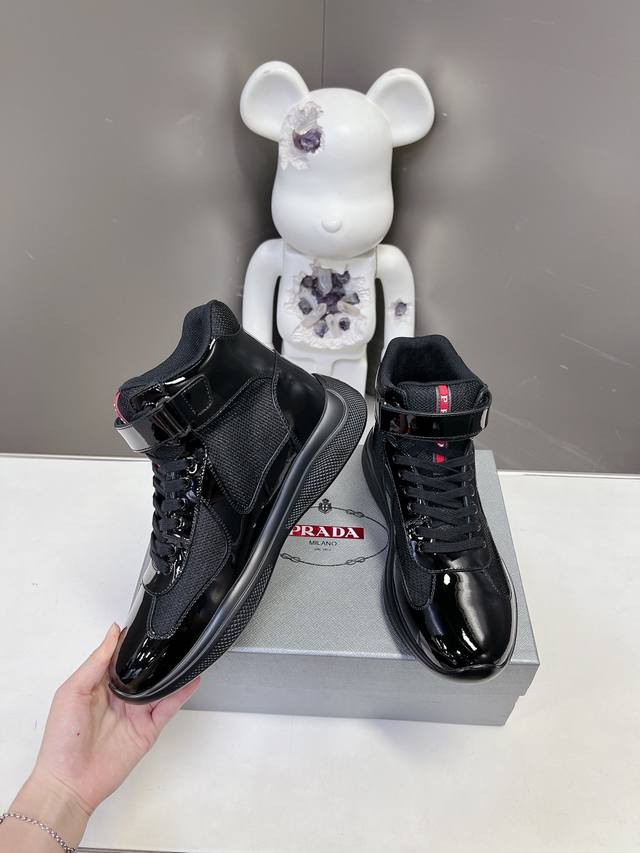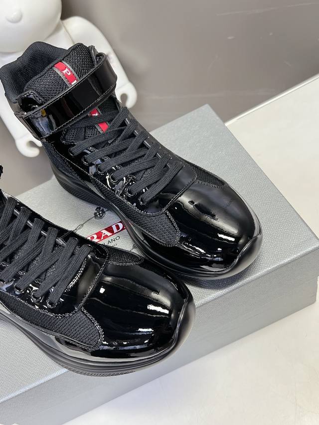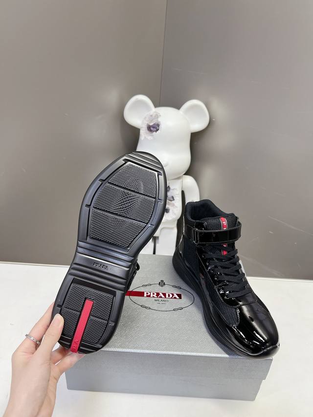 Prada premium high-top sneakers. Features include an imported flyknit upper with patent leather trim, sheepskin lining, cowhide tread, durable, non-slip, and lightweight outsole. Unisex style. Sizes: 35-45.