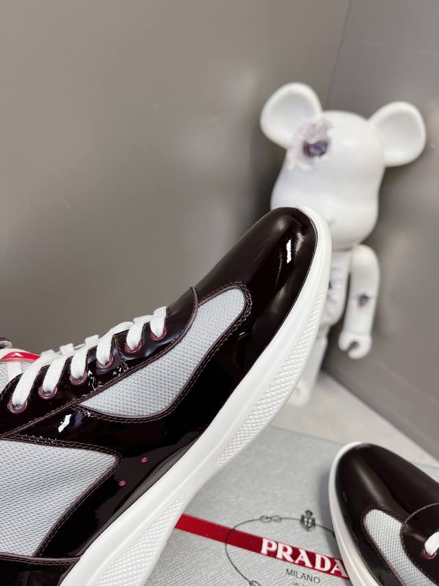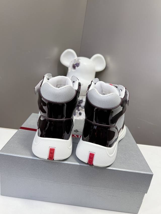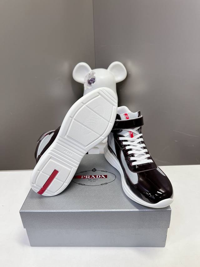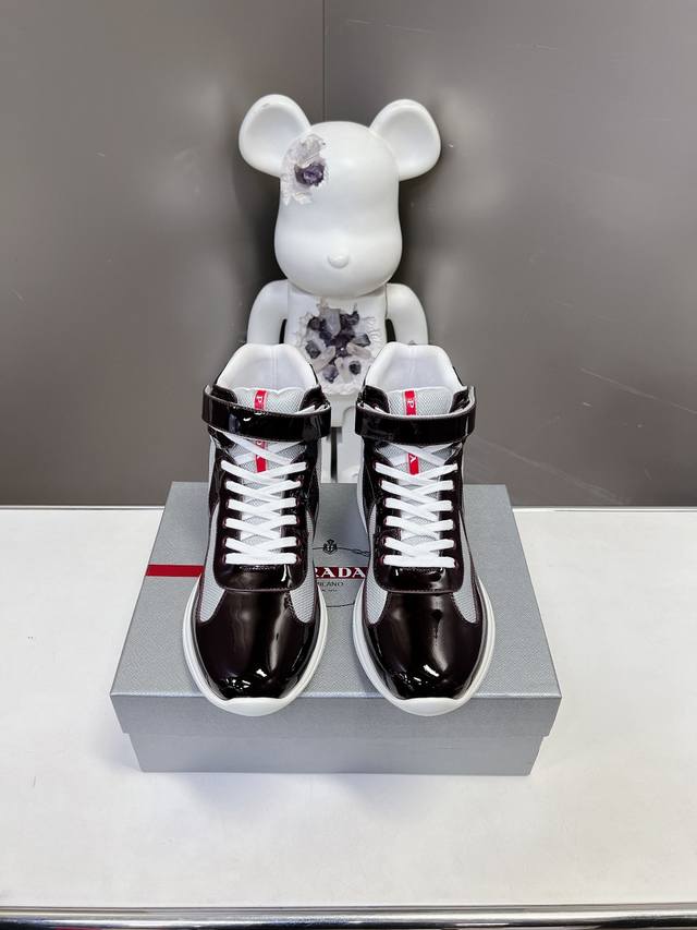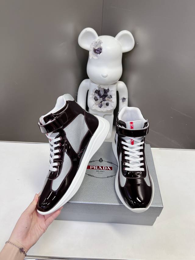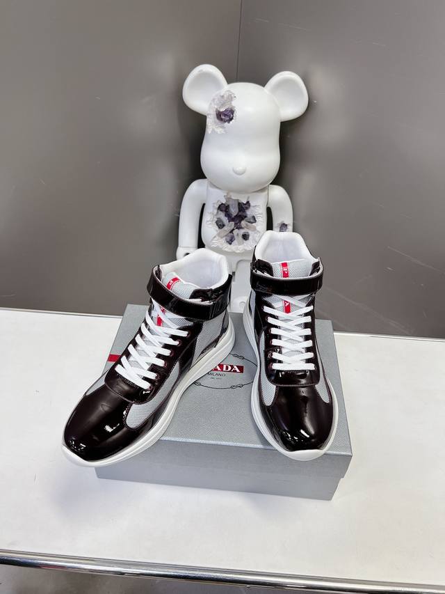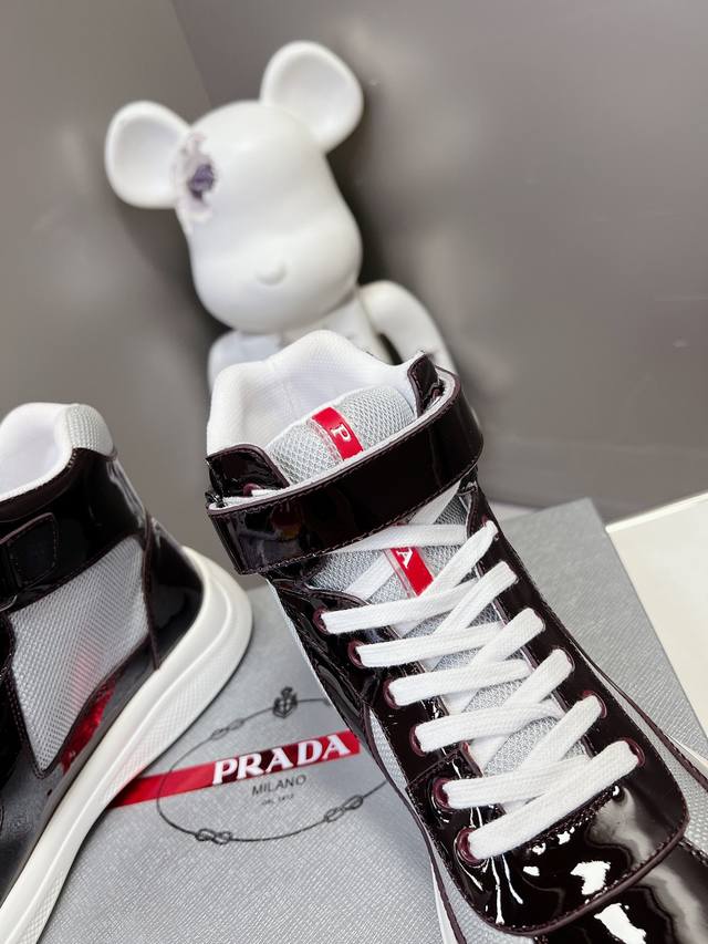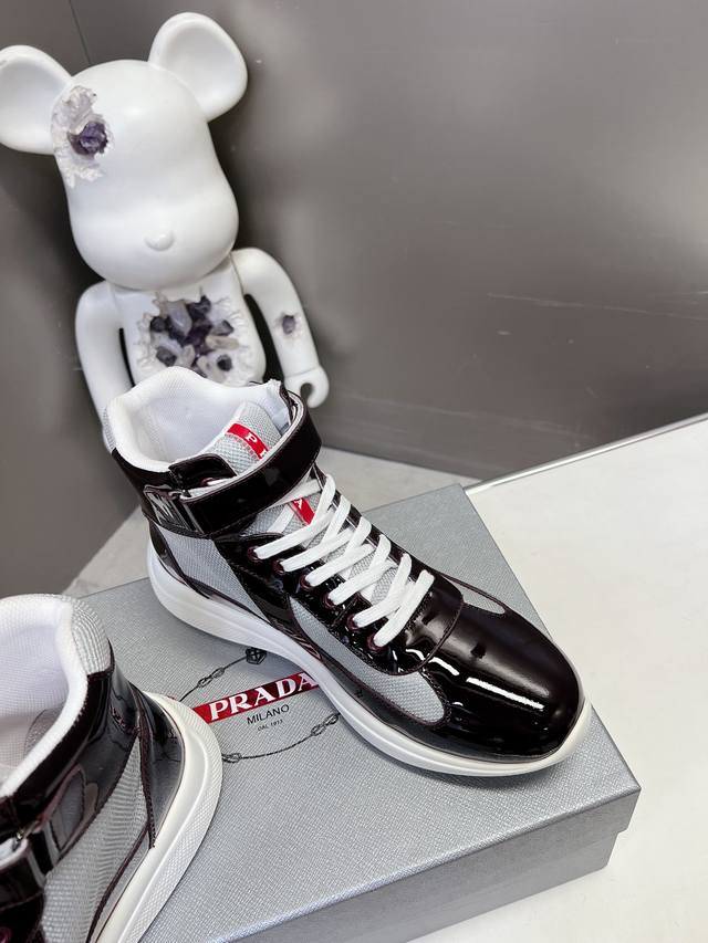 Prada premium high-top sneakers. Features include an imported flyknit upper with patent leather trim, sheepskin lining, cowhide tread, durable, non-slip, and lightweight outsole. Unisex style. Sizes: 35-45.