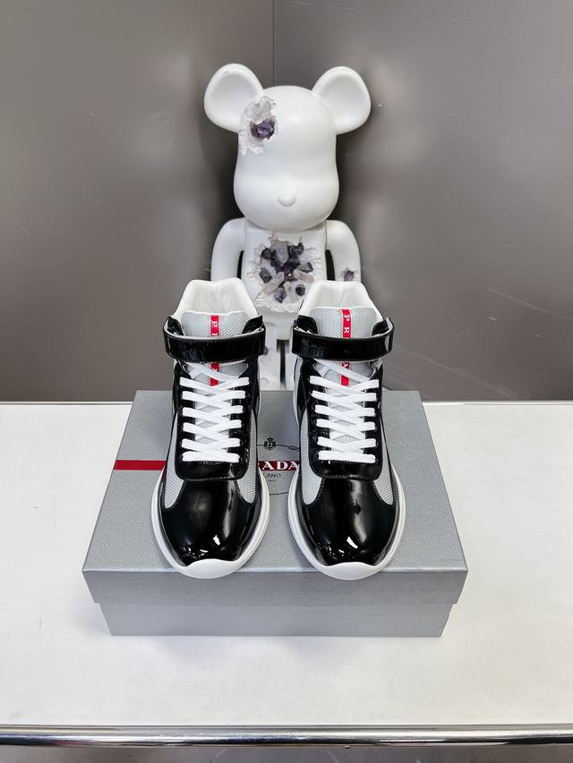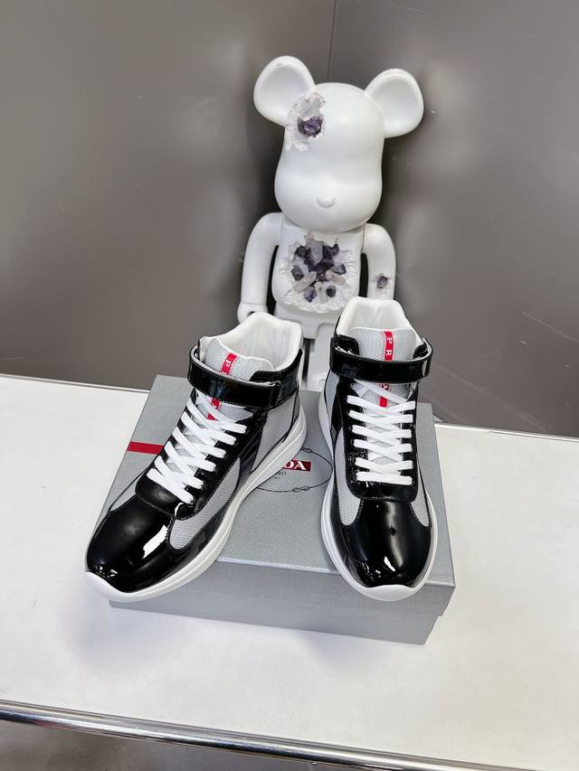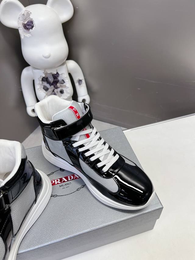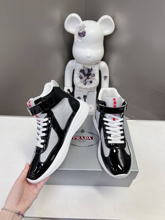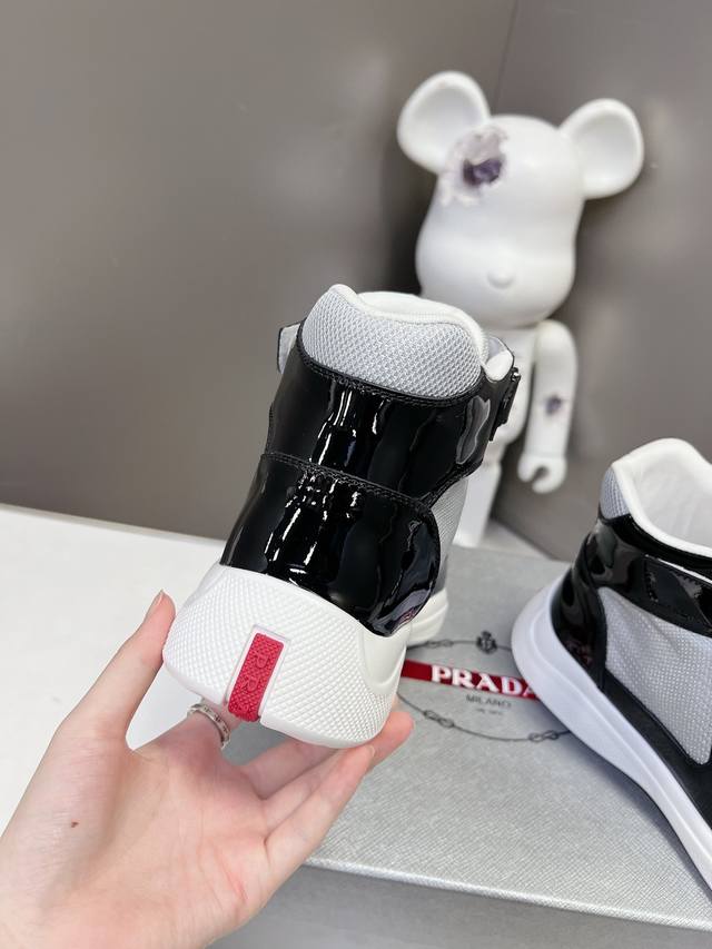 Prada premium high-top sneakers. Features include an imported flyknit upper with patent leather trim, sheepskin lining, cowhide tread, durable, non-slip, and lightweight outsole. Unisex style. Sizes: 35-45.