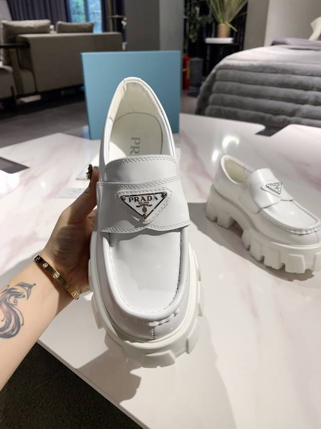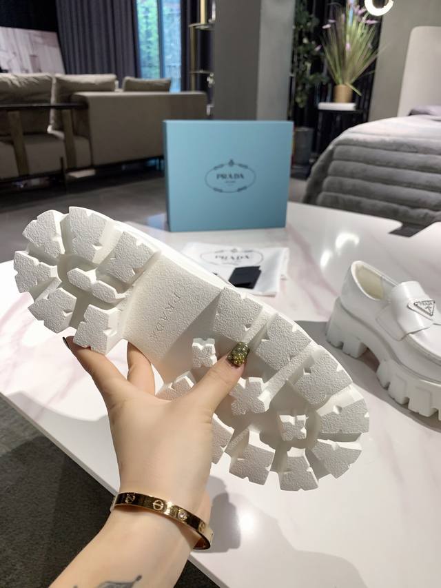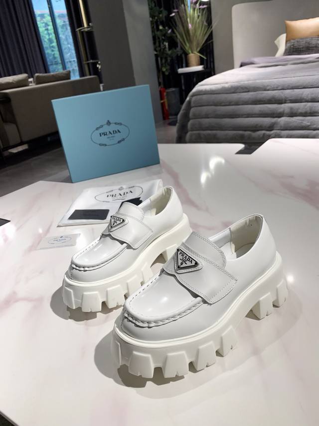 Prada 's newest runway product with metal triangle logo! This year's Prada designs are simply stunning! Futuristic and high-end, the shoes look amazing on foot. The thick sole greatly enhances wearability. The latest series is even more comfortable and stylish than before! Original metal buckle, the quality is simply incredible! High-grade patent leather with split edges and calfskin beads