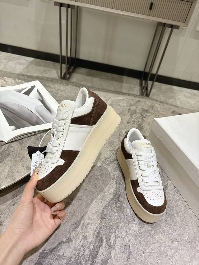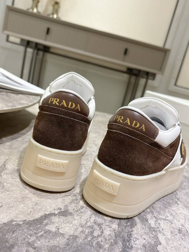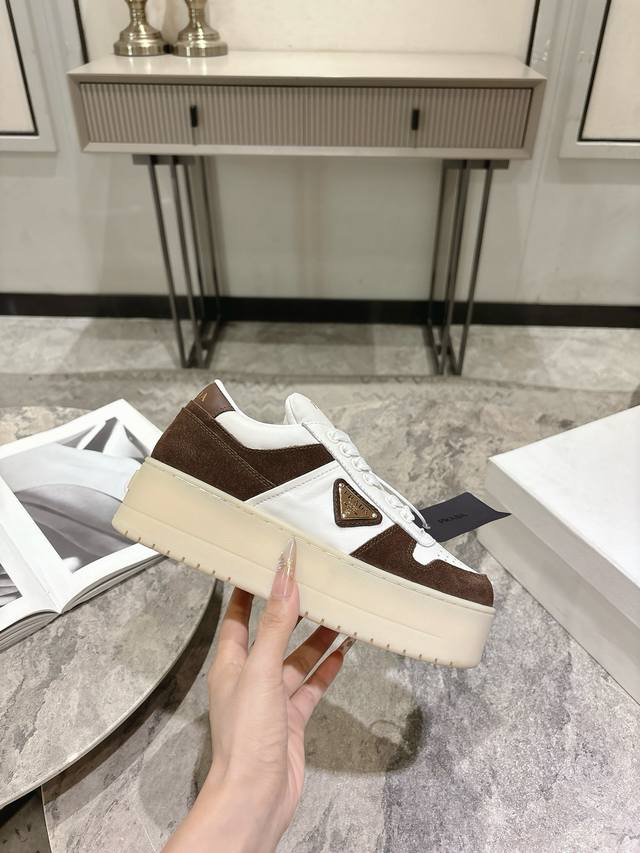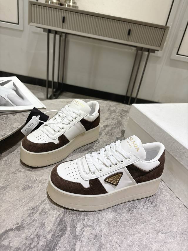 Prada Spring/Summer Newest Thick-Soled Triangle Logo Casual Sneakers DDD Original Purchase and Developed. This leather sneaker is stylish and simple, showcasing a perfect blend of minimalist style and sporty personality. DDD It features classic cotton laces and a lightweight rubber sole, while the enamel-coated triangle metal logo adds a unique charm. A true height-enhancing wonder! DDD Material: High-gloss cow suede DDD Lining: Imported soft cowhide DDD Outsole: TPU infused outsole Original two-tone ultra-light DDD Height 5cm DDD Size: 35-39 40.41 Custom orders, no returns or exchanges DDD