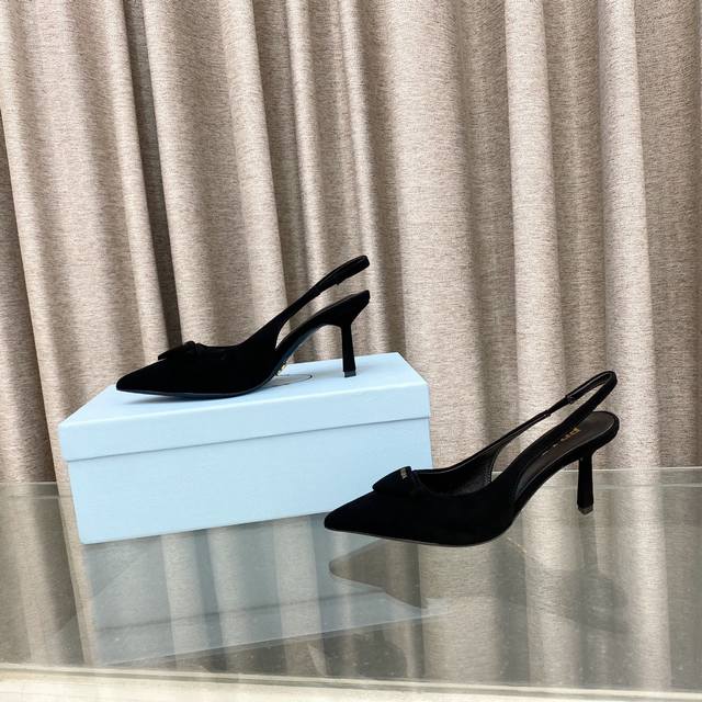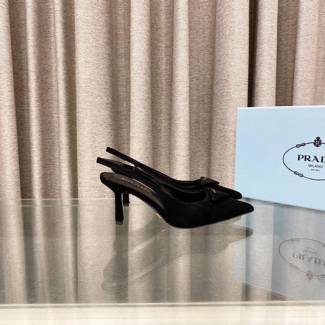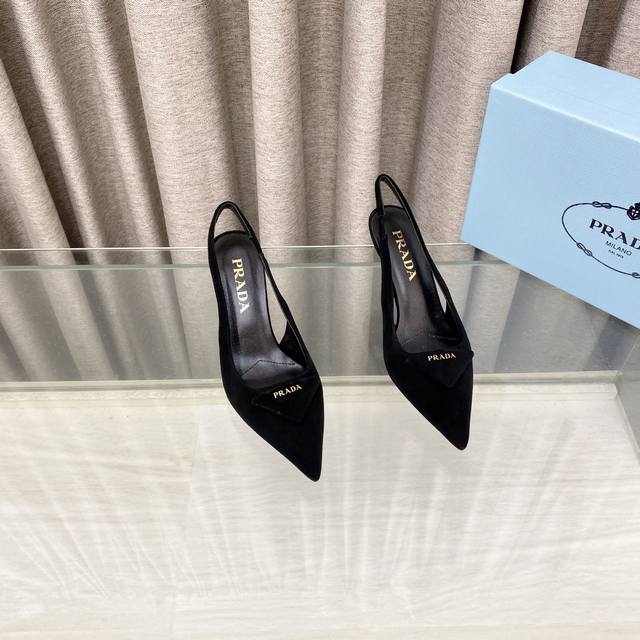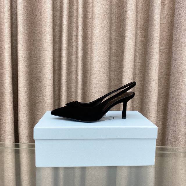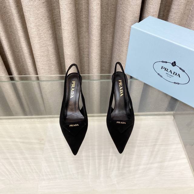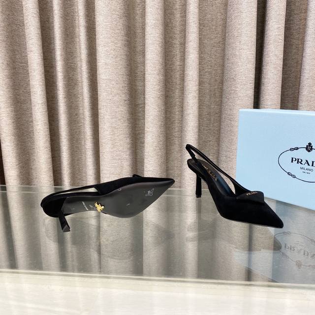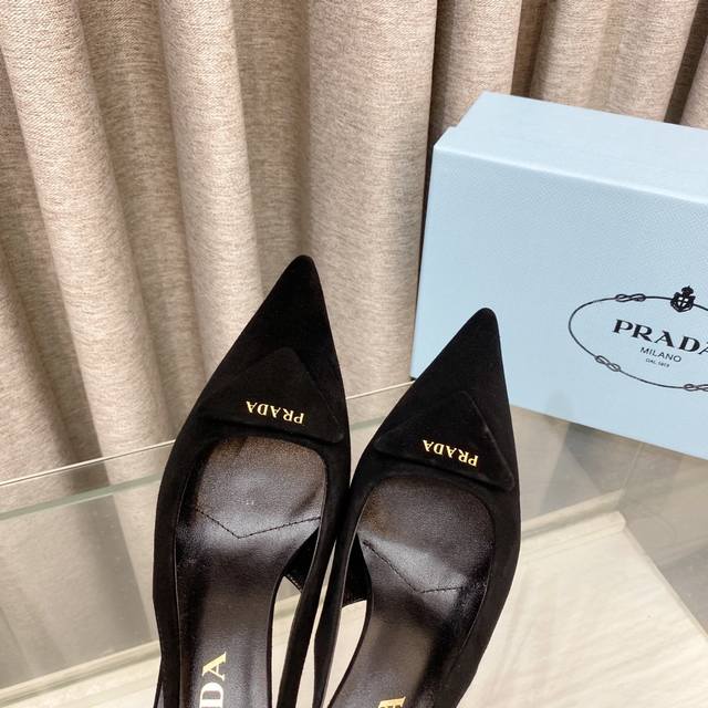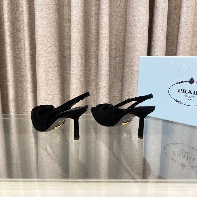 Prada Suede Lambskin Leather Back Strap High Heels Ddd These high heels are crafted from lambskin leather, presenting a refined and elegant feel. Lambskin leather is Prada's signature material, traditionally used in the creation of glamorous footwear. The triangular logo returns, transformed into a subtly liningd leather detail, inspiring the geometric lines of the heel and giving the silhouette a modernist style. Ddd Silkscreen printed leather triangular logo Ddd Metal lettered logo trim leather sole Ddd 7.5cm covered leather heel Ddd Sizes: 34-42 34.40.41.42 Custom made Ddd