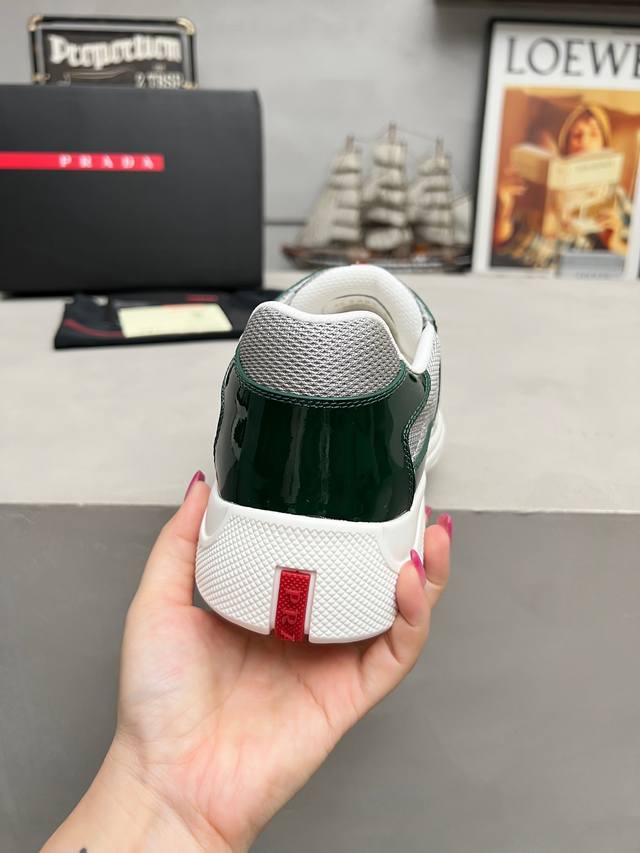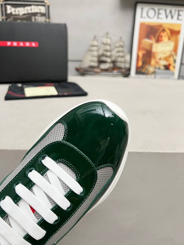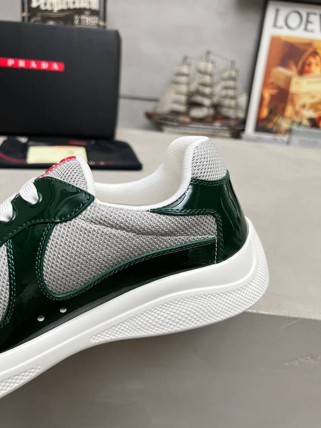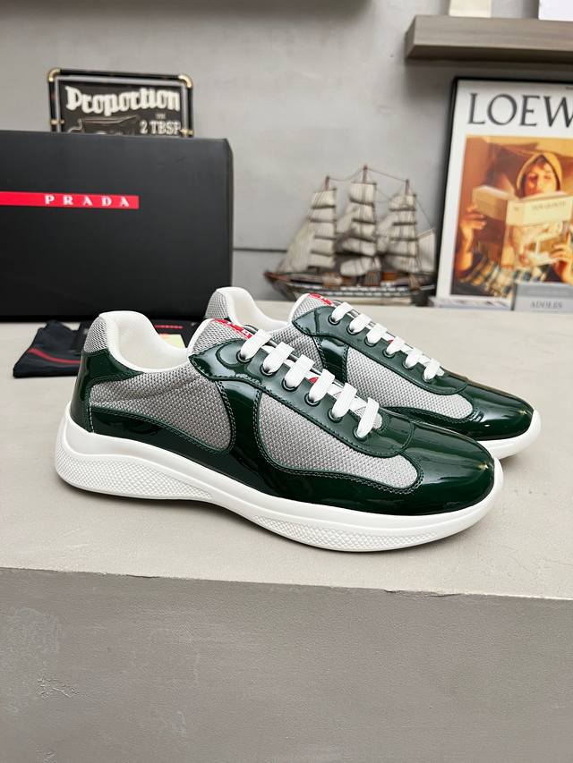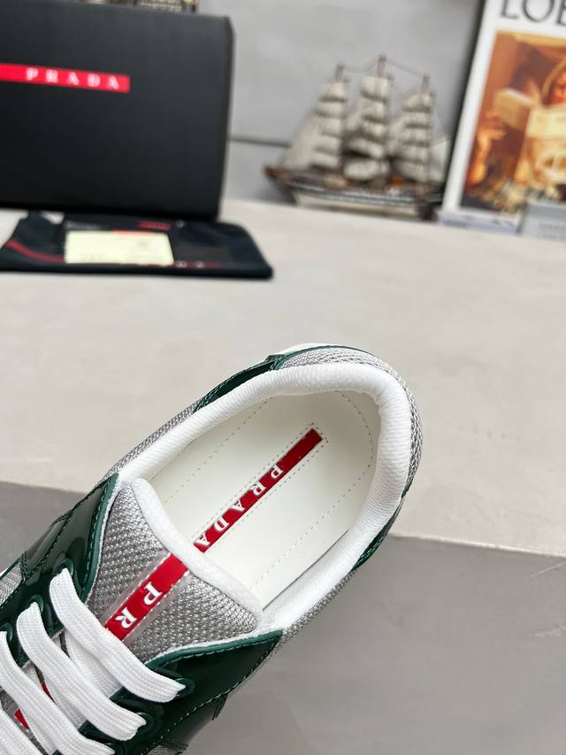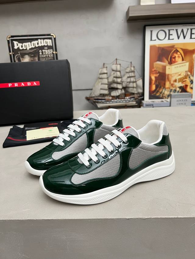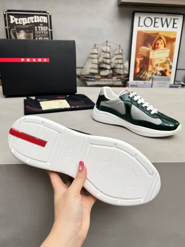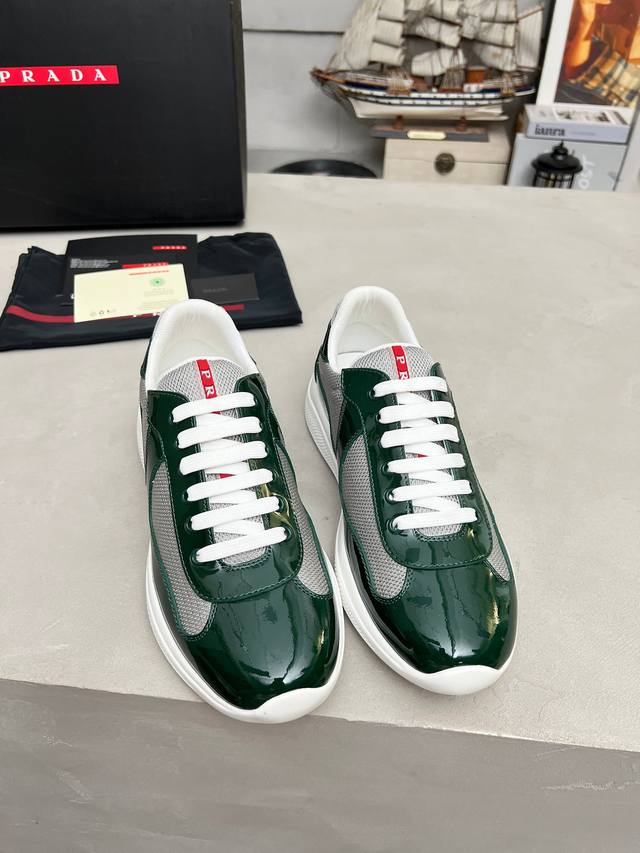 Prada top-of-the-line sneakers. Features include an imported flyknit upper with patent leather trim, sheepskin lining with cowhide tread, durable, non-slip, and lightweight outsole. Unisex style. Sizes: 35-47, 46 and 47 custom-made.