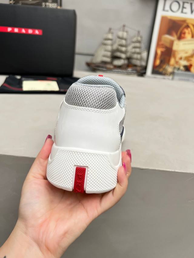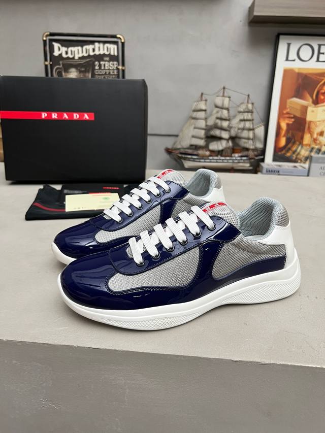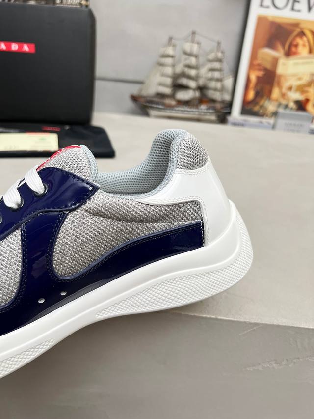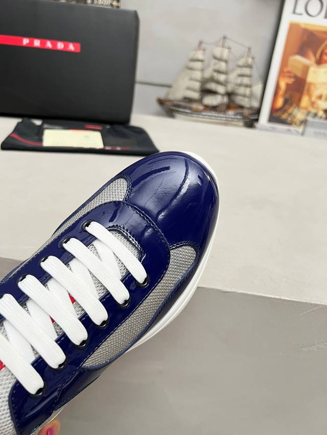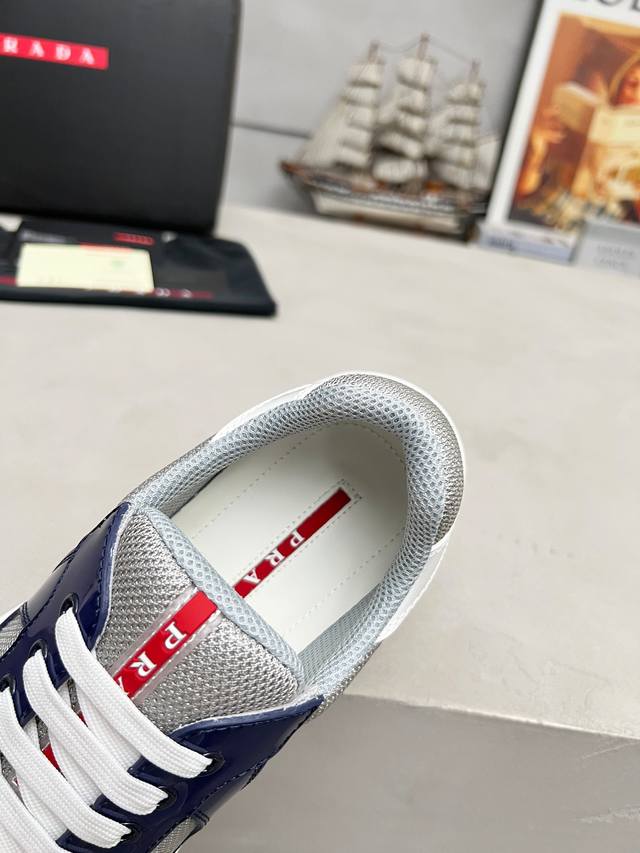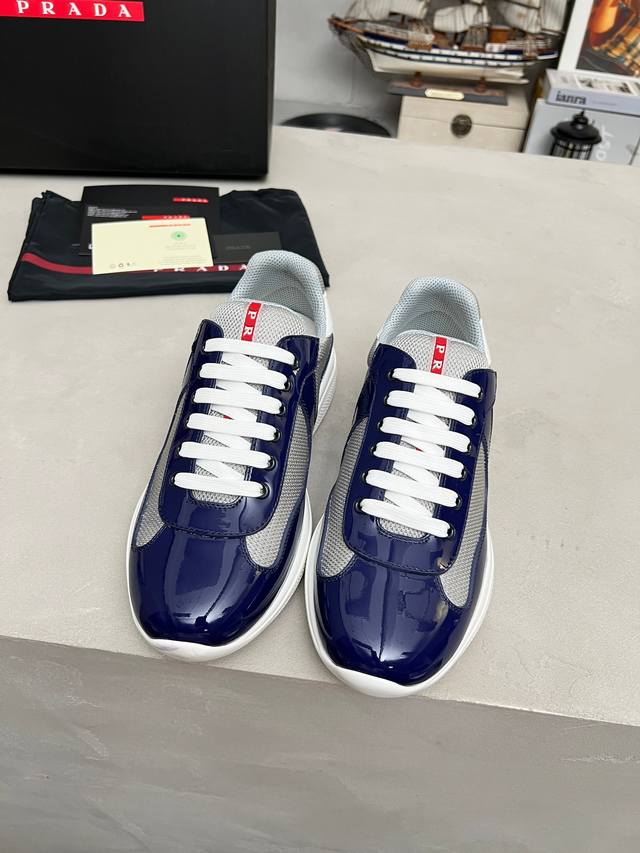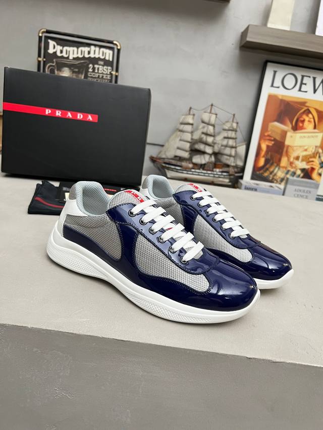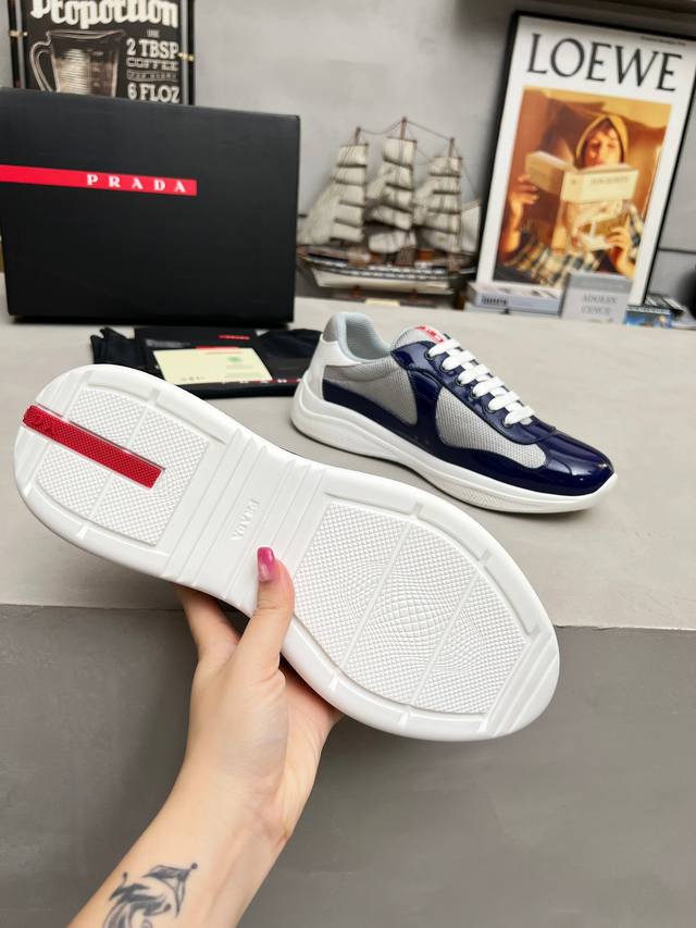 Prada top-of-the-line sneakers. Features include an imported flyknit upper with patent leather trim, sheepskin lining with cowhide tread, durable, non-slip, and lightweight outsole. Unisex style. Sizes: 35-47, 46 and 47 custom-made.