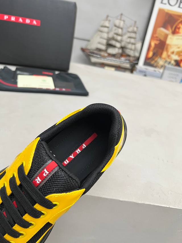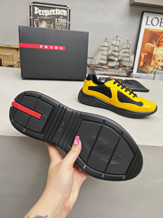 Prada top-of-the-line sneakers. Features include an imported flyknit upper with patent leather trim, sheepskin lining, cowhide tread, durable, non-slip, and lightweight outsole. Unisex style. Sizes: 35-47, 46 and 47 custom-made.
