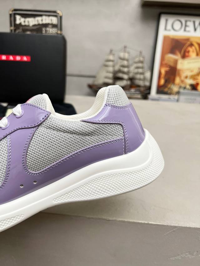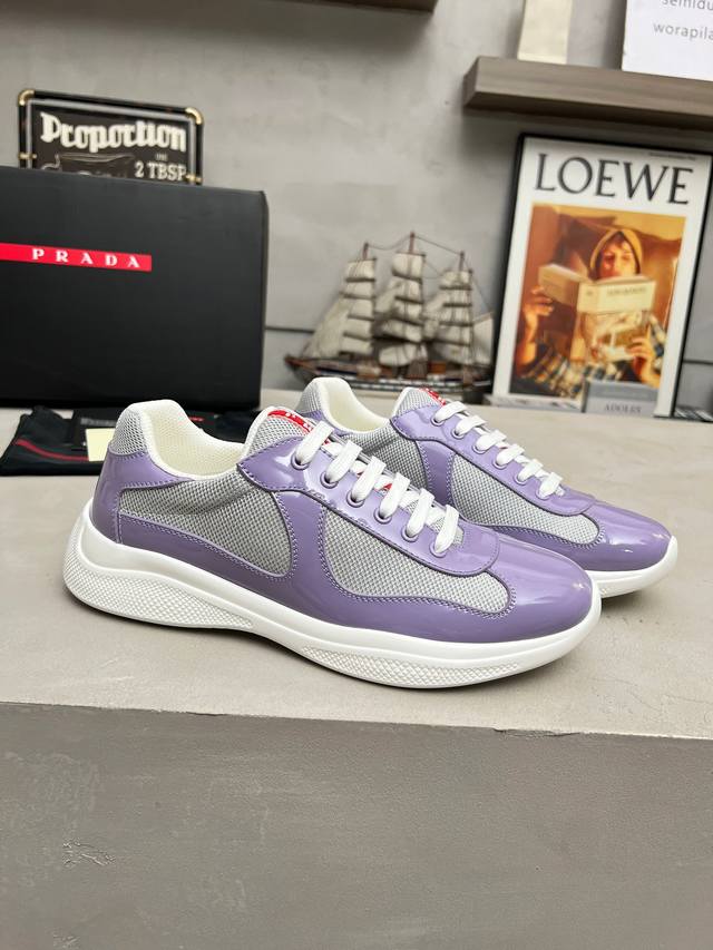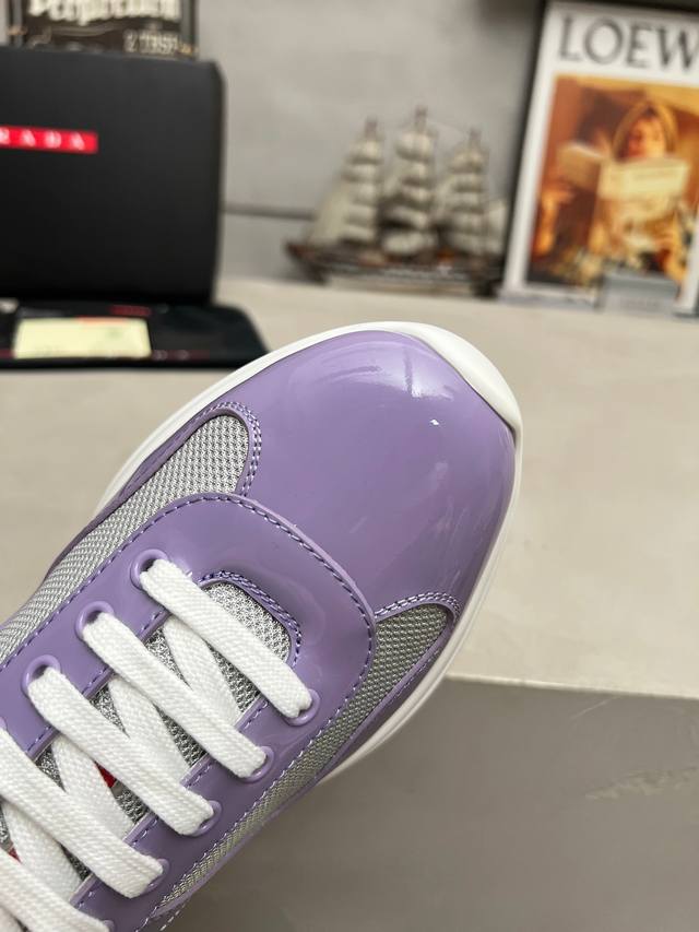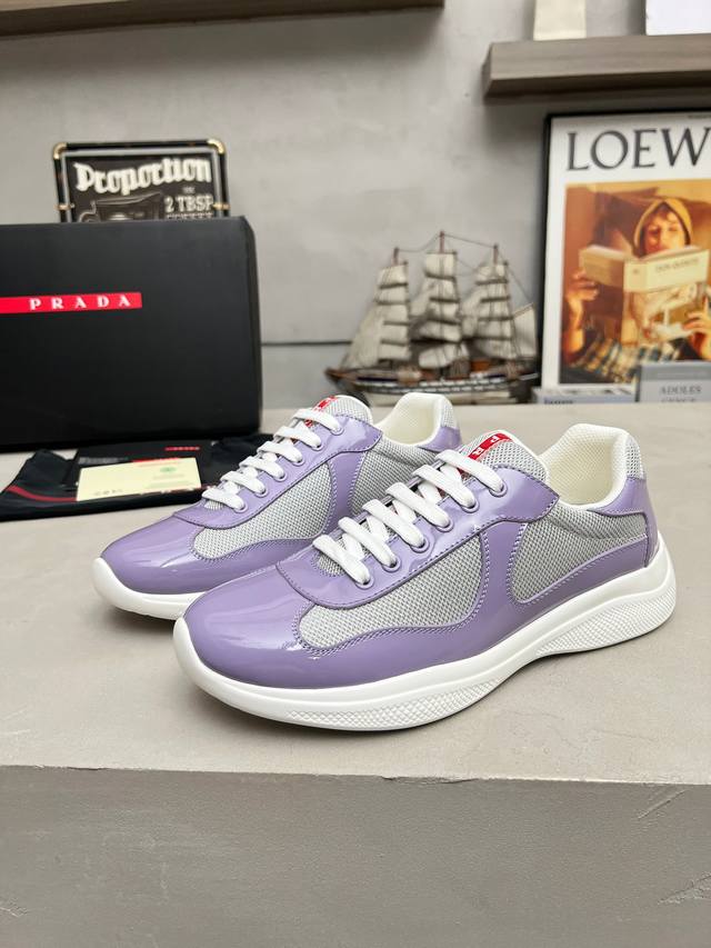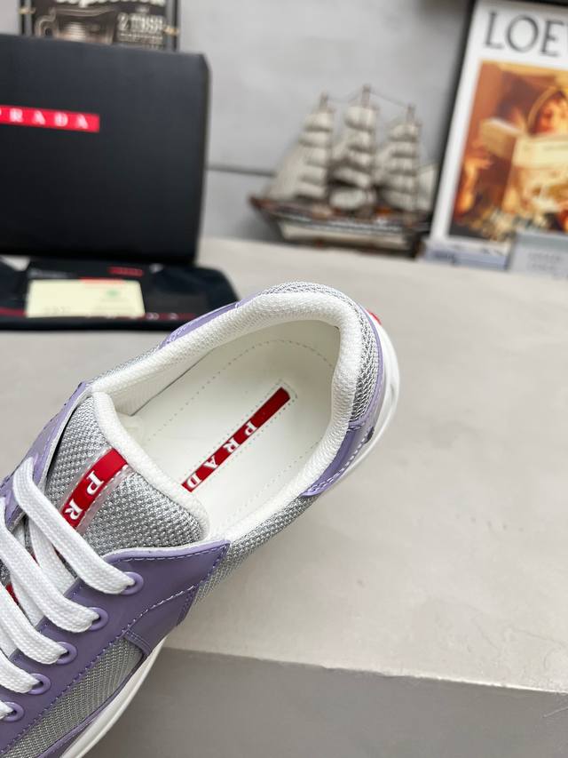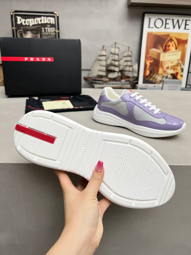 Prada top-of-the-line sneakers. Features include an imported flyknit upper with patent leather trim, sheepskin lining with cowhide treads, and a durable, non-slip, lightweight outsole. Unisex style. Sizes: 35-47, 46 and 47 custom-made.