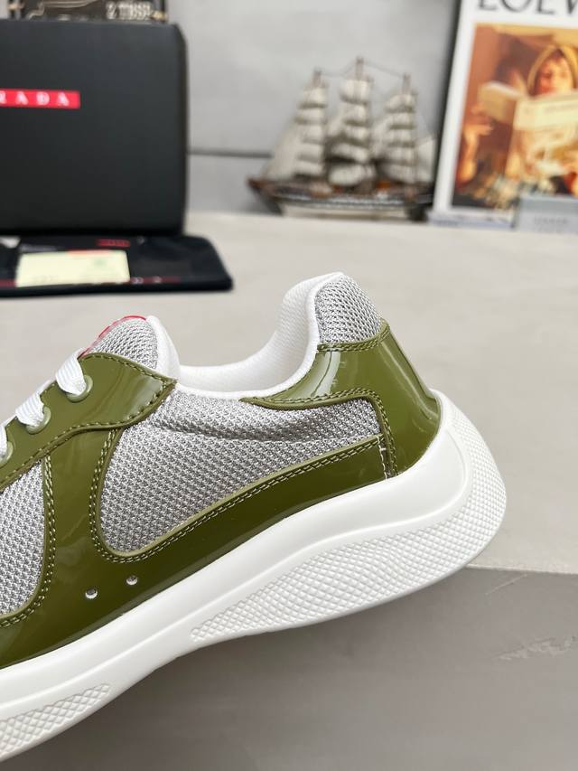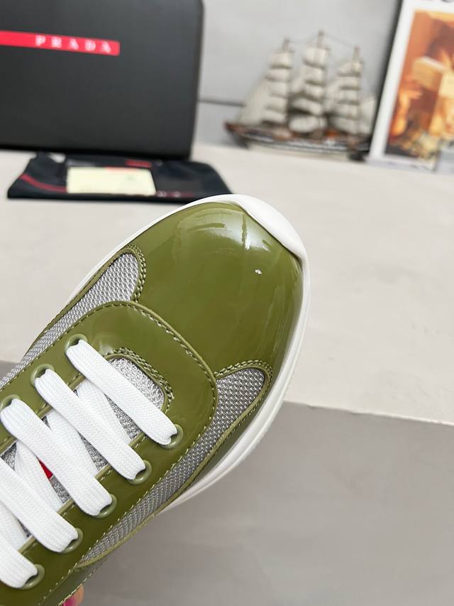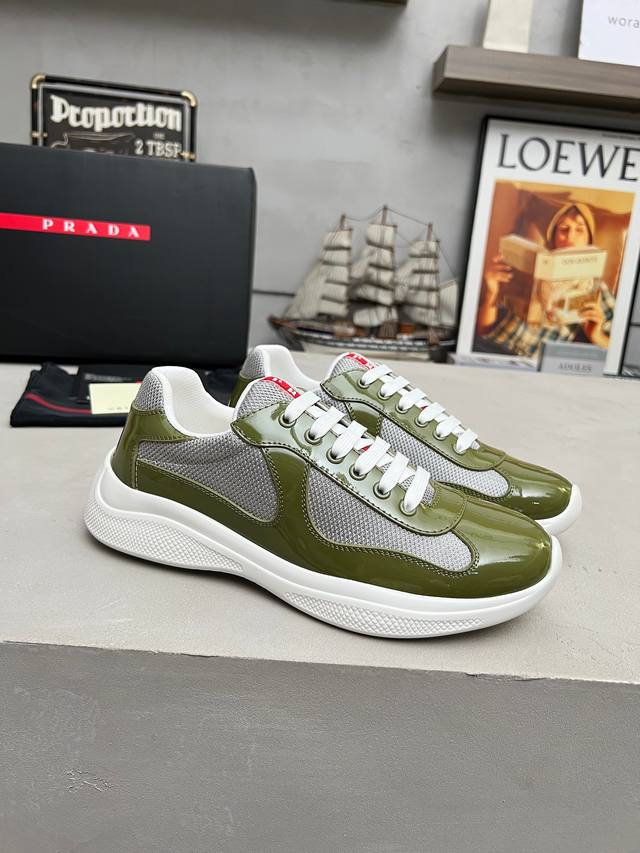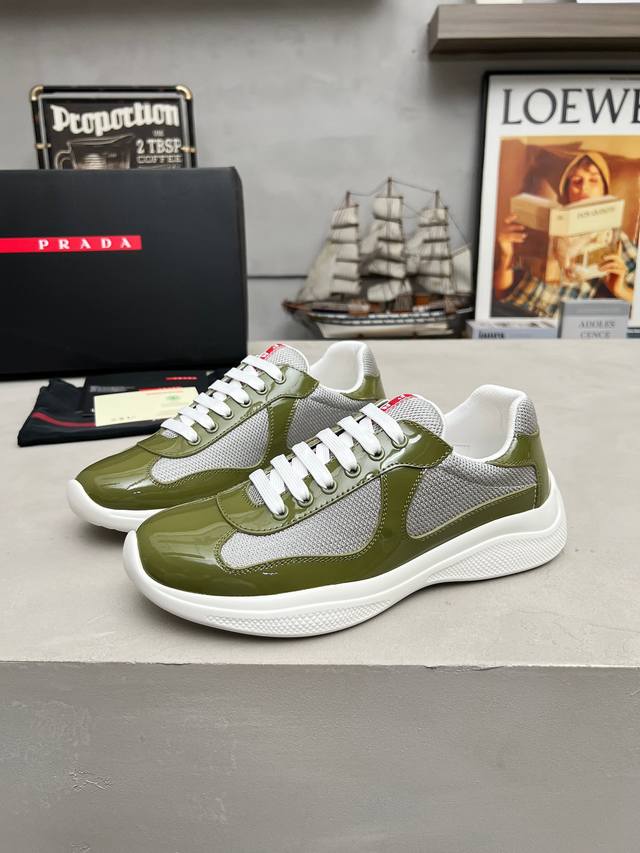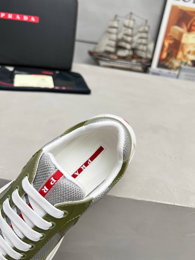 Prada top-of-the-line sneakers. Features include an imported flyknit upper with patent leather trim, sheepskin lining with cowhide tread, durable, non-slip, and lightweight outsole. Unisex style. Sizes: 35-47, 46 and 47 custom-made.