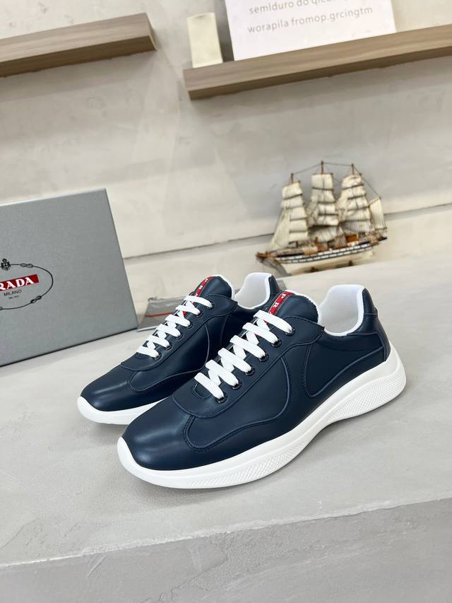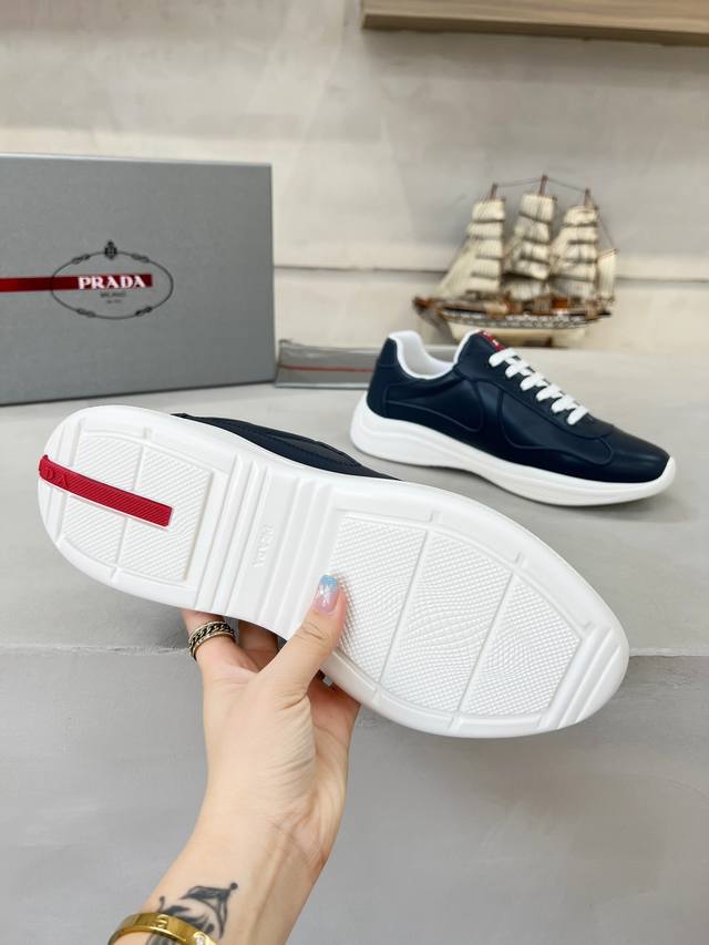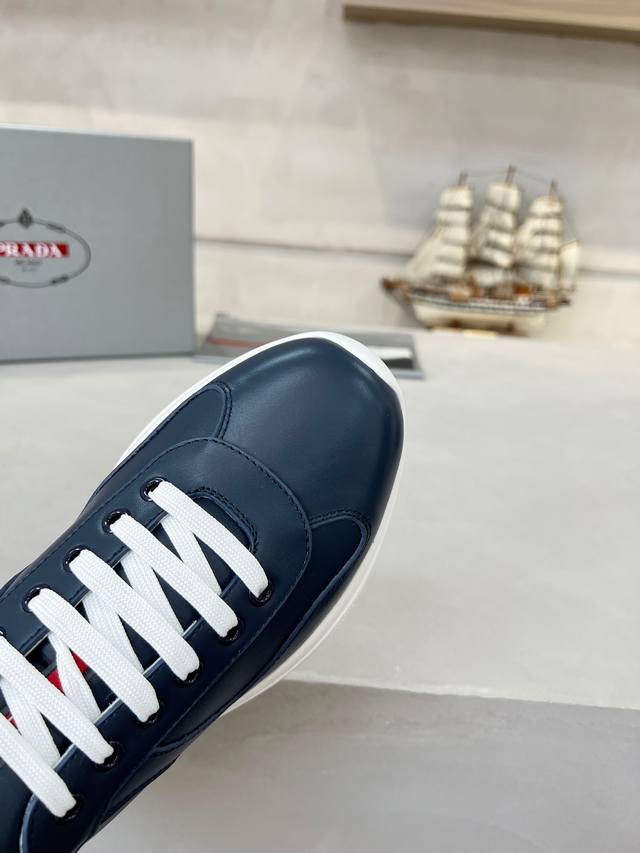 Prada top-of-the-line sneakers. Features include an imported flyknit upper with patent leather trim, sheepskin lining with cowhide gusset, durable, non-slip, and lightweight outsole. Unisex style. Sizes: 35-47, custom sizes 45, 46, and 47 available.