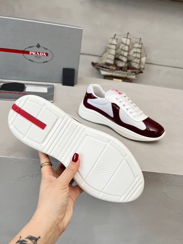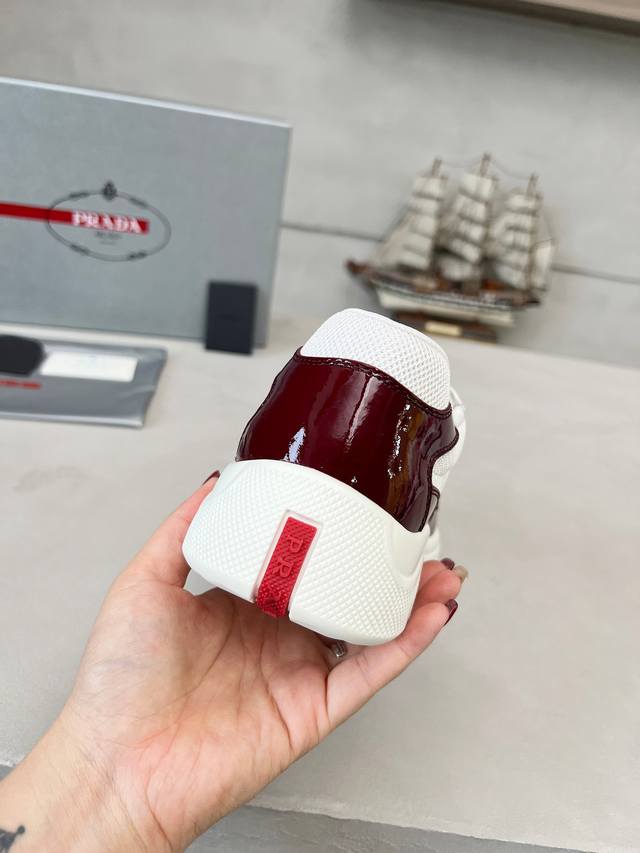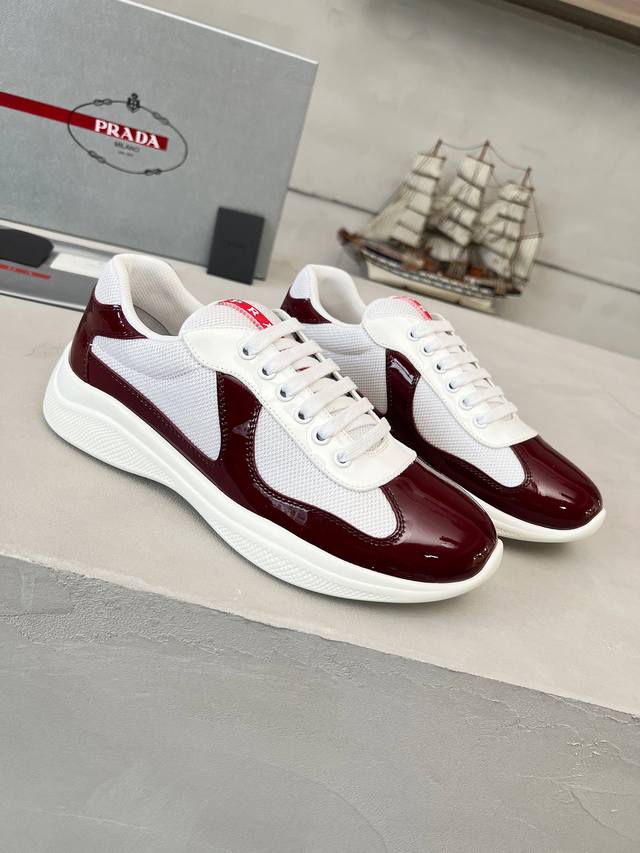 Prada top-of-the-line sneakers. Features include an imported flyknit upper with patent leather trim, sheepskin lining with cowhide gusset, durable, non-slip, and lightweight outsole. Unisex style. Sizes: 35-47, custom sizes 45, 46, and 47 available.