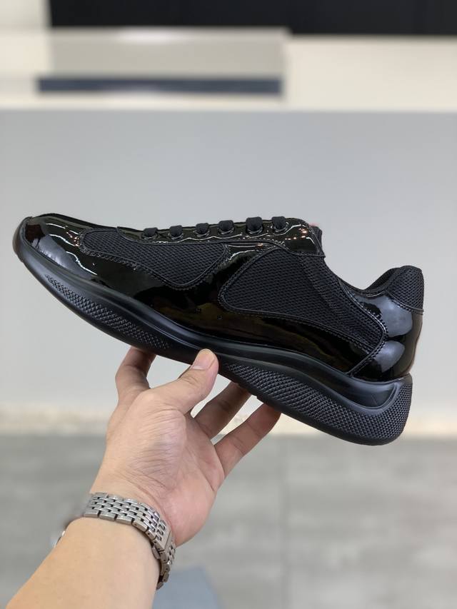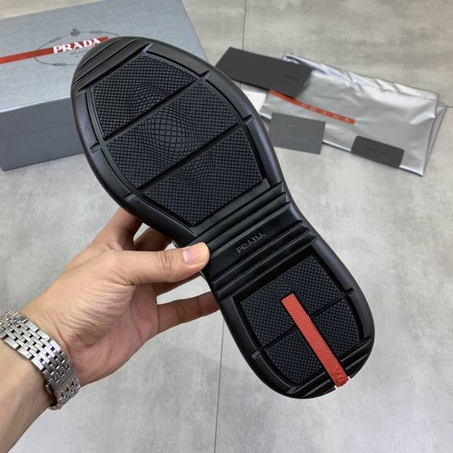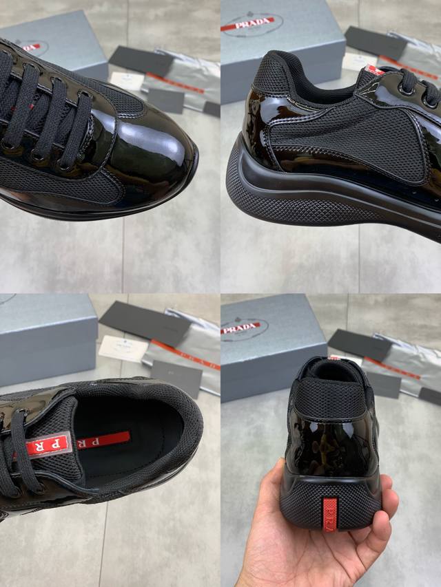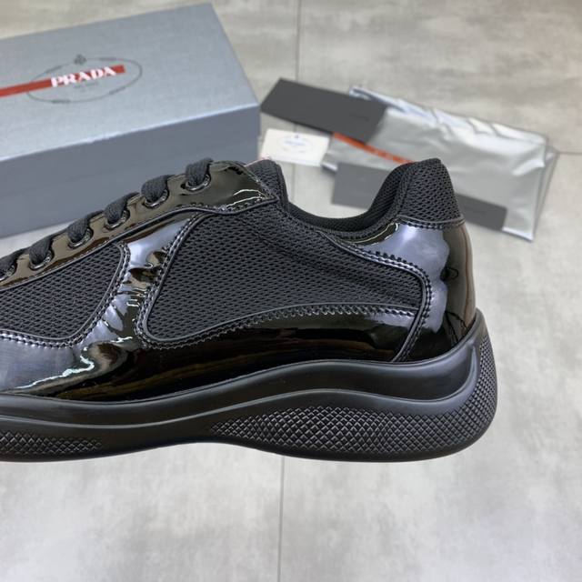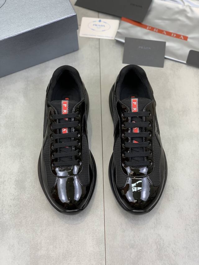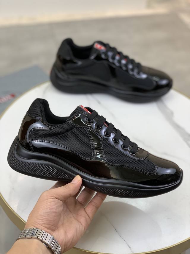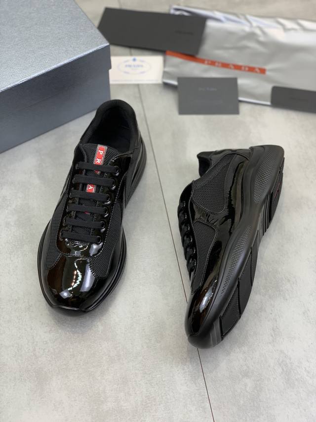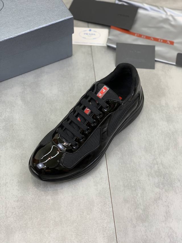 Prada top-of-the-line sneakers. Features include an imported flyknit upper with patent leather trim, sheepskin lining with cowhide gusset, durable, non-slip, and lightweight outsole. Unisex style. Sizes: 35-47. Custom sizes 45, 46, and 47 are available.