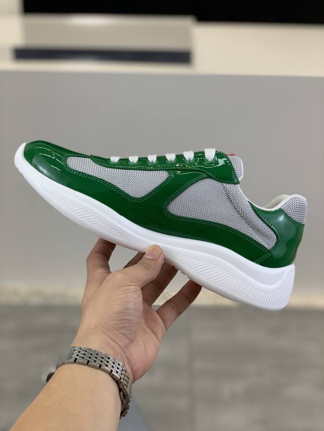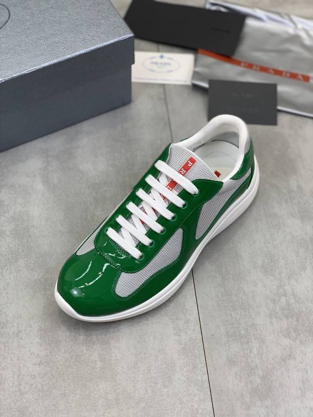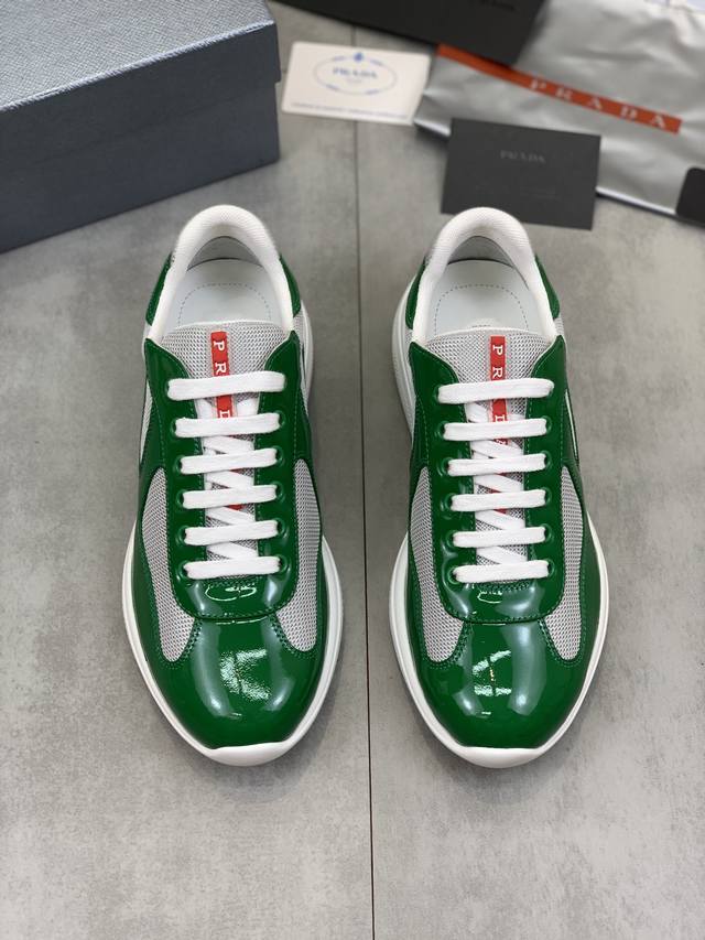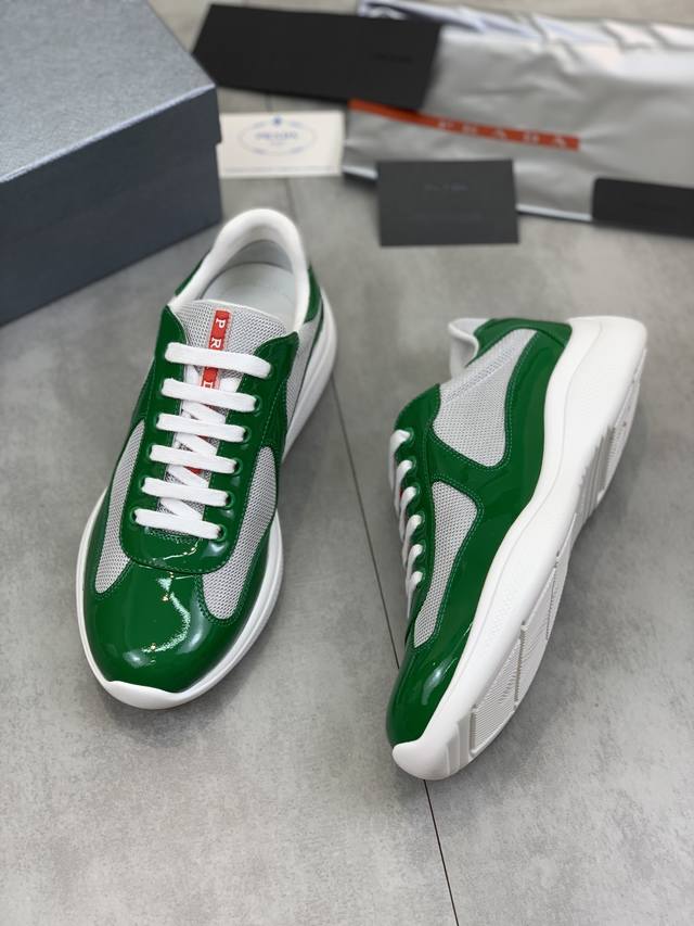 Prada top-of-the-line sneakers. Features include an imported flyknit upper with patent leather trim, sheepskin lining with cowhide gusset, durable, non-slip, and lightweight outsole. Unisex style. Sizes: 35-47. Custom sizes 45, 46, and 47 are available.