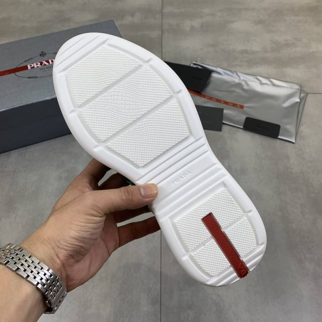 Prada top-of-the-line sneakers. Features include an imported flyknit upper with