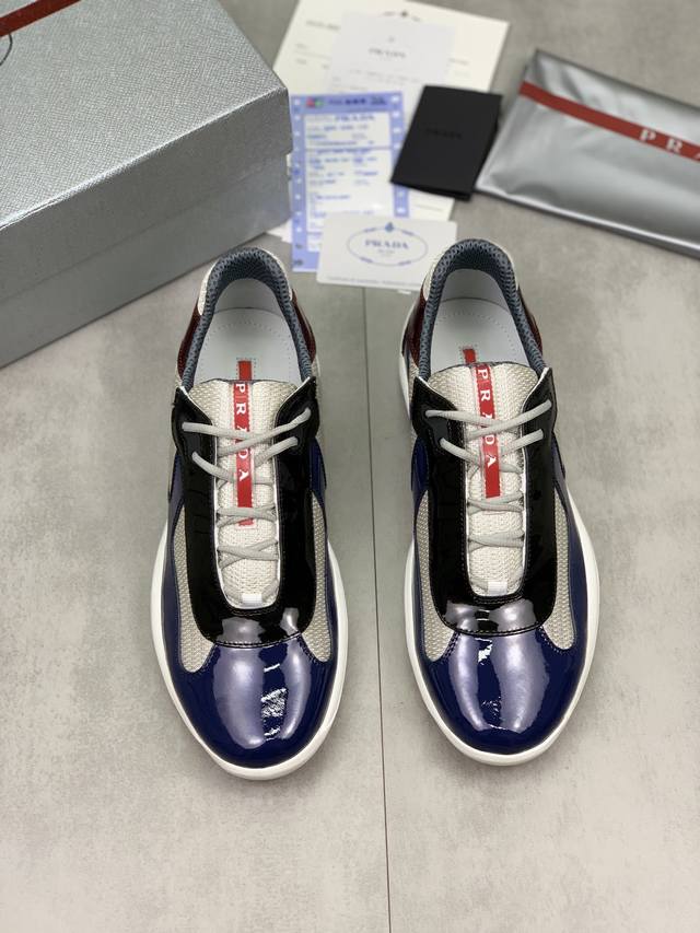 Prada top-of-the-line sneakers. Features include an imported flyknit upper with patent leather trim, sheepskin lining, cowhide tread, durable, non-slip, and lightweight outsole. Unisex style. Sizes: 35-47, 46 and 47 custom-made.