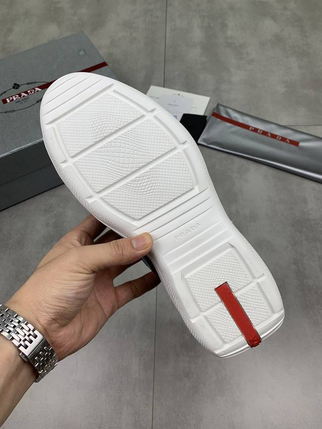 Prada top-of-the-line sneakers. Features include an imported flyknit upper with