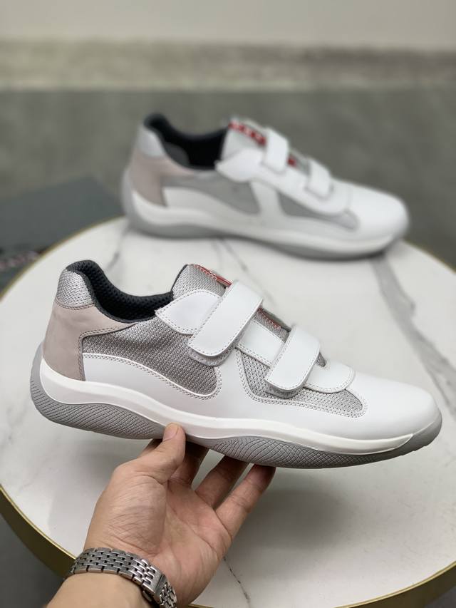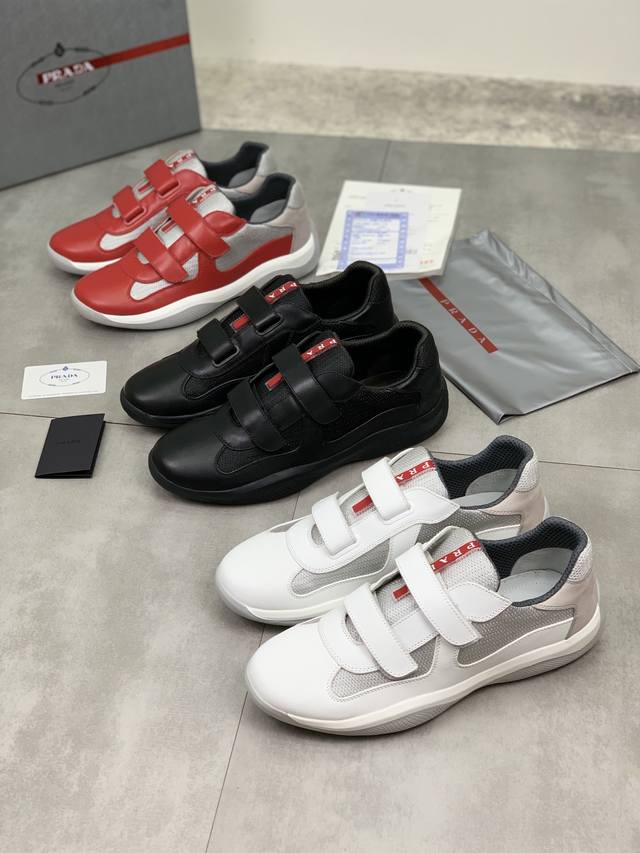 Prada top-of-the-line sneakers. Features include an imported flyknit upper with patent leather trim, sheepskin lining, cowhide tread, durable, non-slip, and lightweight outsole. Unisex style. Sizes: 35-47, 46.47 custom-made.