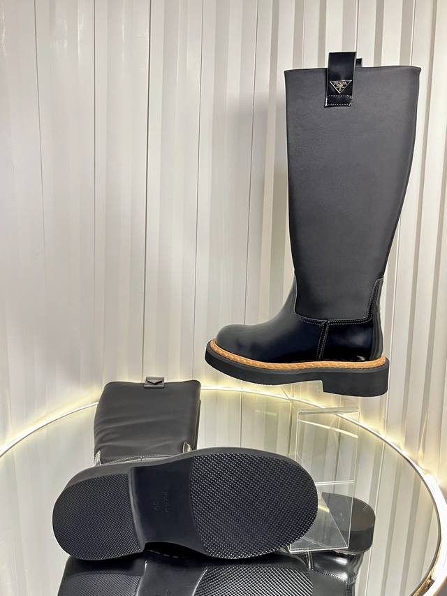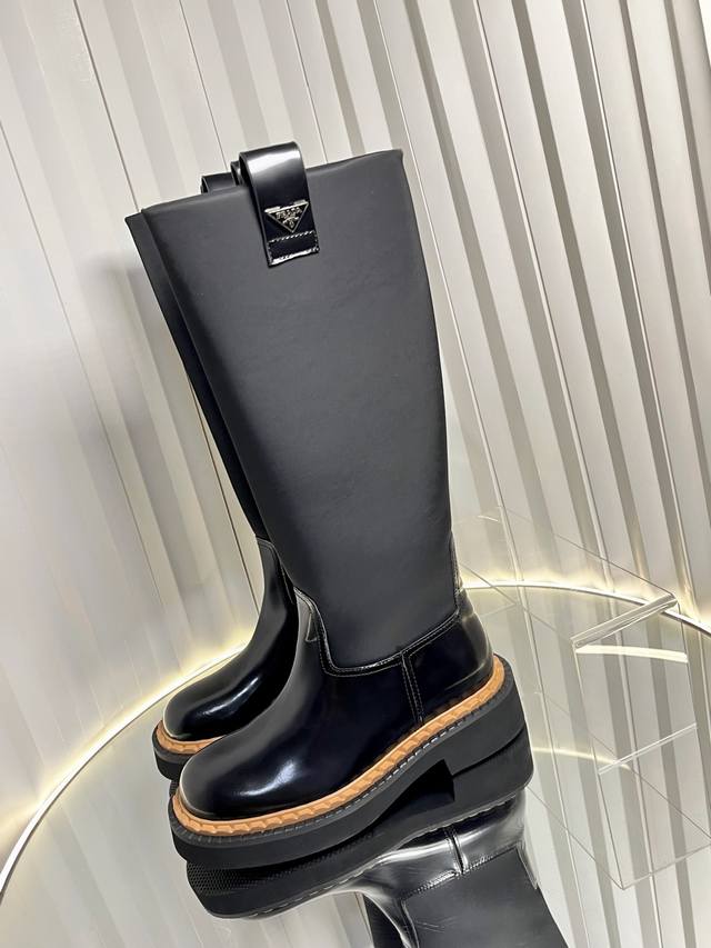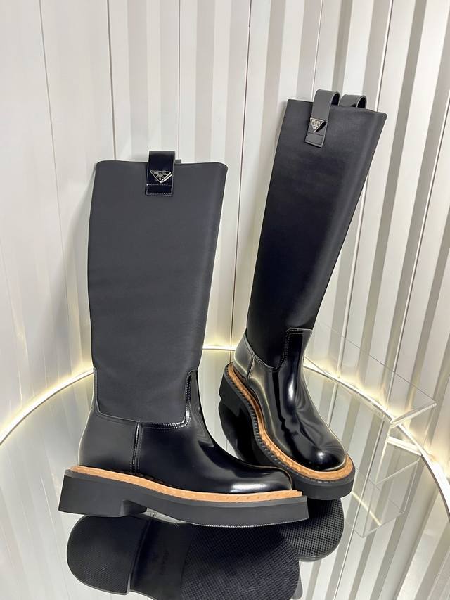 These leather short boots incorporate triangle logo details, offering a versatile style. The rubber sole is sturdy yet lightweight, showcasing both sporty style and practicality. Vintage leather, typically used in fine footwear, is reinterpreted in the Prada* collection, creating a uniquely modern mixed-and-matched design.