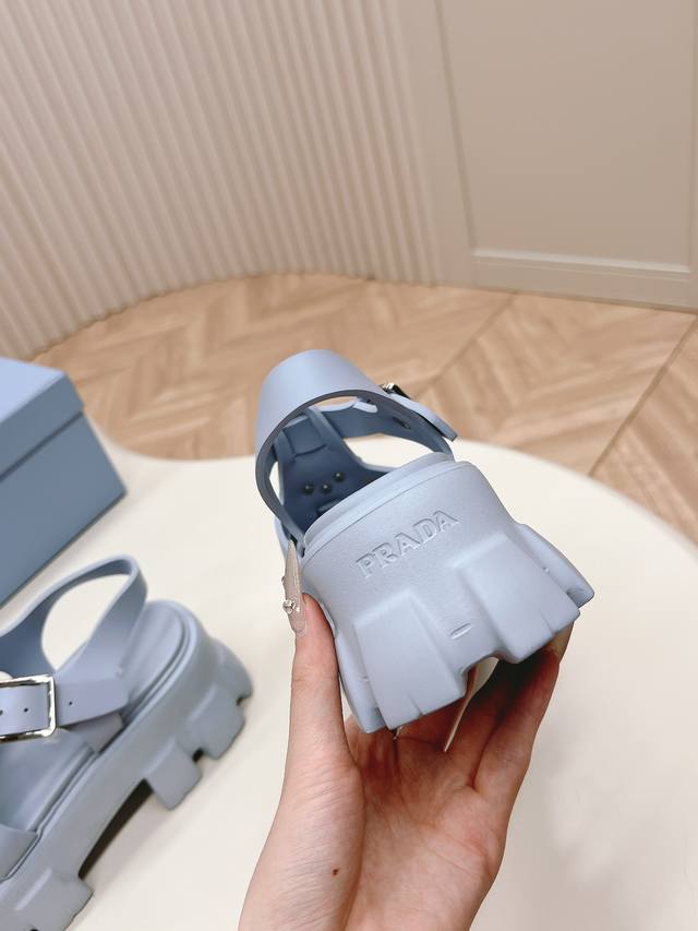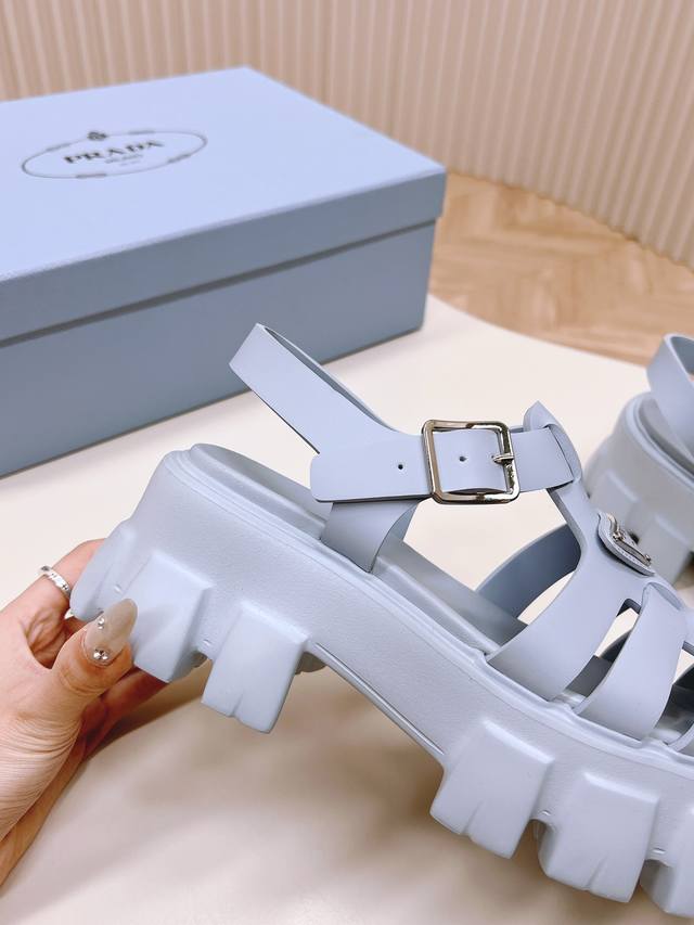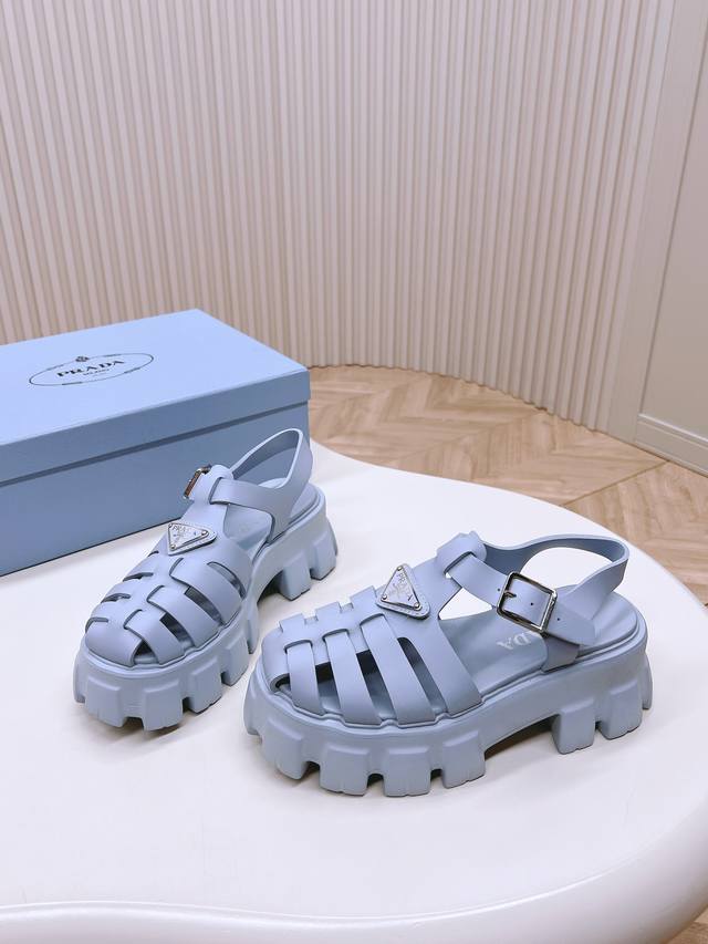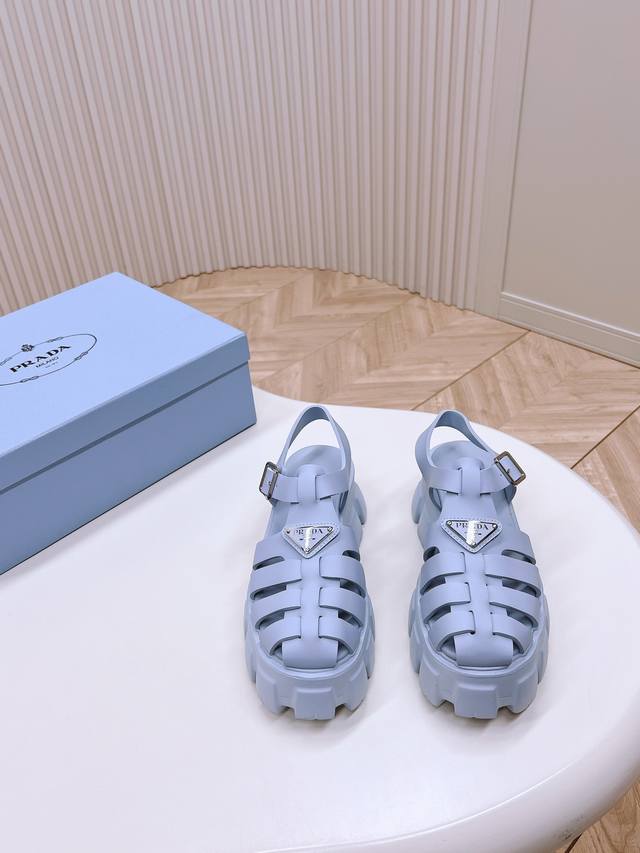 Prada upgraded full-color "Pig Cage" sandals with serrated Roman woven platform rubber soles. Retro, stylish, and avant-garde. 55mm platform sole paired with a rubber upper makes the shoes lightweight and comfortable. Vibrant colors cater to various fashionistas! The iconic metal triangle logo combined with the vintage beach sandal design ensures every element is on point! Sizes 35-40.