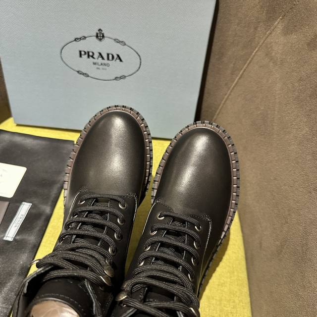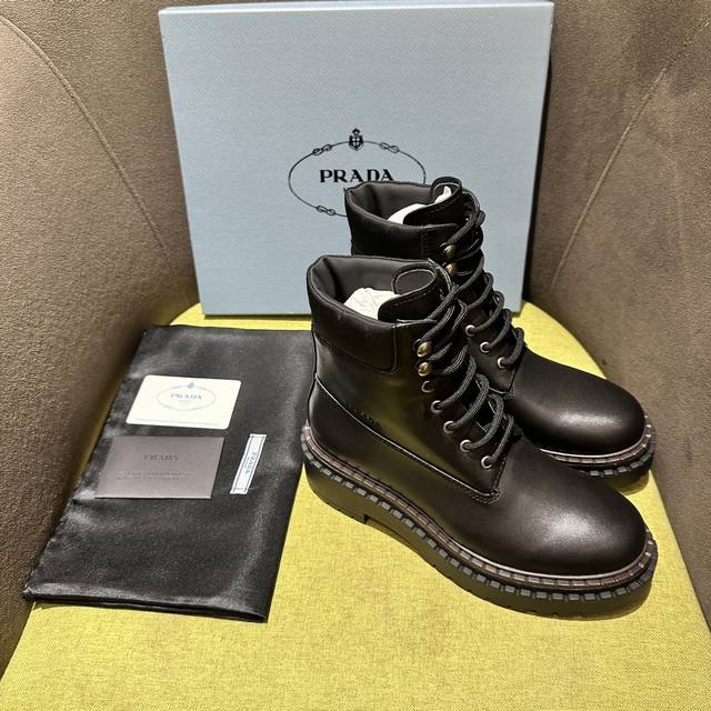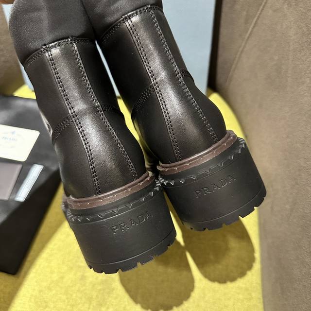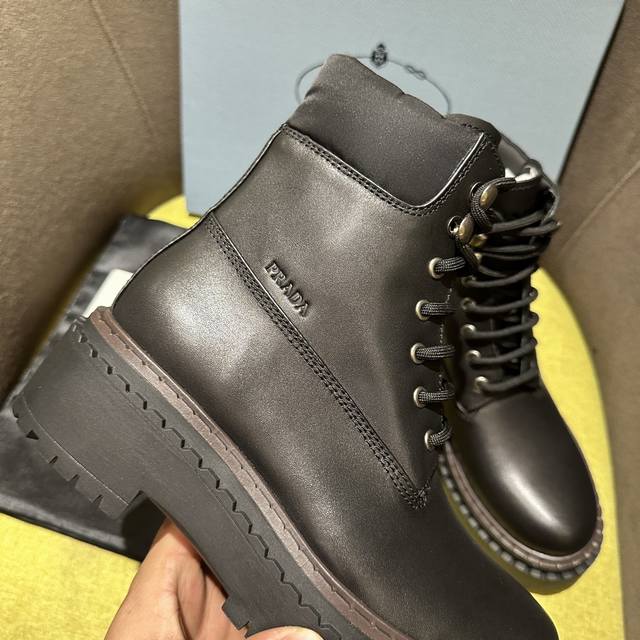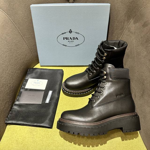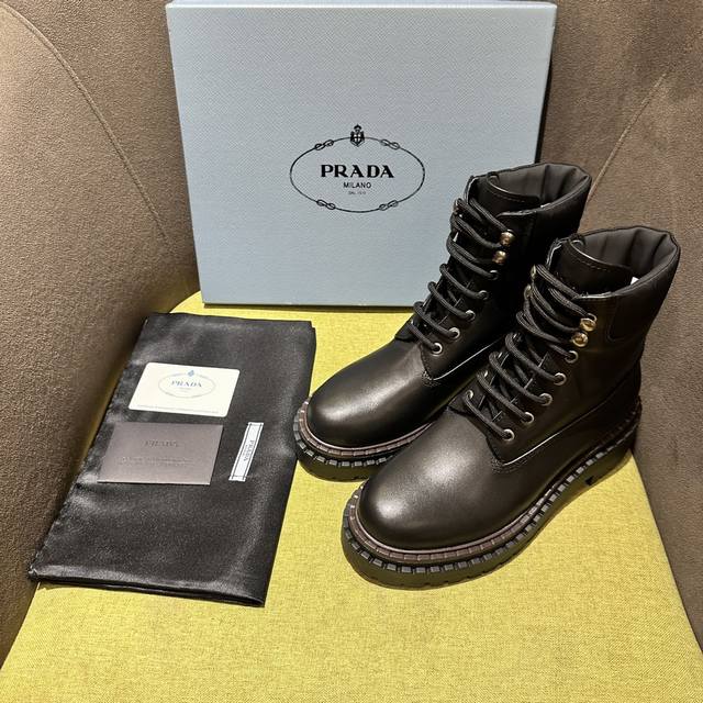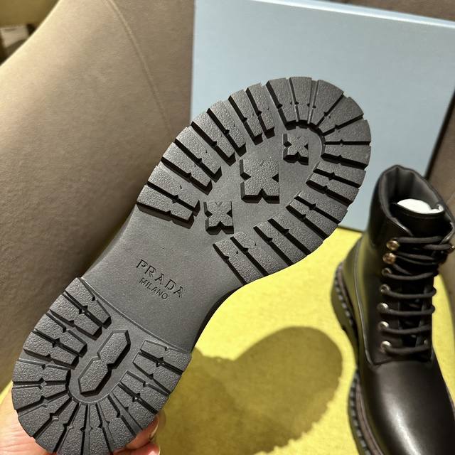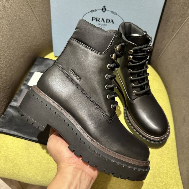 Prada Wa Fall/Winter New Classic Martin Boots. Versatile style with a thick sole, crafted details and contemporary elements add vitality, reinterpreting classic style with a new fashion language. 55mm heel height. Recommended by major bloggers on Xiaohongshu. 1-to-1 development showcases classic charm. Waxed leather, cowhide lining, TPU outsole, genuine leather welt. Sizes: 35-42. Custom orders (40-42) are non-refundable. Factory price: [Price not provided]