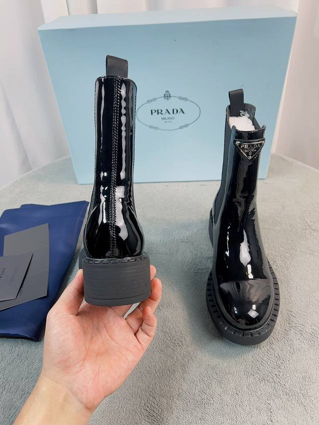 Prada's latest ankle boot series. Upper: Imported calfskin, patent leather, split-edge calfskin. Lining: Imported mixed sheepskin. Sole: 1:1 Italian original sole. Sizes: 35, 41.