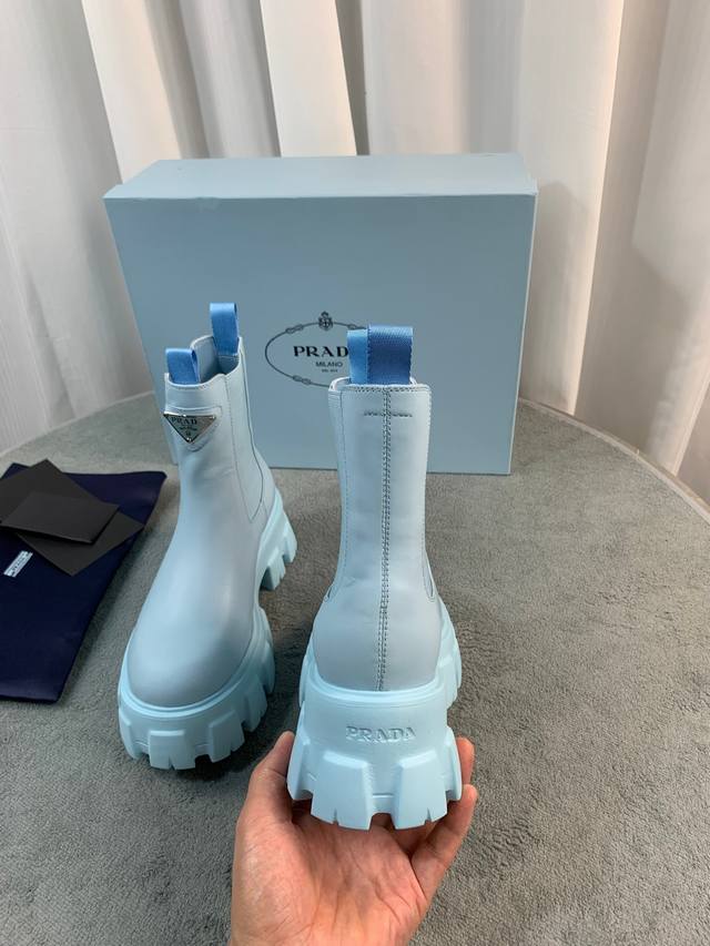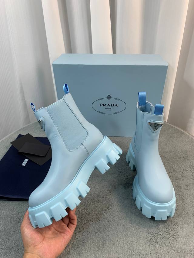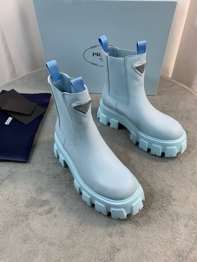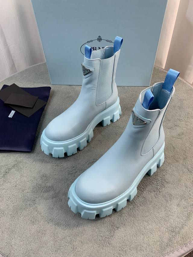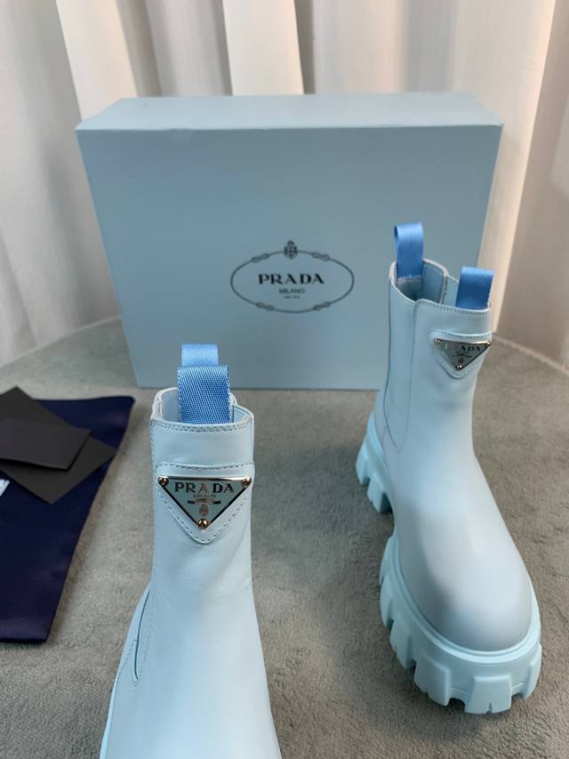 Prada's latest Fall/Winter ankle boots. Upper: Imported calfskin. Lining: Imported mixed sheepskin. Sole: Italian original TPU foam outsole. Sizes: 35-41. Available in 5 colors.