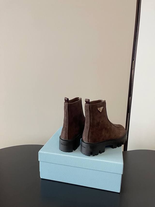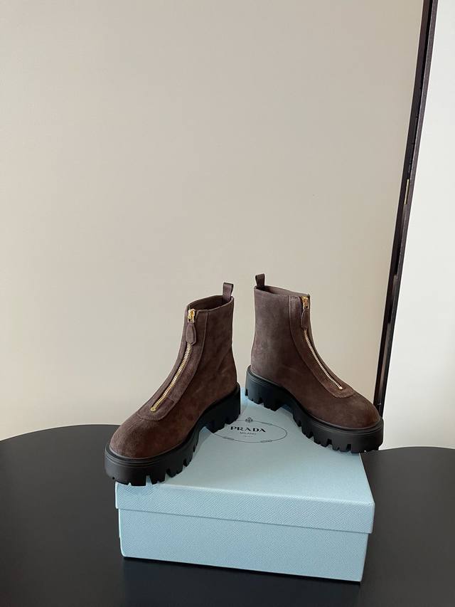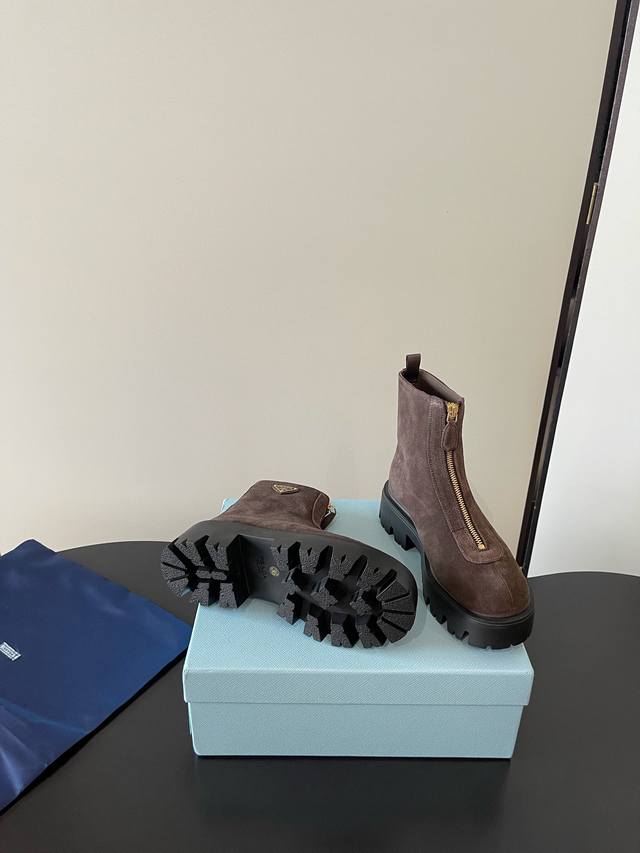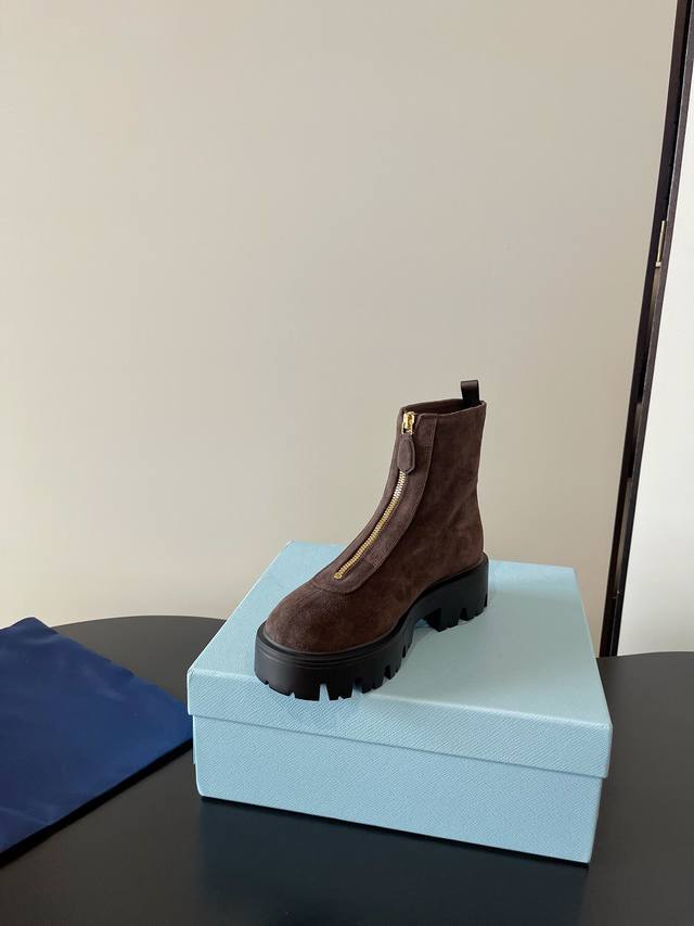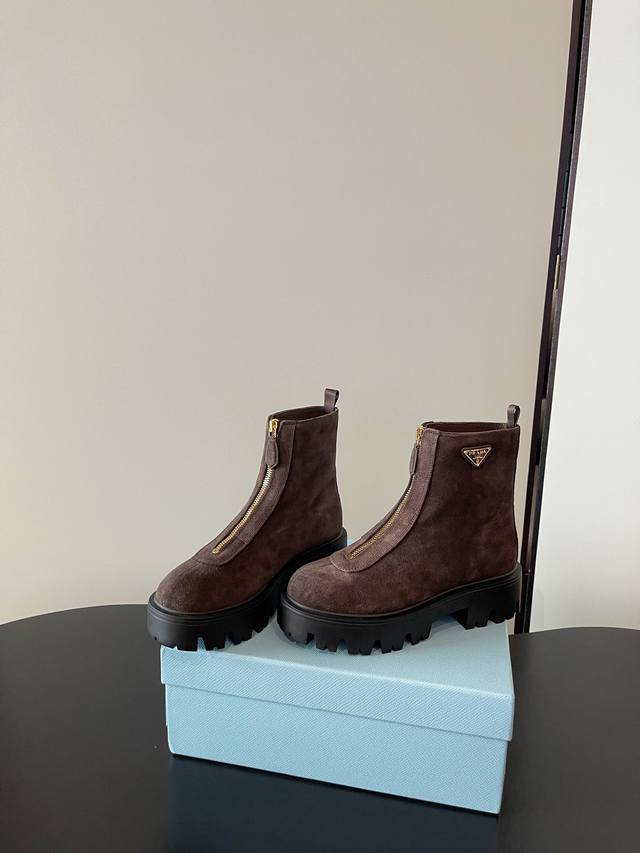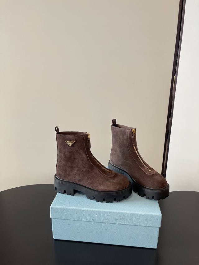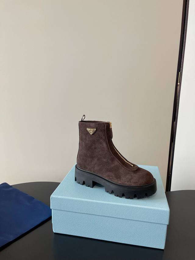 ) are embellished with the classic triangle logo, showcasing the brand's unique style. The zipper design not only adds a cool touch but also makes it easy to put on and take off. The suede material is rich in texture. Three colors, each with its own unique characteristics: gentle milk tea, cool black, and calming dark brown, are suitable for all styles.