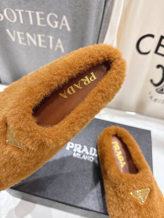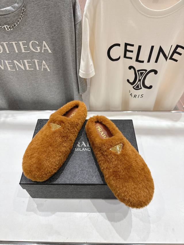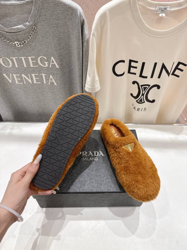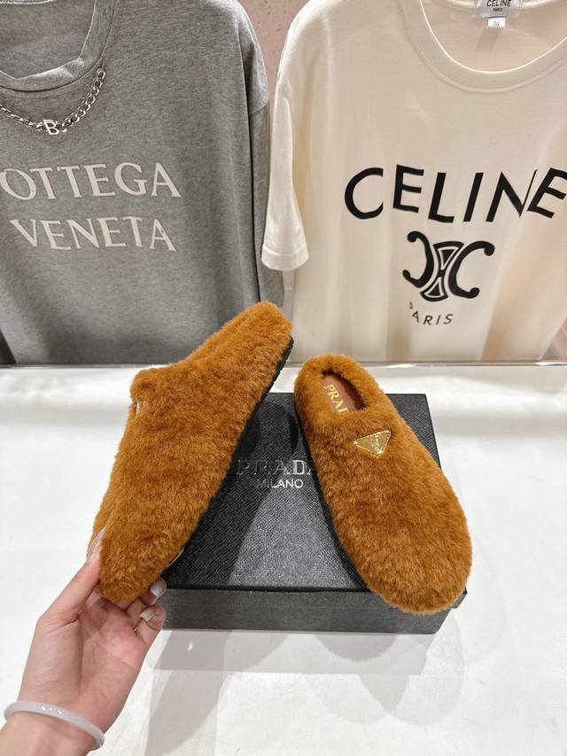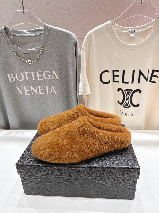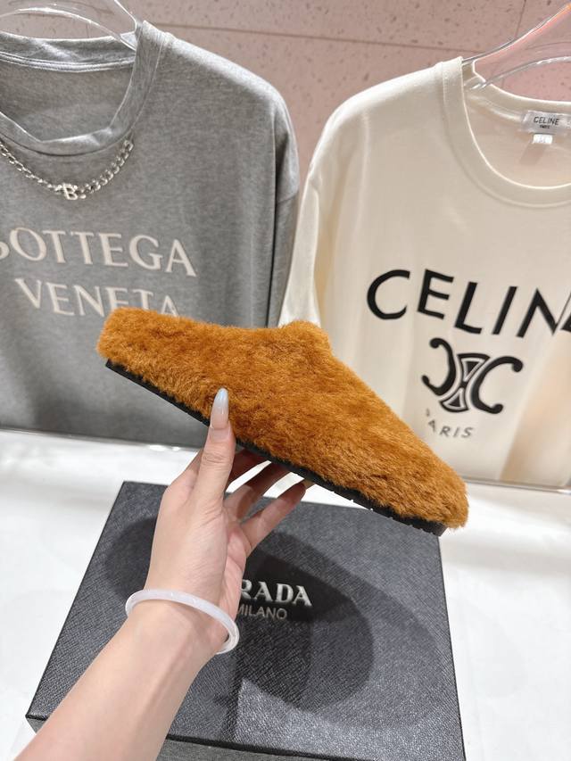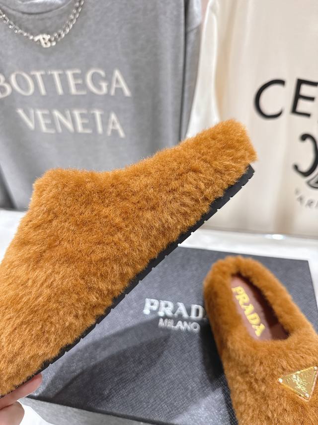Prada's new autumn/winter home slippers with half-coverage and furry soles are here! The stylish and elegant design presents a classic silhouette, making you the star of any occasion! High-grade wool fabric with flocking, sheepskin lining, original mold TPU outsole. Sizes 35-41 [40.4 customizable].