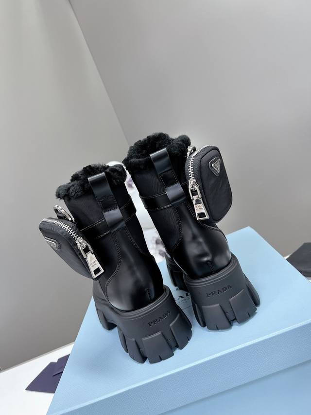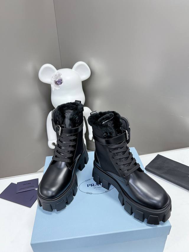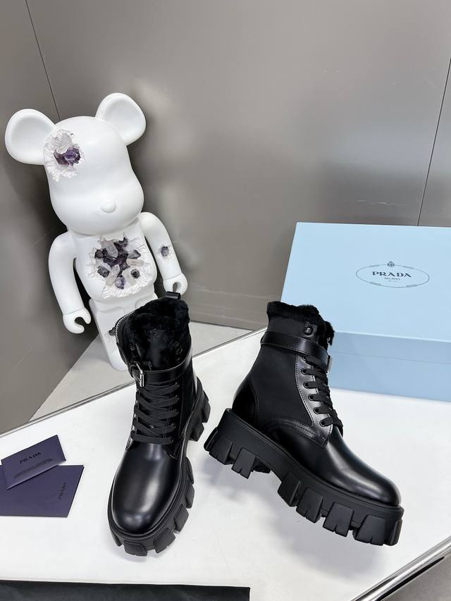 Prada's newest wool ankle boots with a thick sole, part of the Prada Spring/Summer runway and online show's "Dreamy Night City" collection. Prada boots are perfect for important occasions, offering a fresh and sophisticated look with a touch of luxury. They look stunning on the feet and are incredibly stylish. The shoes are elegant and sophisticated, with a crystal-clear finish. Regardless of the materials used, each accessory is unique and custom-made, ensuring zero deviation from the original. The entire collection is filled with exciting and unexpected combinations of elements, showcasing different materials and textured fabrics, creating a strong artistic feel and allowing you to experience a unique Prada style. 1. Upper: Matte imported lace trim; 2. Lining: Imported wool lining; 3. Outsole: Original Italian TPU; 4. Wool insole; Dimensions: 35M-40M (