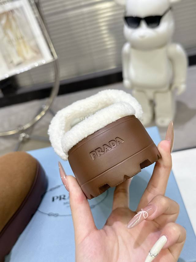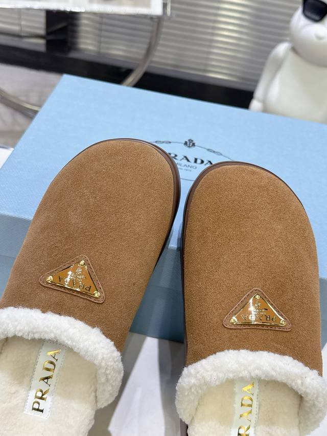 Prada's popular Fall/Winter closed-toe fur slippers. A runway item, suitable for indoor use in winter and outdoor use in early spring. These sheepskin slippers feature an ultra-lightweight rubber Ip foam sole, soft sheepskin quilted pattern echoing the iconic Prada triangle, and an enamel triangular metal logo for added style. Made with imported high-gloss cow suede, imported knitted wool, genuine wool insole, enamel triangular metal logo, 6cm ultra-lightweight rubber foam sole, and studded sole pattern. Sizes 35-40. Suitable for early spring. Recommended pairings: cotton stretch leggings, wool sweater, lightweight down jacket.