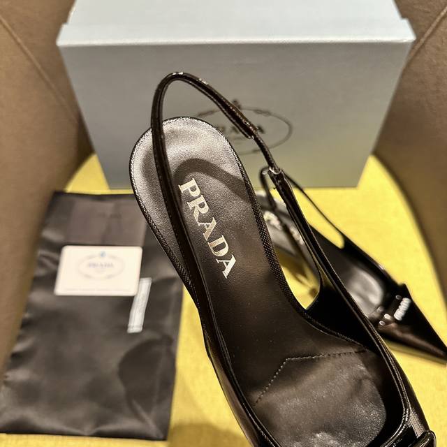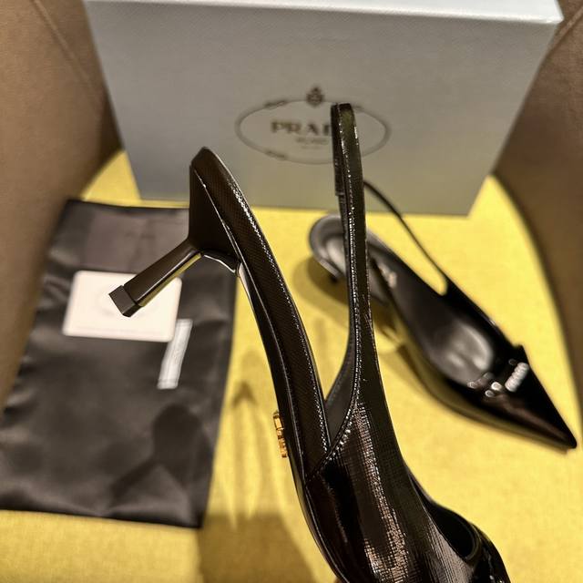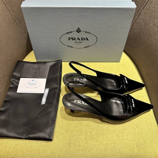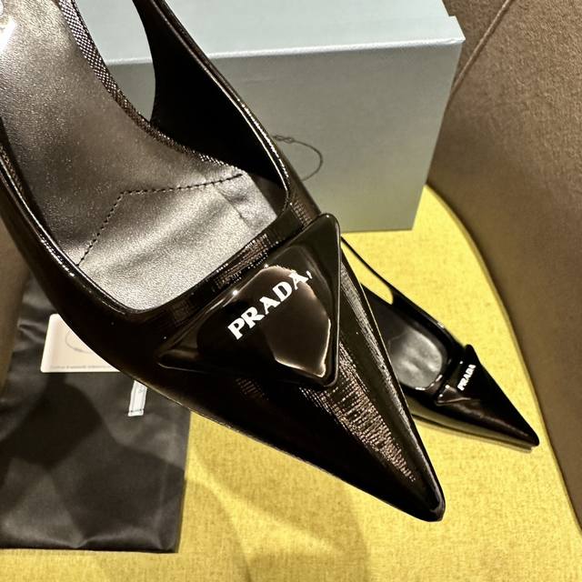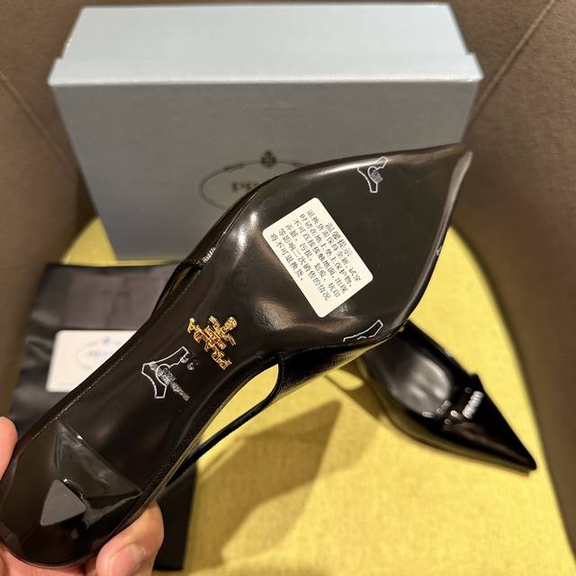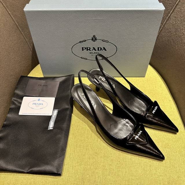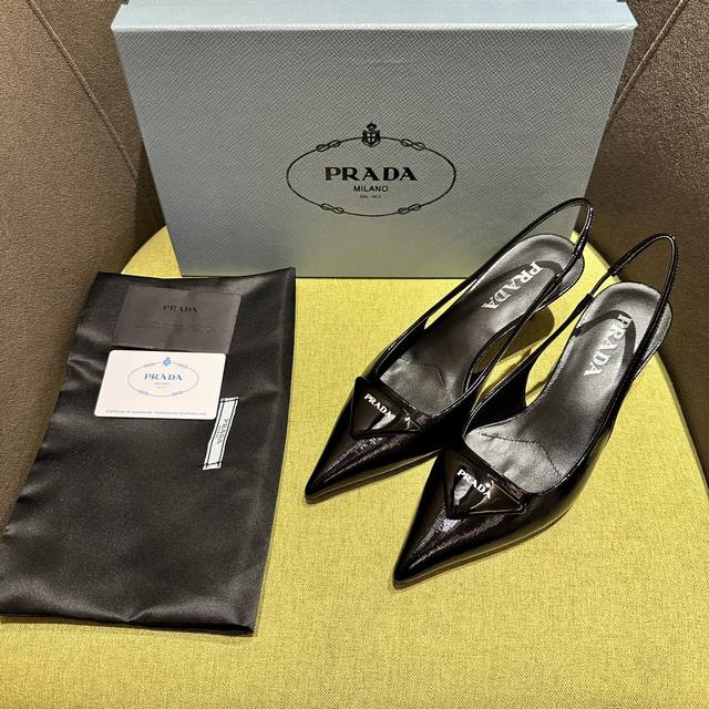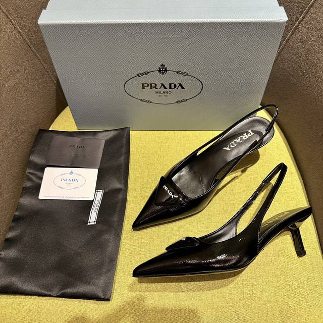 Prada's Spring/Summer Saffiano Patent Leather Slingback Heels have arrived! Recommended by numerous bloggers on Xiaohongshu, these exquisite leather sandals combine fashionable elegance with a minimalist style. The slender, tapered design features a pointed toe and a medium-height stiletto heel, adorned with a handcrafted triangular buckle and a triangular logo, showcasing classic charm. Heel height: 5.5cm. Material: Cross-grain patent leather, sheepskin lining, Italian genuine leather sole. Sizes: 35-42 (40-42 sizes are custom-made and non-refundable). Factory price: [Price not specified]