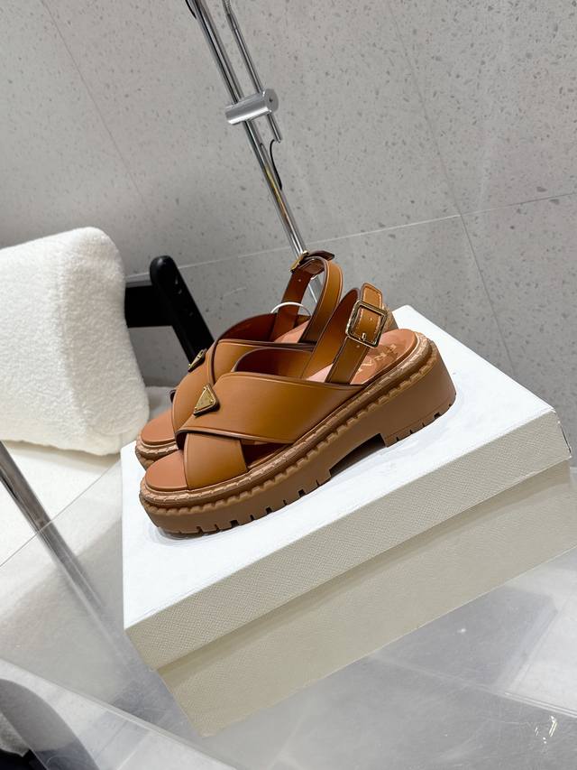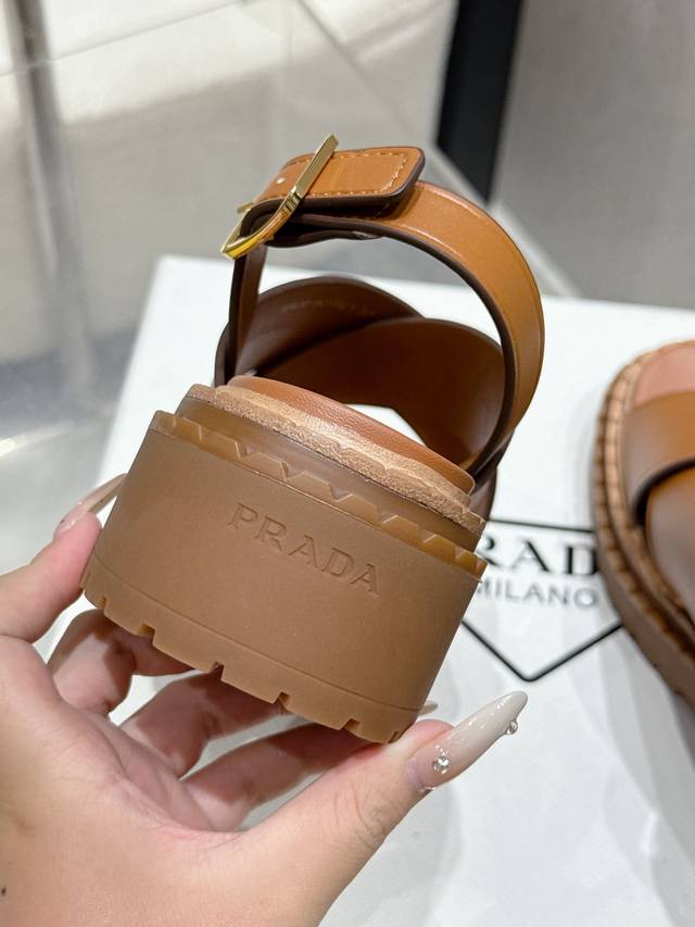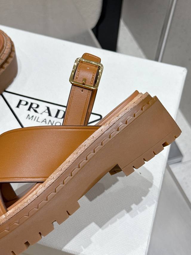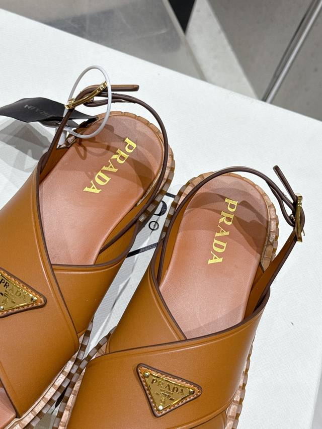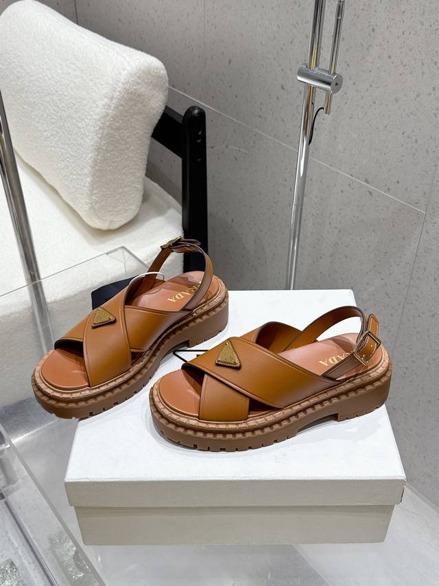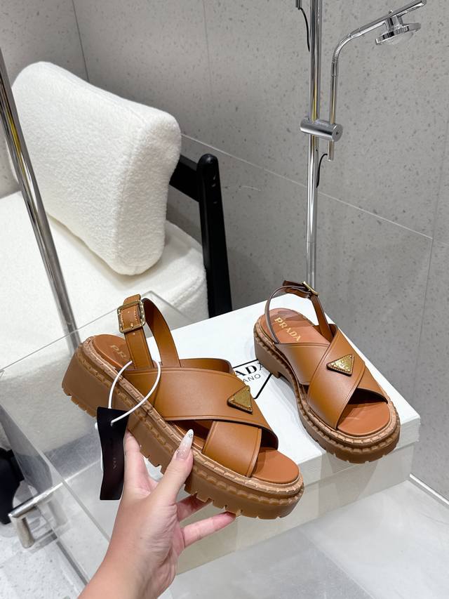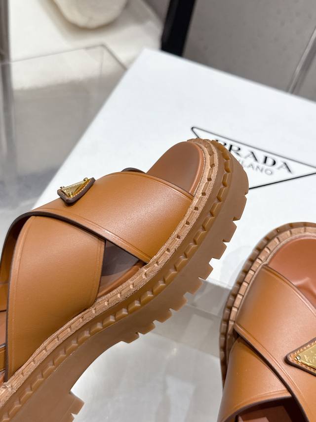 Prada's latest 2025 spring/summer thick-soled cross-shoe sandals. The TPU-infused outsole makes the shoe lightweight and comfortable, and the vibrant colors of the genuine leather trims provide a variety of options for fashionable individuals with different styles! The iconic metal triangle