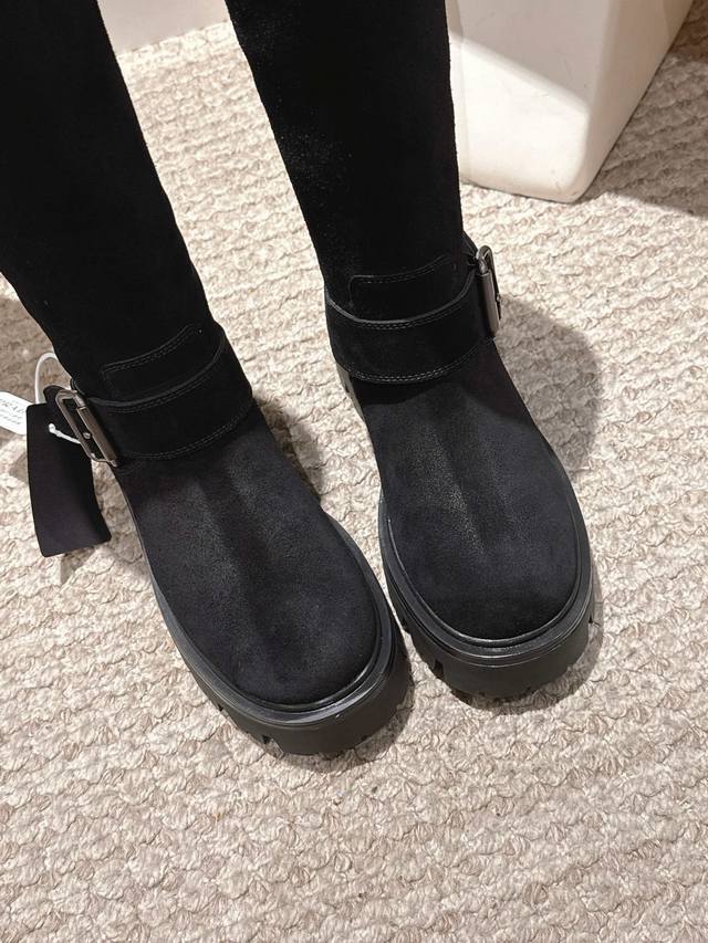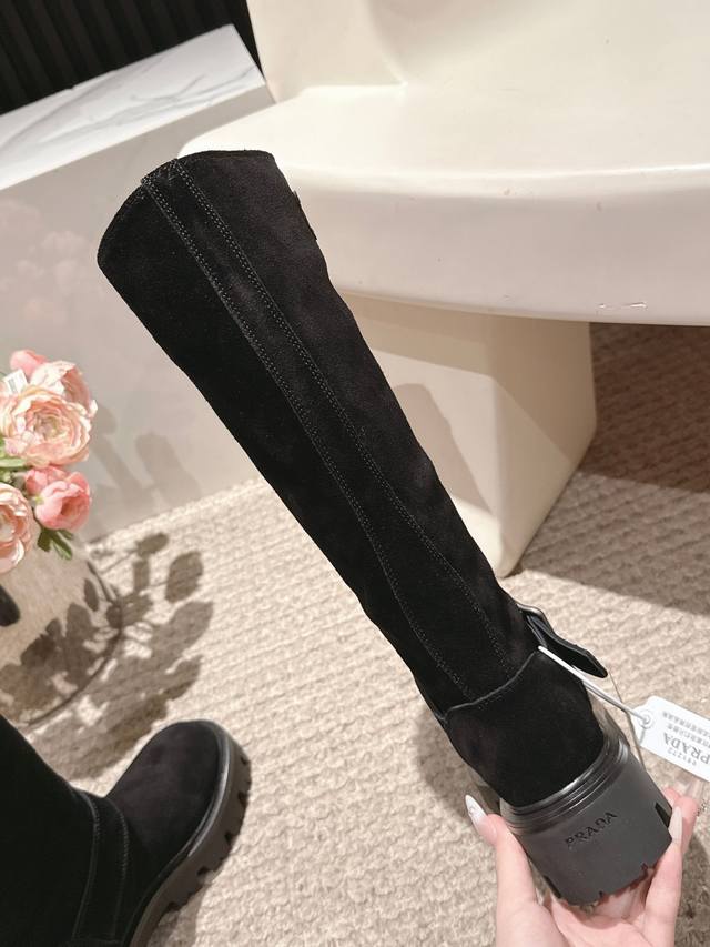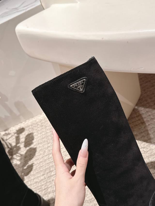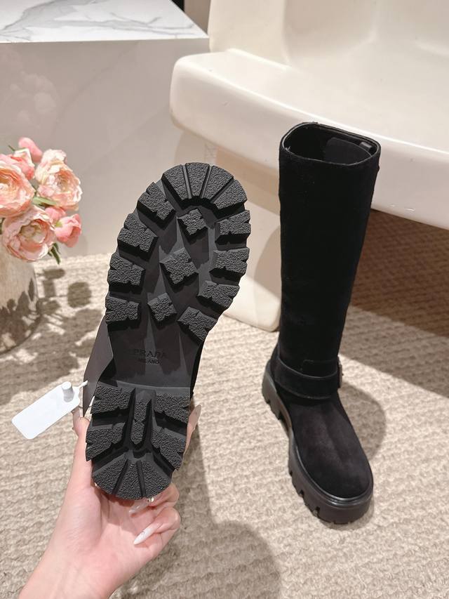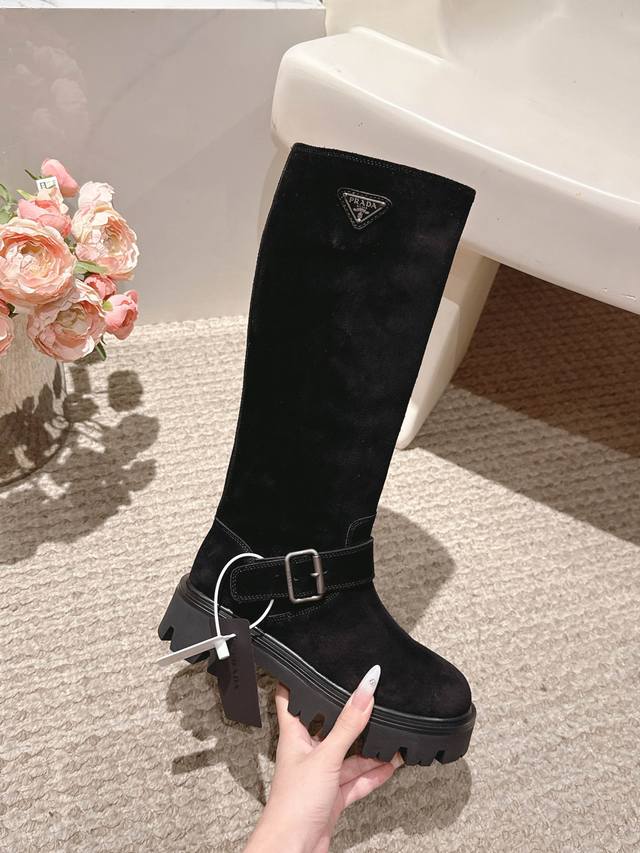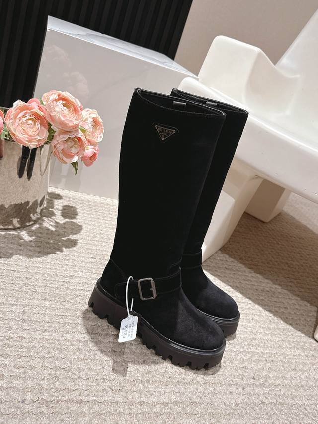 . Prada's latest triangle logo and belt buckle mid-calf Martin boots are a truly timeless style.