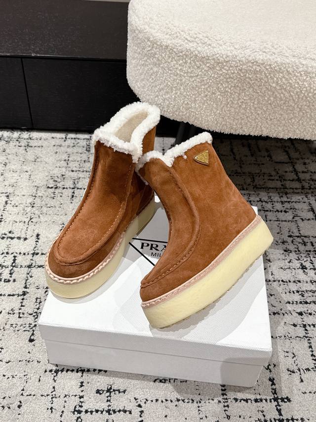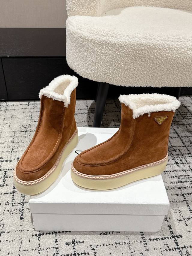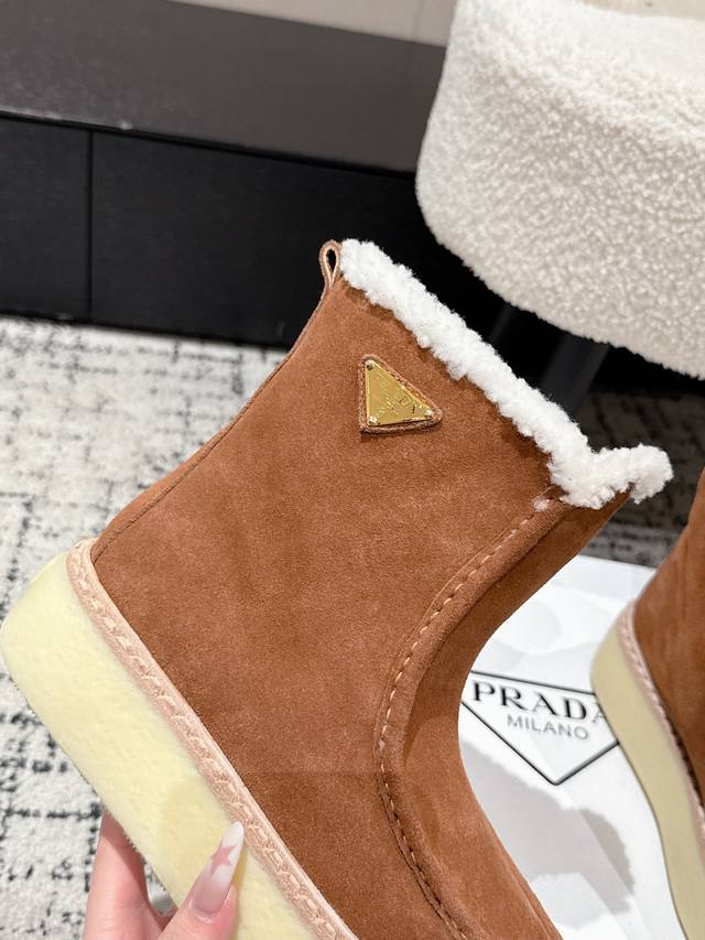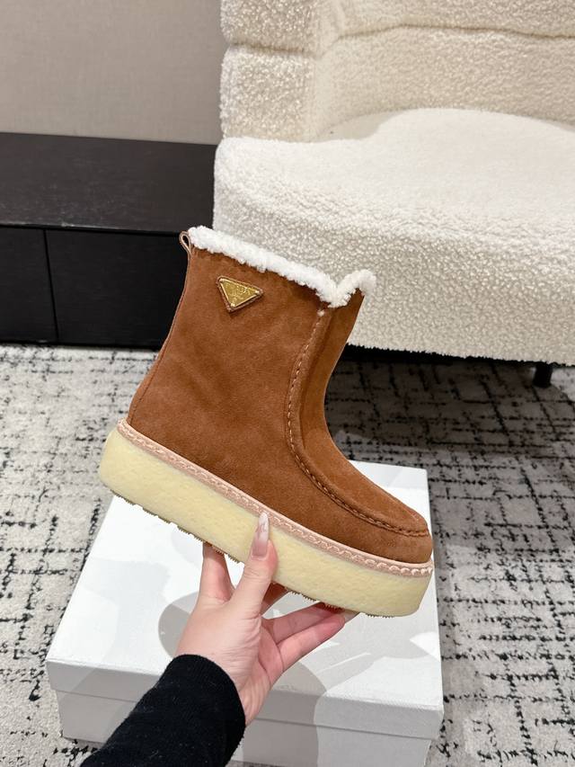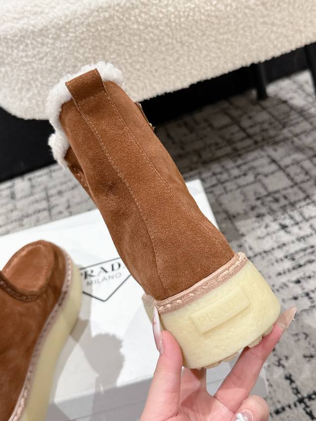 Retail Item DDD Prada 25 Latest Thick-Soled Snow Boots DDD These snow boots continue the timeless silhouette, a new classic piece crafted from exquisite suede, enhancing their style. Lightweight and featuring a triangular buckle logo and a 5cm thick sole, they are suitable for all seasons and can be paired with various casual looks. In an era saturated with eye-catching styles, these boots are the most enduring companions, gradually winning hearts. DDD Material: Imported suede DDD Lining: Australian imported lamb wool DDD Outsole: TPU non-slip outsole + genuine leather welt DDD Sole thickness: 5cm DDD Size: #35-41 40 41 Made to order, no returns or exchanges DDD