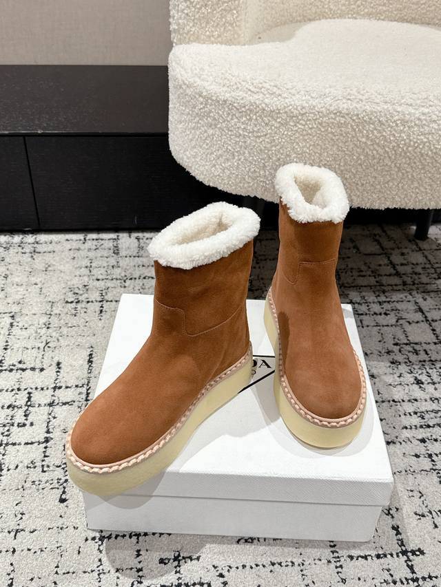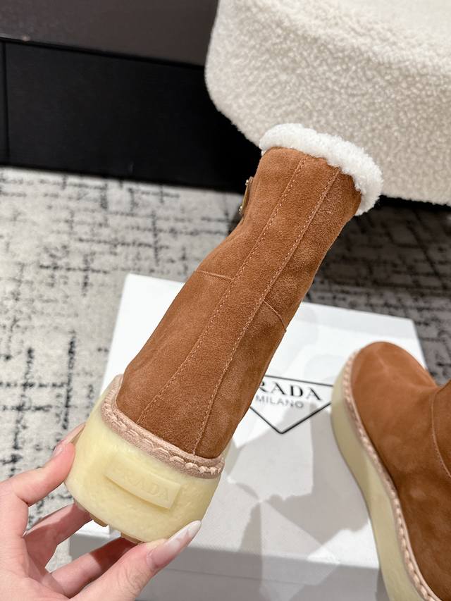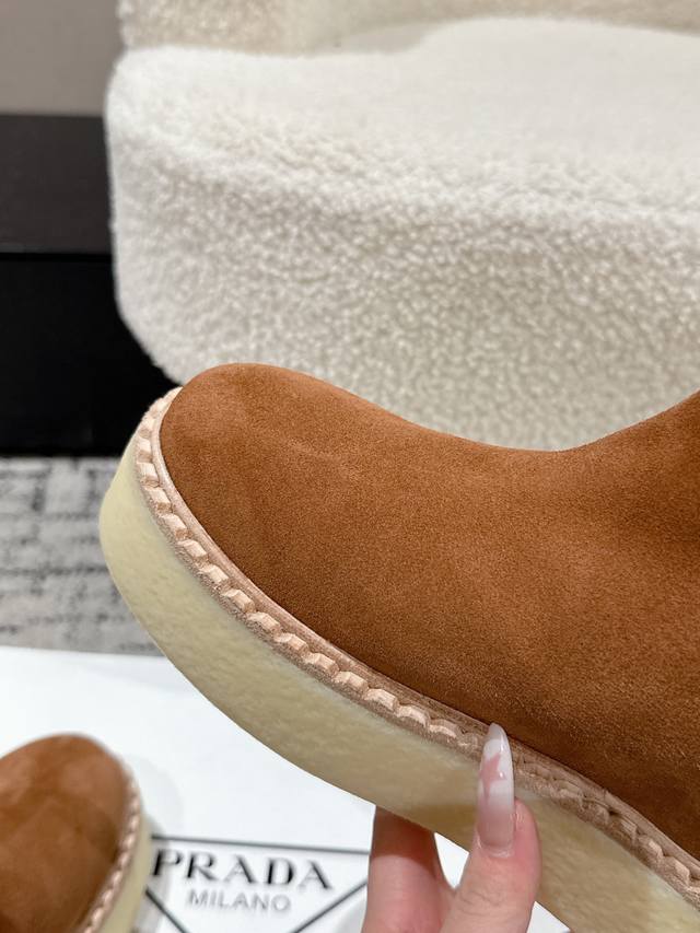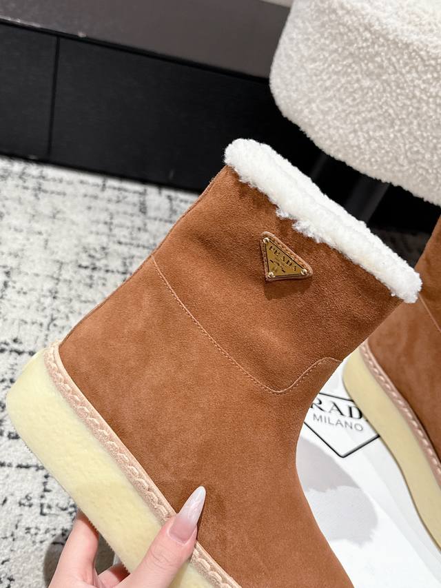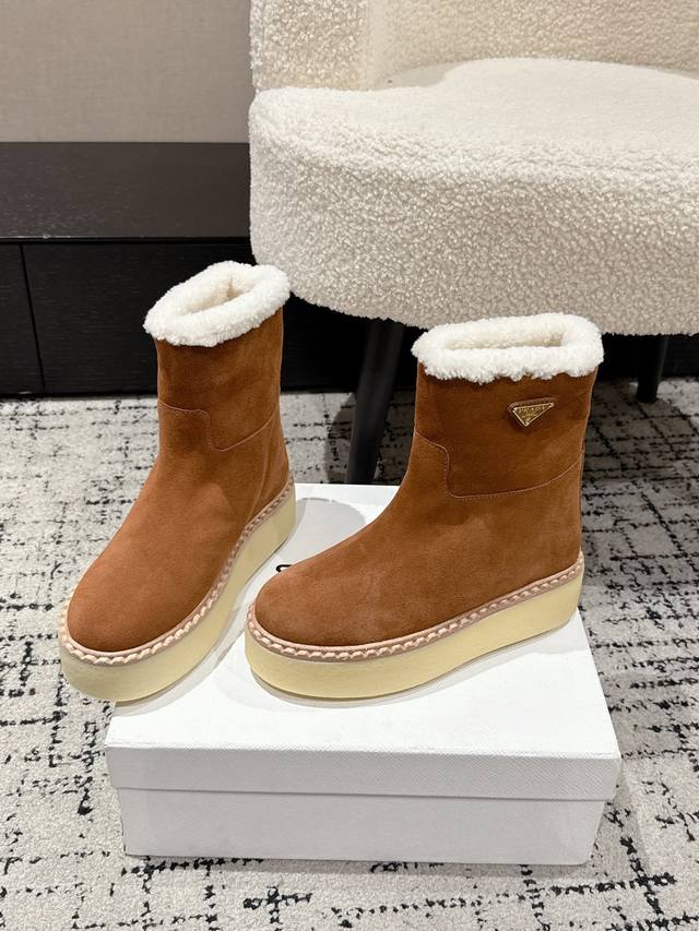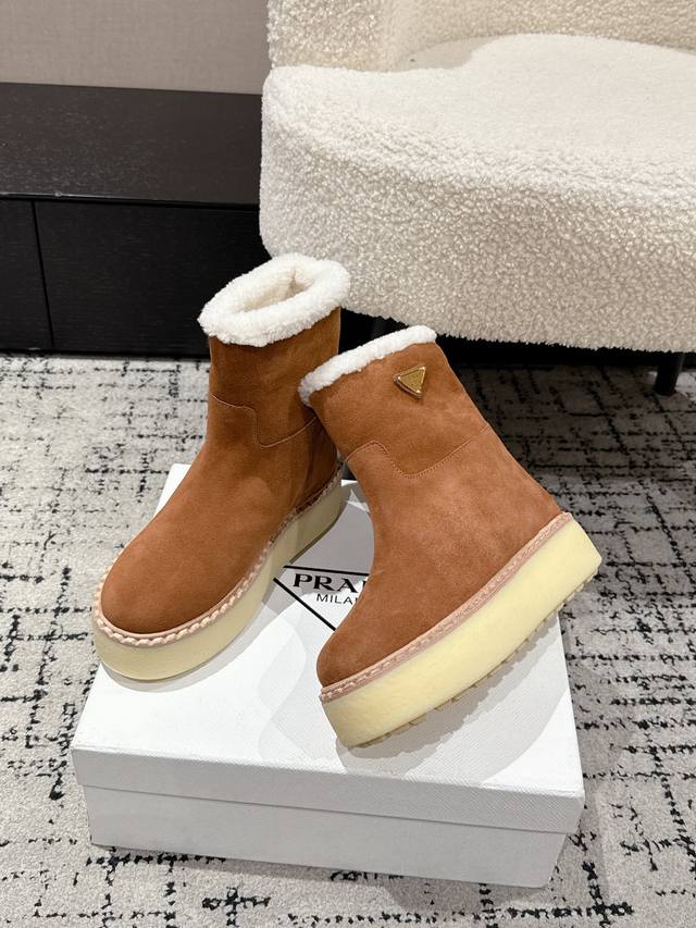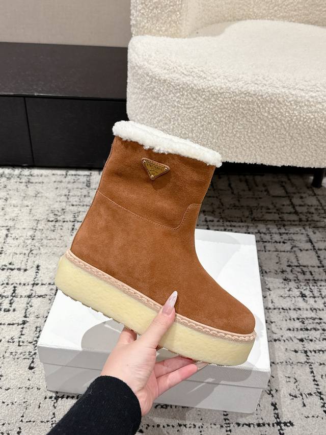 Retail Item DDD Prada 25 Latest Thick-Soled Snow Boots DDD These snow boots continue the timeless silhouette, a new classic piece crafted from exquisite suede, enhancing their style. Lightweight and featuring a triangular buckle logo and a 5cm thick sole, they are suitable for all seasons and can be paired with various casual looks. In an era saturated with eye-catching styles, these boots are the most enduring companions, gradually winning hearts. DDD Material: Imported suede DDD Lining: Australian imported lamb wool DDD Outsole: TPU non-slip outsole + genuine leather welt DDD Sole thickness: 5cm DDD Size: #35-41 40 41 Made to order, no returns or exchanges DDD