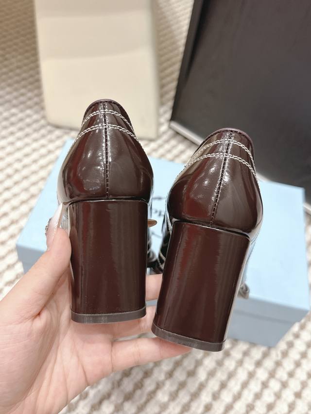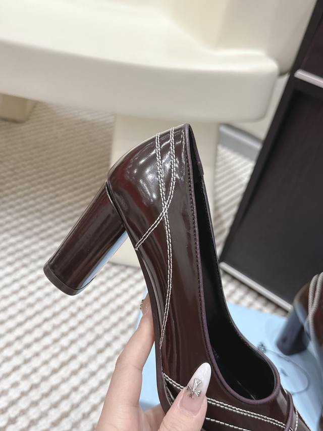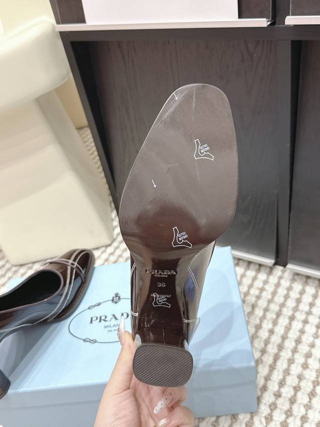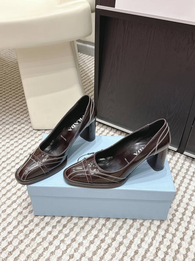 Retail-grade Prada Vintage Bowling Series High Heels, Runway Style, Retro Stitching High Heels, Open Back Sandals DDD Square Toe, Unique Heel, Contrasting Colors and High-Definition Stitching Outline, Brown, Black, and Gray Colors with Matte Leather, High-End Feel, Unique Chunky Heel, Effortless Italian Modern Style. These shoes exude confidence and a modern Italian style, blending minimalism and avant-garde aesthetics into everyday wear. DDD Sole: Italian Genuine Leather Outsole DDD Heel Height: 7cm DDD Sizes: 35-39, 40, 41 Made to order, no returns or exchanges DDD