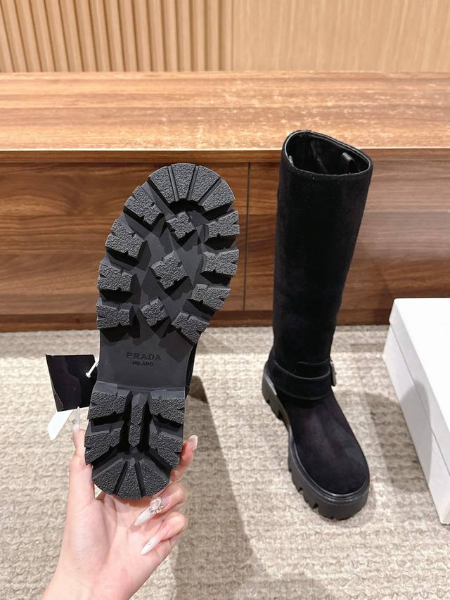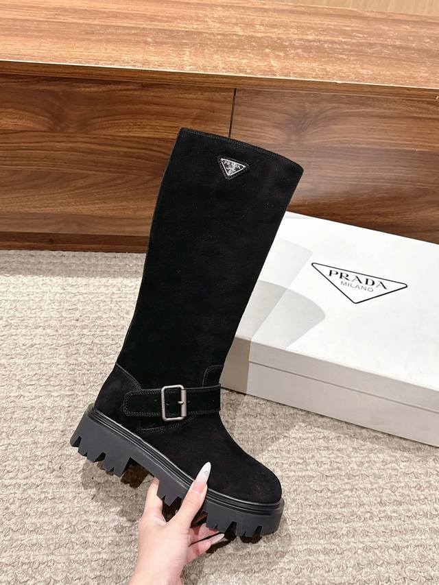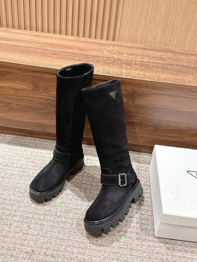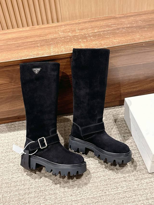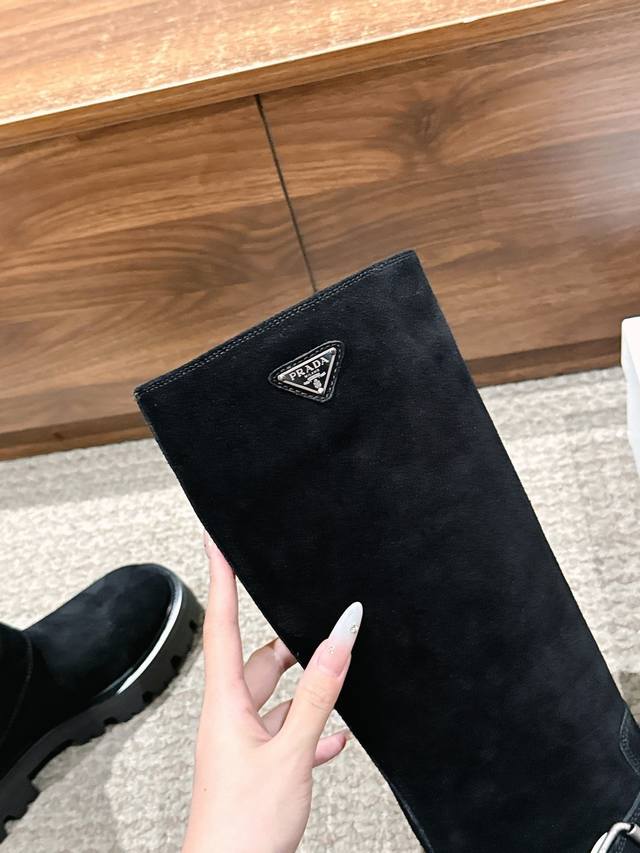 Suede Prada Classic Triangle Logo Slip-on Boots DDD A must-have for winter, definitely this year's hottest item!! Super stylish! Prada boots are truly amazing! They look sophisticated and make your legs look slimmer, perfectly capturing your elegance DDD Upper: Imported cowhide and suede DDD Lining: Imported cowhide DDD Outsole: TPU outsole DDD Size: 35-41 40 41 Made to order, no returns or exchanges DDD