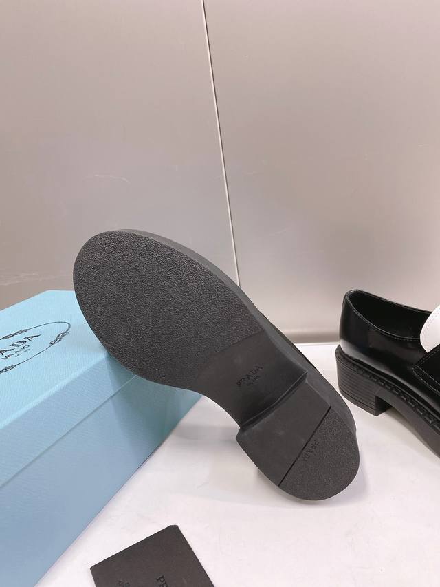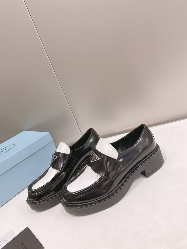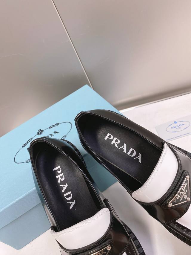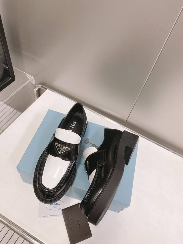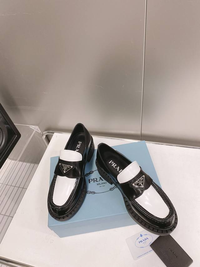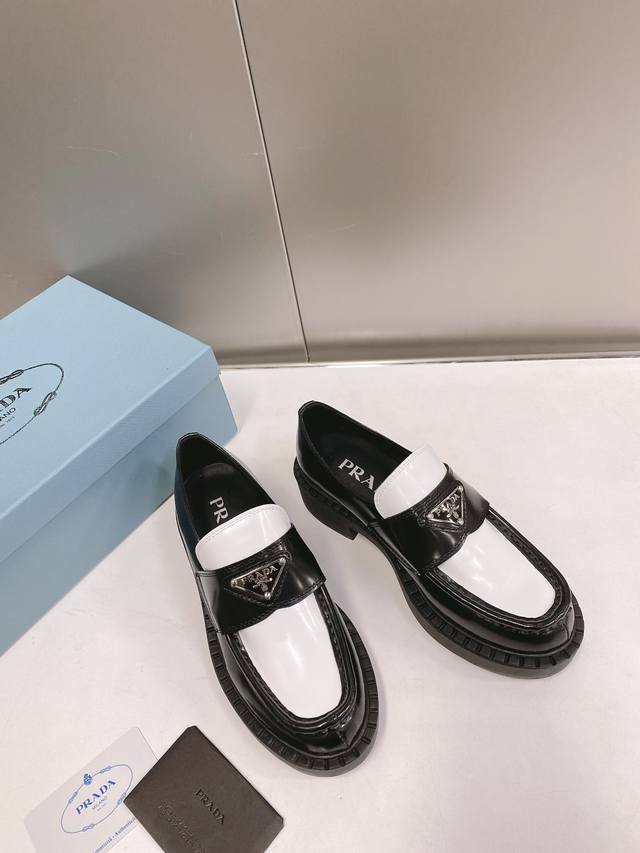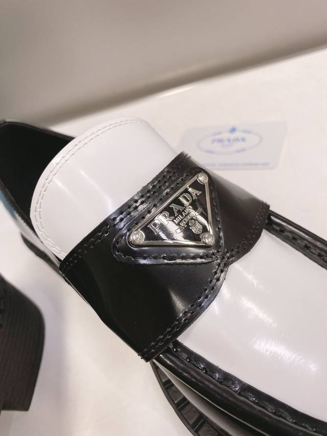 This color is only available for order. Prada SS22 Panda Triangle Logo Loafers. The black and white color scheme is very eye-catching and looks great for spring and summer. Made of premium calfskin leather with a soft rubber sole. The sole has a certain thickness, making your legs look super long! Absolutely perfect. Size 35-40.