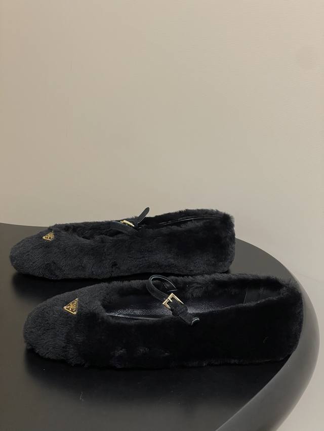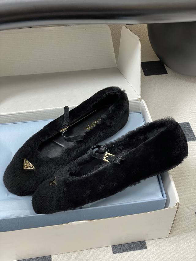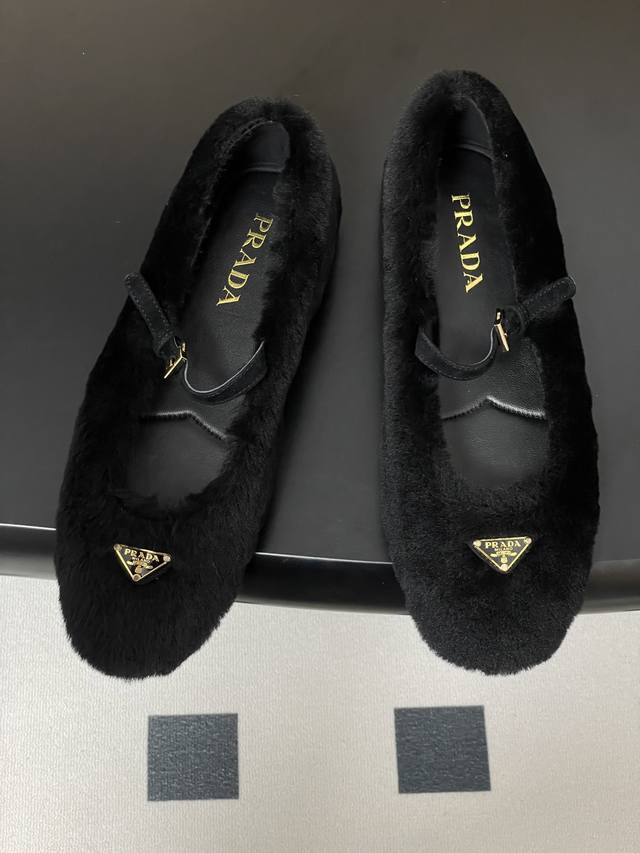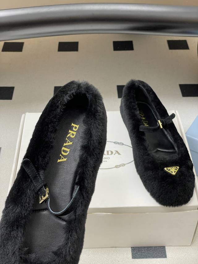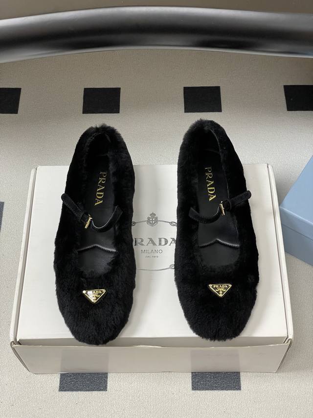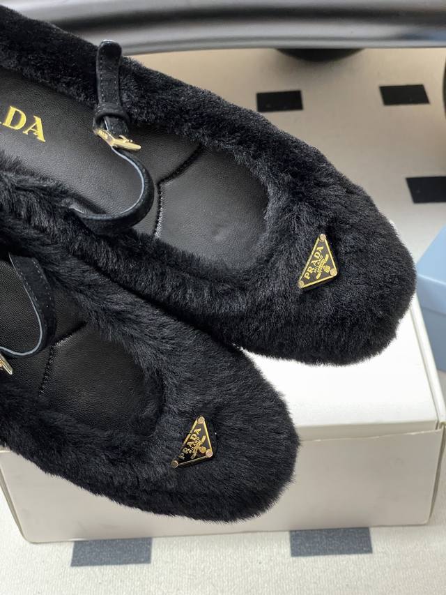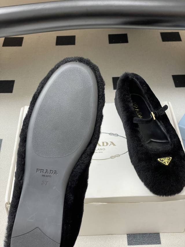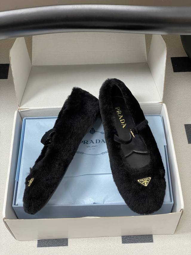 Top quality, comes with a flight case. 25Ss Early Fall new Prada wool ballet flats, furry Mary Janes. These wool ballet flats exude elegance with a tapered silhouette. Featuring a round toe, classic lines with elegant details, and an enameled triangular metal logo. The upper is embellished with a strap and an engraved logo metal buckle. Enameled triangular metal logo. 5mm one-piece sole with heat-embossed logo. Upper: Custom wool. Lining: Sheepskin. Heel height: Flat. Sole: Original molded rubber outsole. Sizes: 35-39, 40, 41. Made to order, no returns or exchanges.