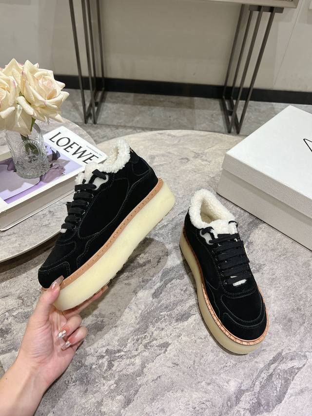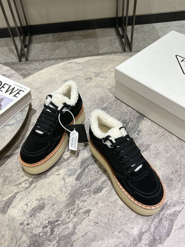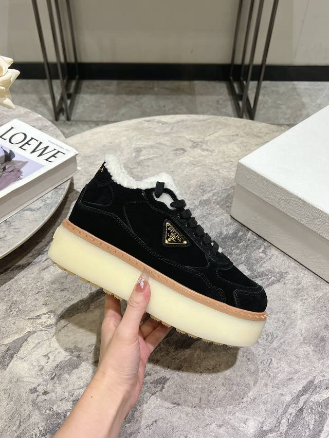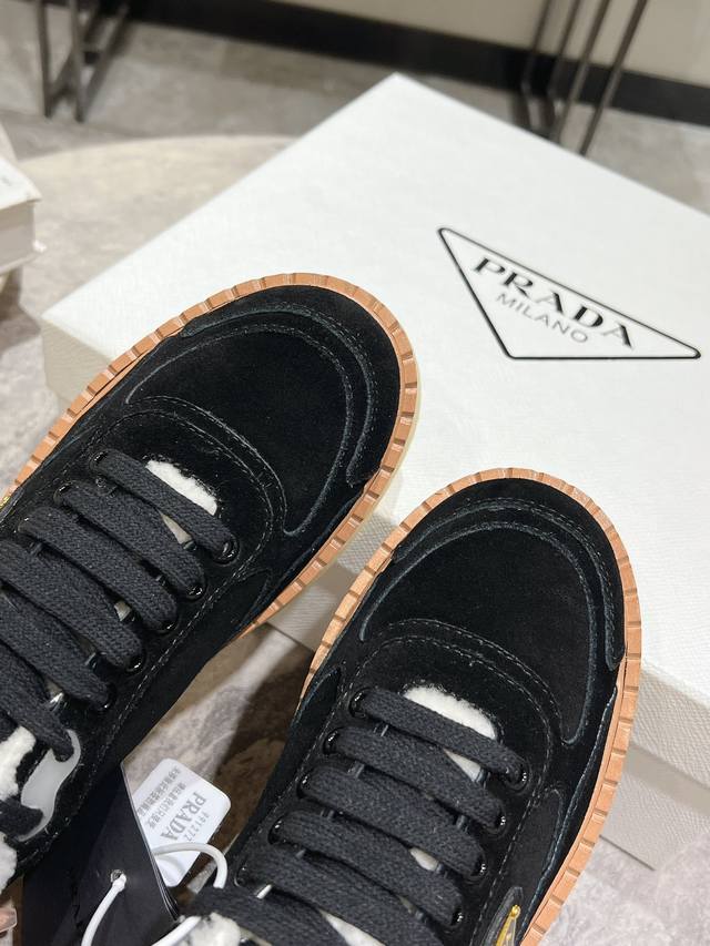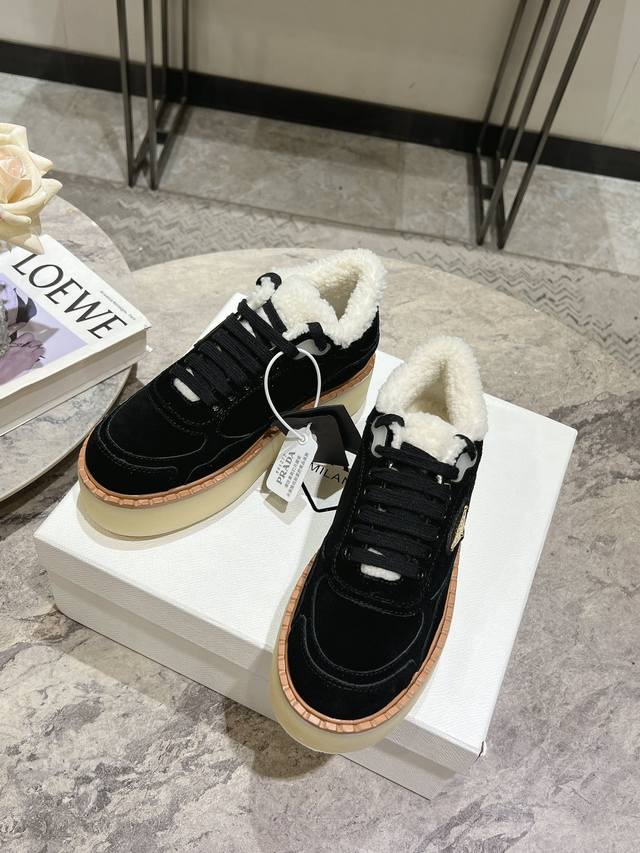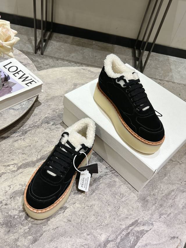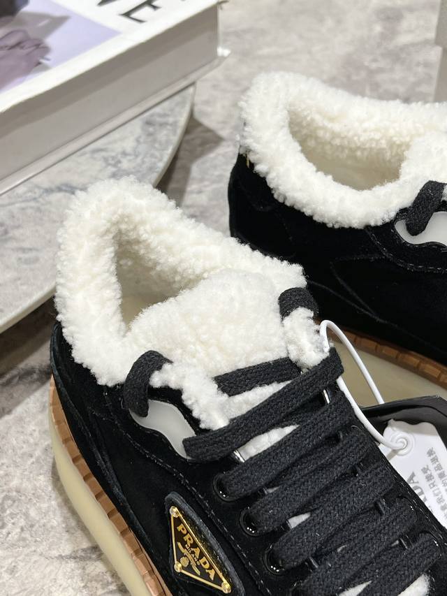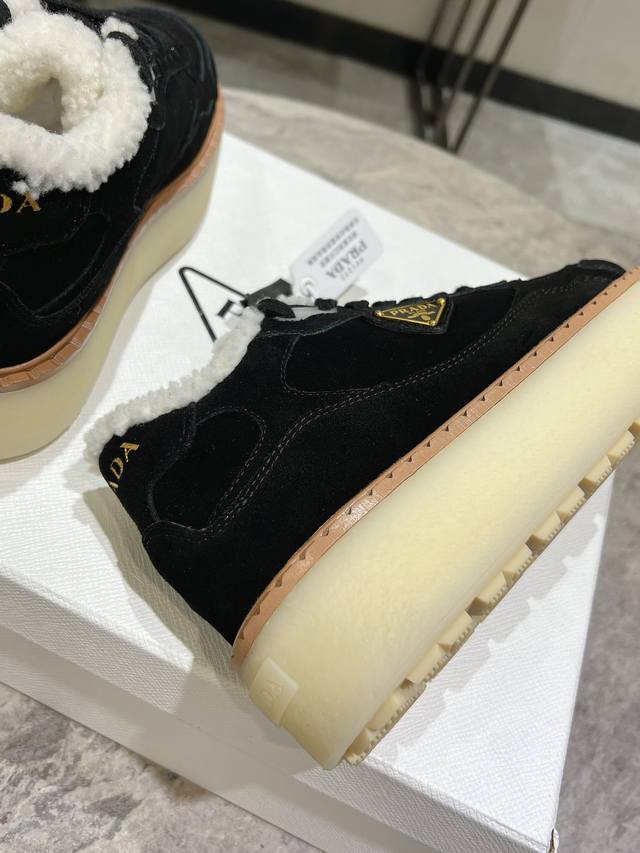Top Quality Prada Fw25 New Arrival ~ Prada 2025 Autumn/Winter Suede Lambswool Sneakers. Thick design easily adds 5cm in height. The gentle texture of suede, paired with a shearling lining, makes these a must-have for autumn and winter